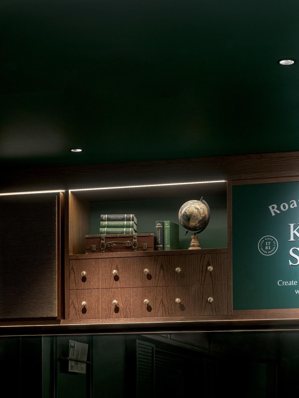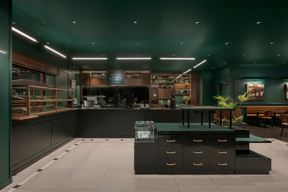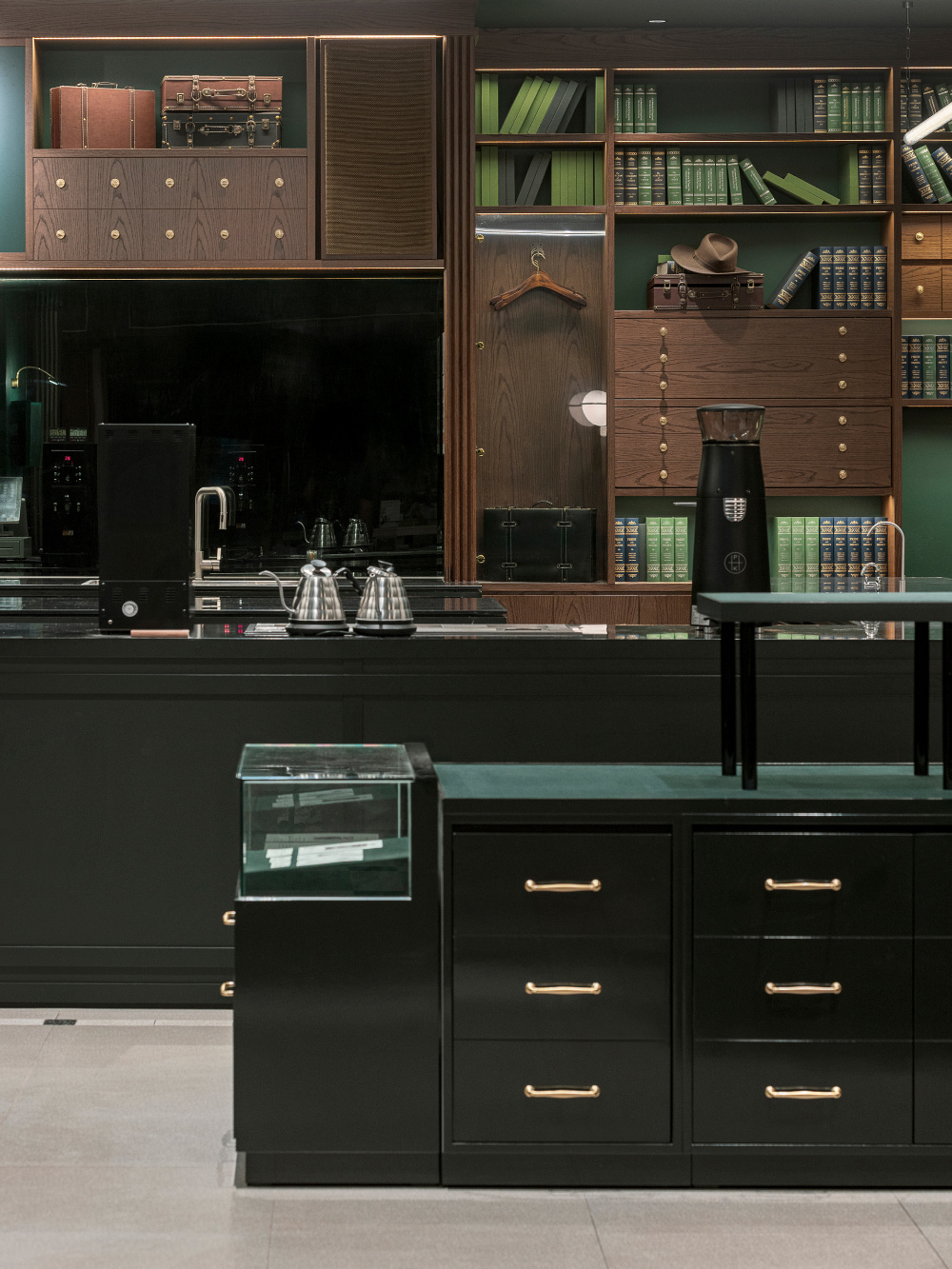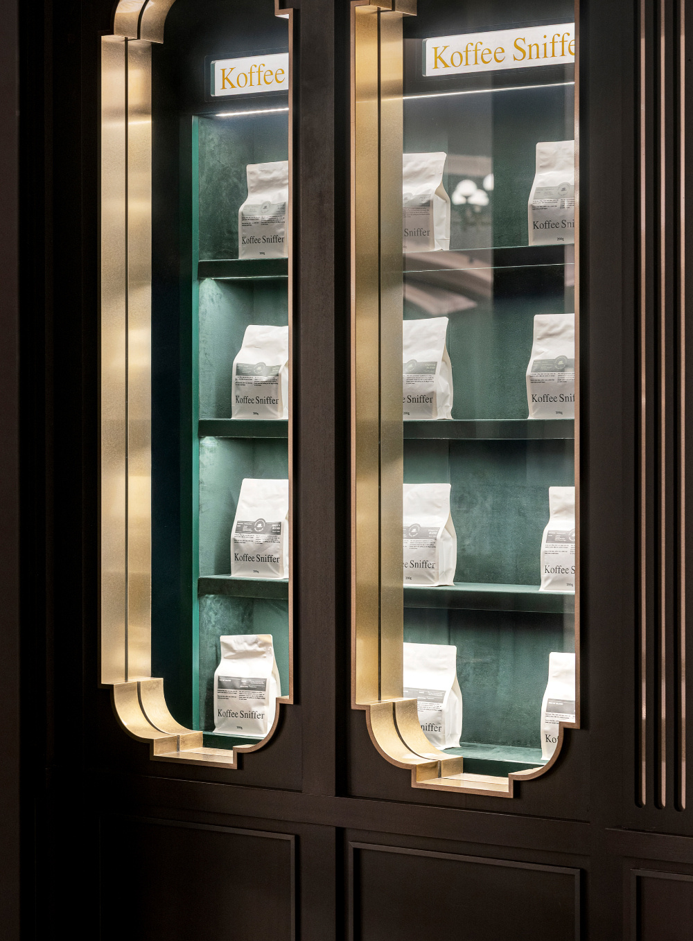 Koffee Sniffer 的核心材质语言,是胡桃木、墨绿涂料与金属的三重协奏,每一种材质都在 “复古质感” 与 “当代功能” 之间找到了平衡。胡桃木是空间的 “底色”:从吧台柜体到书架隔断,深棕木质的自然纹理被完整保留,抽屉上的黄铜拉手、书架上的复古皮箱摆件,都在强化 “旧时光” 的叙事;但这些木质构件并非纯粹的装饰 —— 吧台的开放式柜体兼顾了咖啡器具的展示与收纳,书架的抽屉则可存放咖啡豆,让复古美学与实用功能合二为一。墨绿墙面是空间的 “情绪调色盘”:饱和度偏低的墨绿既复刻了复古空间的优雅,又通过哑光质感避免了沉闷,与胡桃木的暖棕形成 “冷与暖” 的质感对比;墙面并非单一色块,而是通过金属线条分割出层次,让光影在不同区域呈现出丰富的变化。金属元素是空间的 “点睛之笔”:黄铜拉手、金属灯具、玻璃展柜的边框,以克制的方式融入空间,既提升了精致度,又不会抢走材质本身的风头 —— 比如操作区的玻璃展柜,金属框架与玻璃的组合,让咖啡豆的展示如同艺术品陈列,呼应了 “咖啡嗅觉” 的品牌内核。