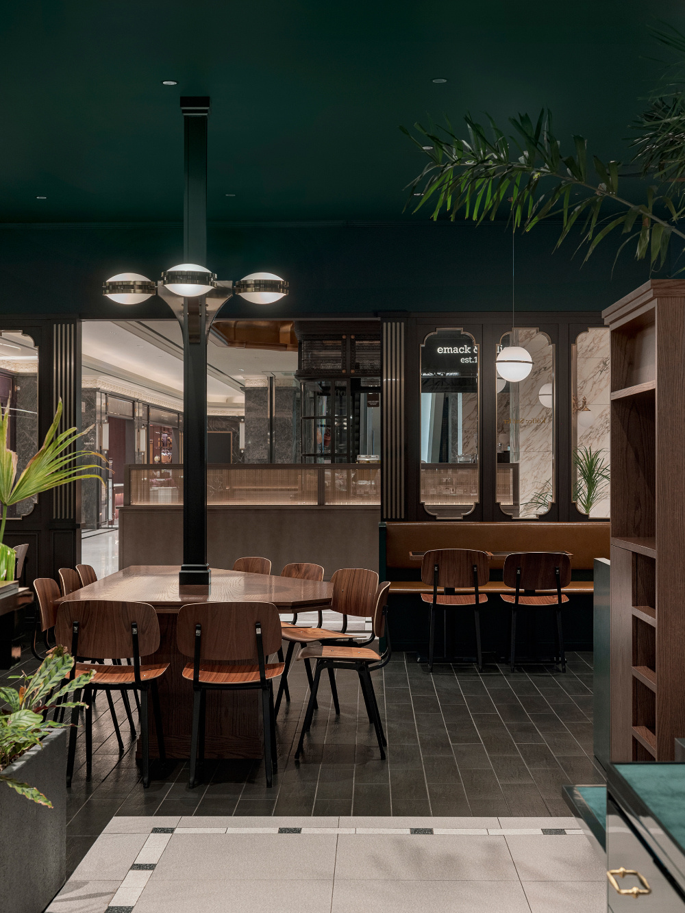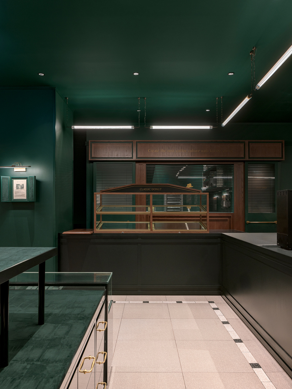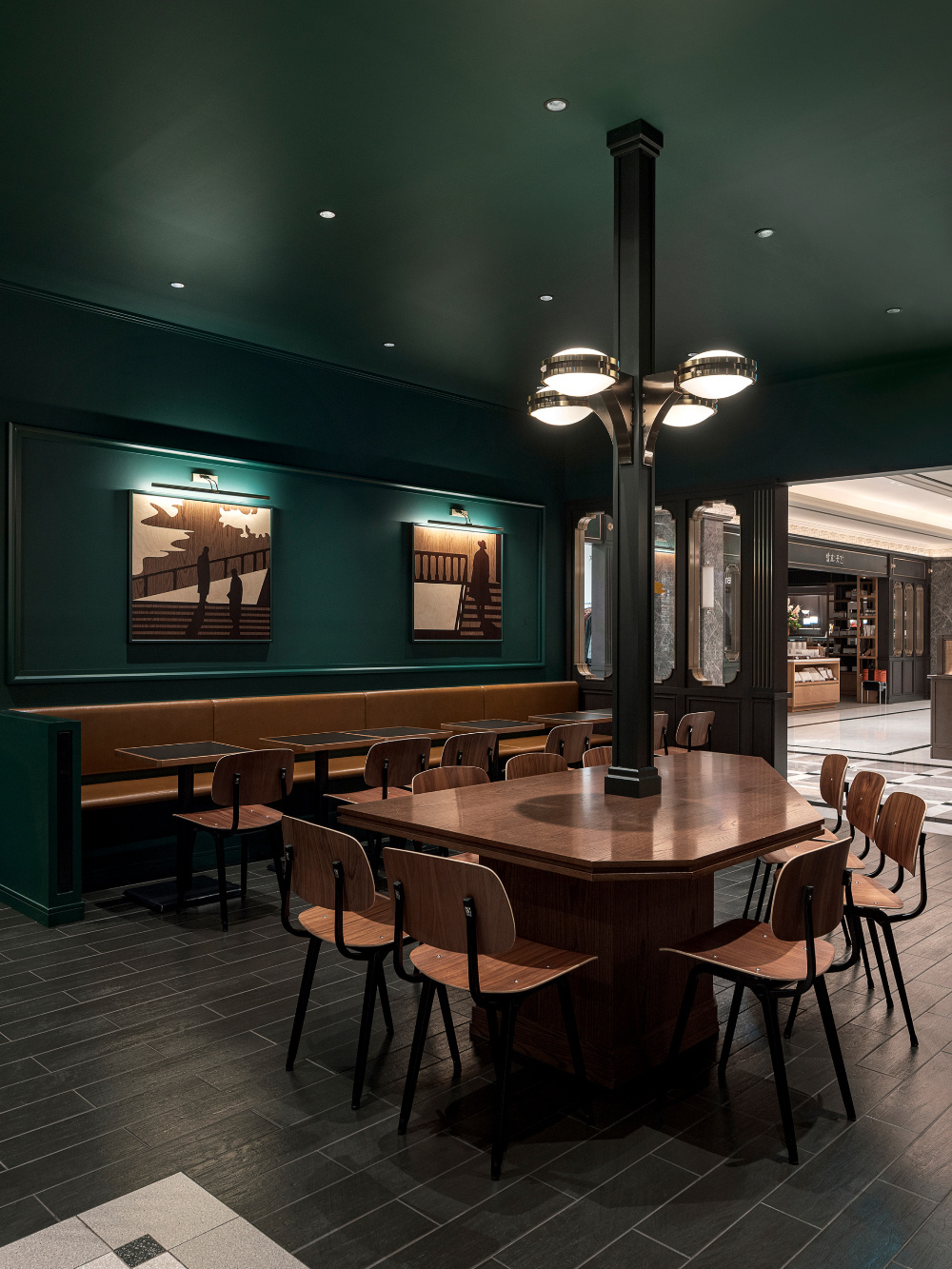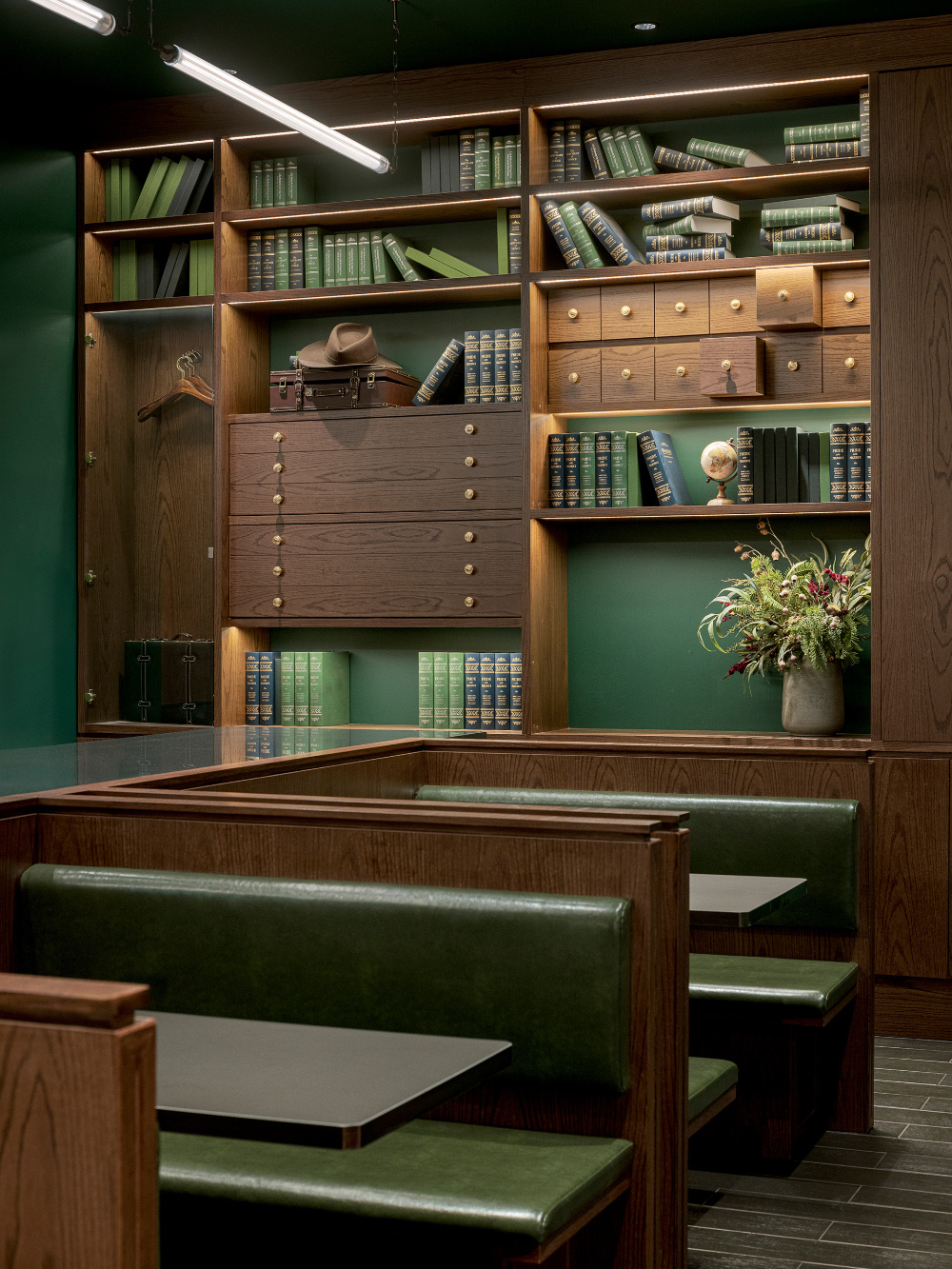 Koffee Sniffer 的核心材质语言,是胡桃木、墨绿涂料与金属的三重协奏,每一种材质都在 “复古质感” 与 “当代功能” 之间找到了平衡。胡桃木是空间的 “底色”:从吧台柜体到书架隔断,深棕木质的自然纹理被完整保留,抽屉上的黄铜拉手、书架上的复古皮箱摆件,都在强化 “旧时光” 的叙事;但这些木质构件并非纯粹的装饰 —— 吧台的开放式柜体兼顾了咖啡器具的展示与收纳,书架的抽屉则可存放咖啡豆,让复古美学与实用功能合二为一。墨绿墙面是空间的 “情绪调色盘”:饱和度偏低的墨绿既复刻了复古空间的优雅,又通过哑光质感避免了沉闷,与胡桃木的暖棕形成 “冷与暖” 的质感对比;墙面并非单一色块,而是通过金属线条分割出层次,让光影在不同区域呈现出丰富的变化。金属元素是空间的 “点睛之笔”:黄铜拉手、金属灯具、玻璃展柜的边框,以克制的方式融入空间,既提升了精致度,又不会抢走材质本身的风头 —— 比如操作区的玻璃展柜,金属框架与玻璃的组合,让咖啡豆的展示如同艺术品陈列,呼应了 “咖啡嗅觉” 的品牌内核。