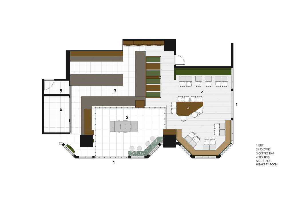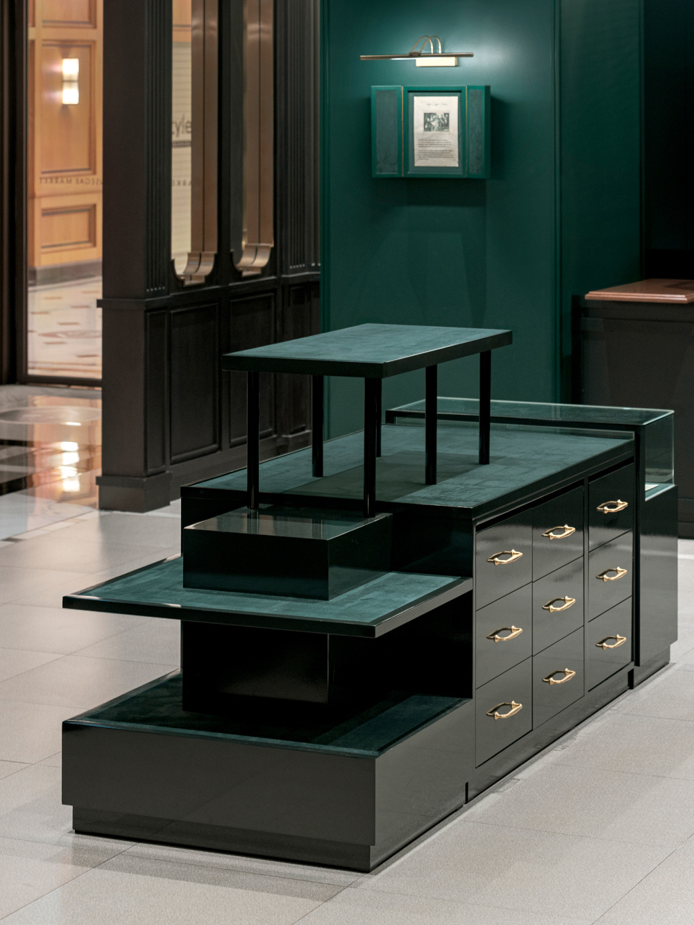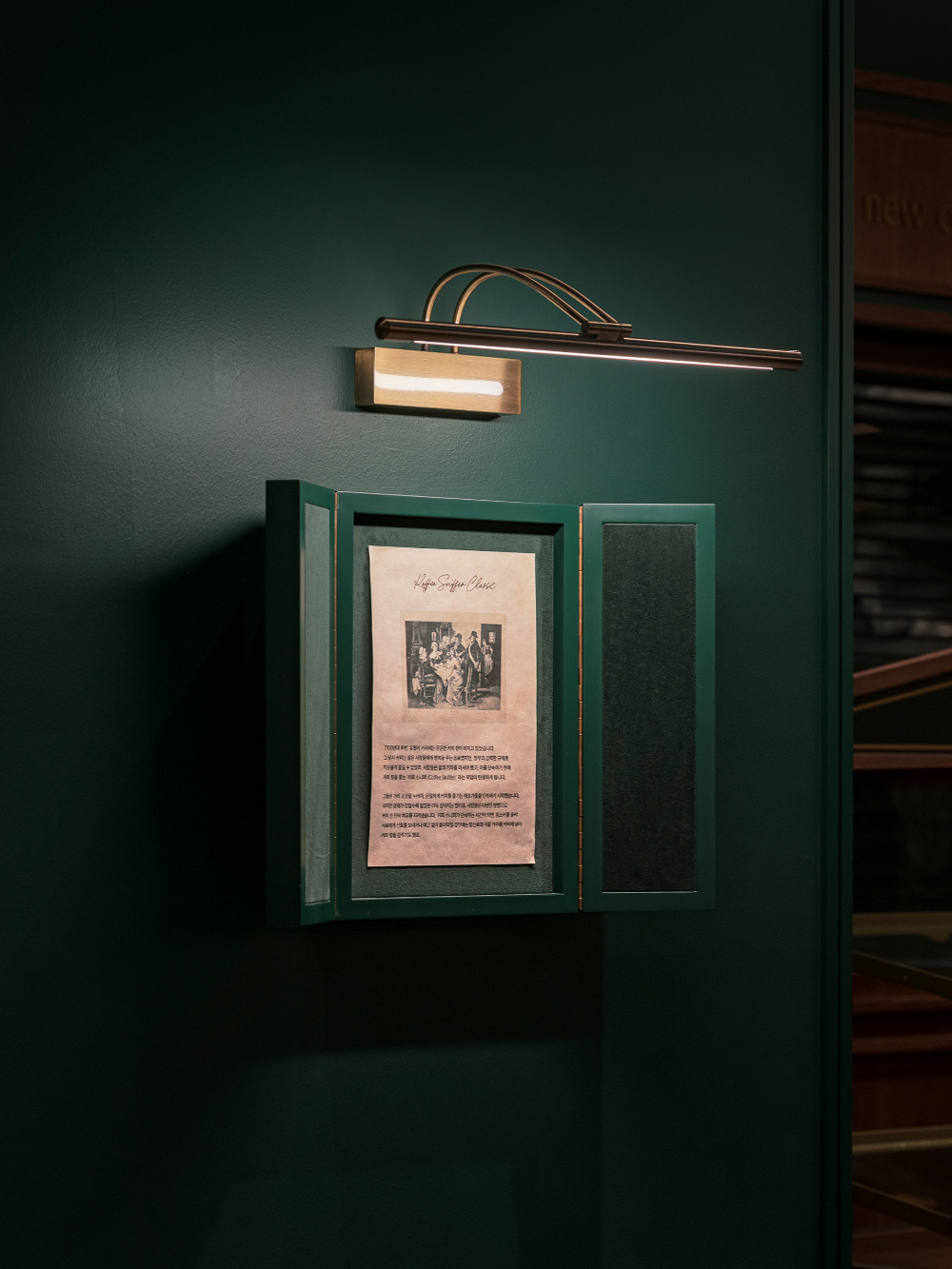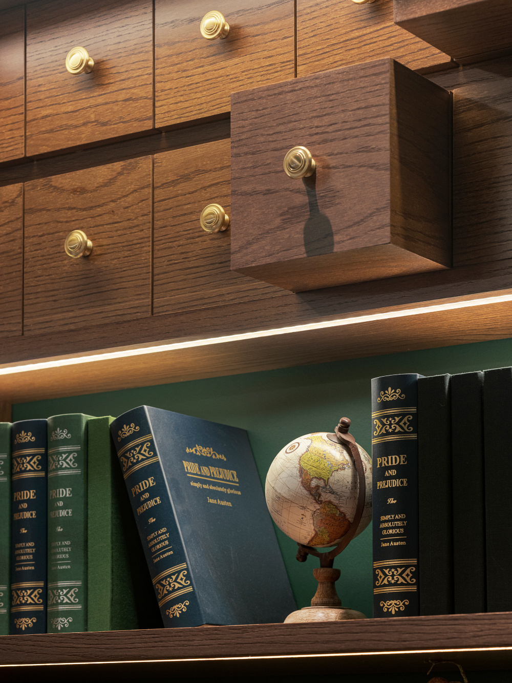 Koffee Sniffer 的核心材质语言,是胡桃木、墨绿涂料与金属的三重协奏,每一种材质都在 “复古质感” 与 “当代功能” 之间找到了平衡。胡桃木是空间的 “底色”:从吧台柜体到书架隔断,深棕木质的自然纹理被完整保留,抽屉上的黄铜拉手、书架上的复古皮箱摆件,都在强化 “旧时光” 的叙事;但这些木质构件并非纯粹的装饰 —— 吧台的开放式柜体兼顾了咖啡器具的展示与收纳,书架的抽屉则可存放咖啡豆,让复古美学与实用功能合二为一。墨绿墙面是空间的 “情绪调色盘”:饱和度偏低的墨绿既复刻了复古空间的优雅,又通过哑光质感避免了沉闷,与胡桃木的暖棕形成 “冷与暖” 的质感对比;墙面并非单一色块,而是通过金属线条分割出层次,让光影在不同区域呈现出丰富的变化。金属元素是空间的 “点睛之笔”:黄铜拉手、金属灯具、玻璃展柜的边框,以克制的方式融入空间,既提升了精致度,又不会抢走材质本身的风头 —— 比如操作区的玻璃展柜,金属框架与玻璃的组合,让咖啡豆的展示如同艺术品陈列,呼应了 “咖啡嗅觉” 的品牌内核。