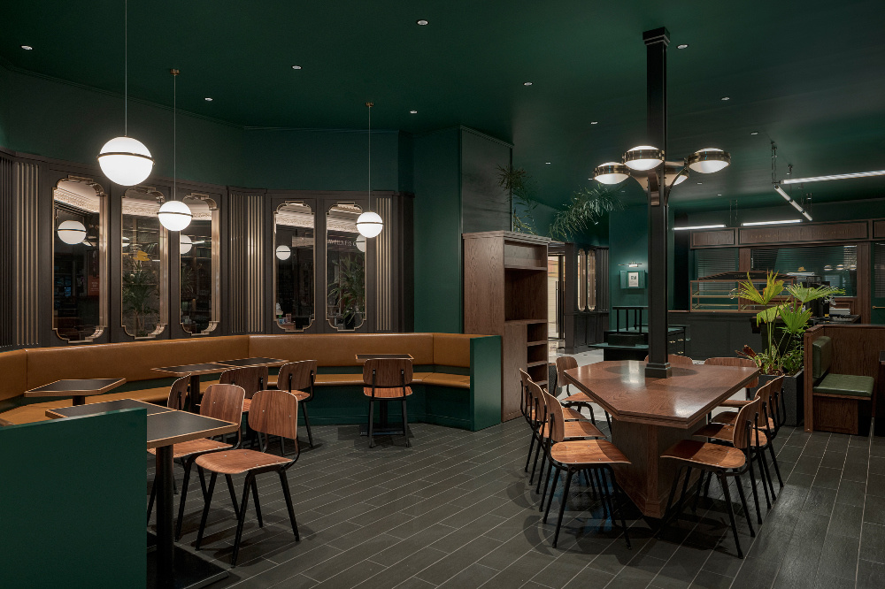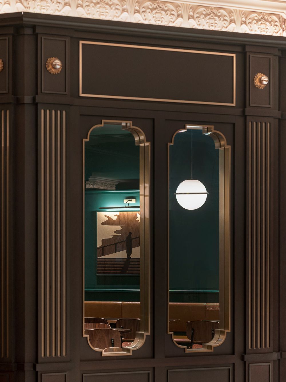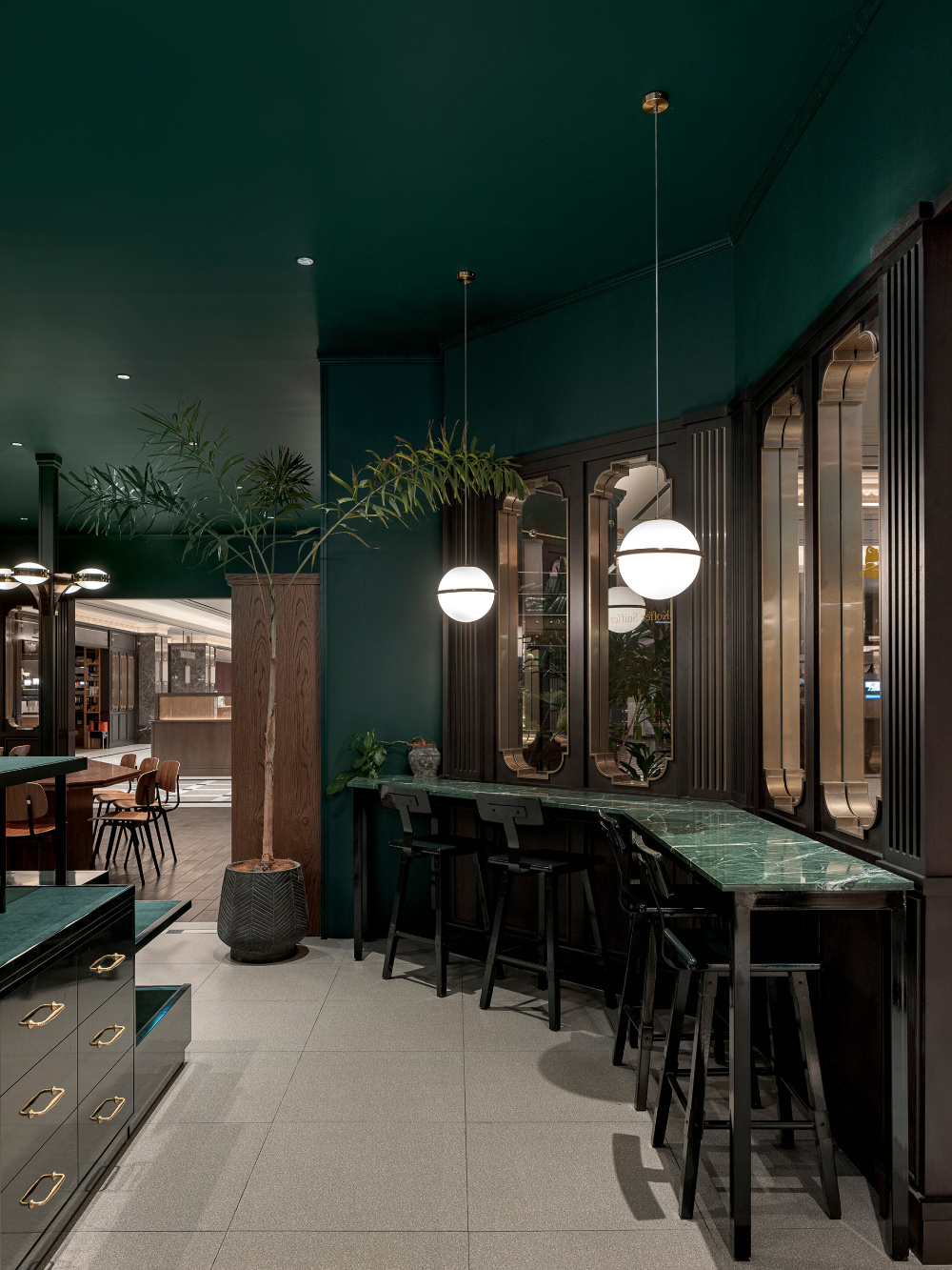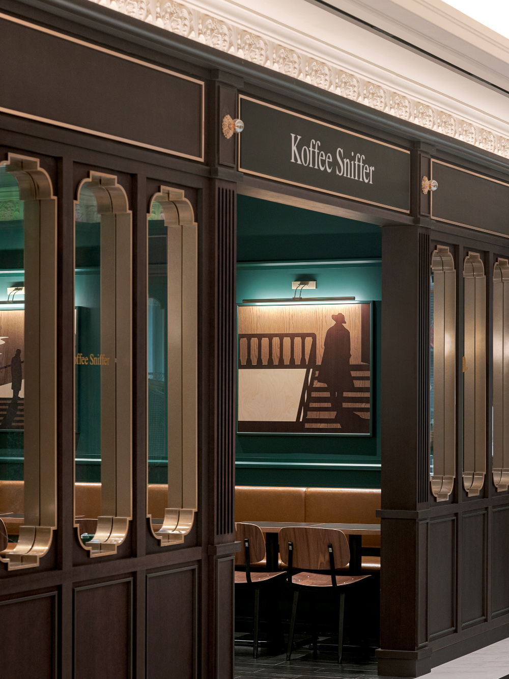 推开 Koffee Sniffer 的入口,首先迎接人的是一组深色木质隔断:雕花金属饰钉点缀在胡桃木面板上,拱形玻璃如同老电影的画框,将内部的墨绿空间半遮半掩。这种 “欲扬先抑” 的设计,让从公共区域到咖啡空间的过渡充满仪式感 —— 外界的喧嚣被隔断过滤,只留下木质的温润与玻璃的通透,暗示着一场 “沉浸式咖啡体验” 的开启。隔断的细节藏着设计巧思:竖向凹槽木质立柱与金属收边的组合,既复刻了 20 世纪中期复古空间的精致,又通过玻璃的通透避免了厚重感;顶部的浮雕装饰与天花的线条呼应,让入口成为空间的 “序章”,为后续的体验铺垫了情绪基调。