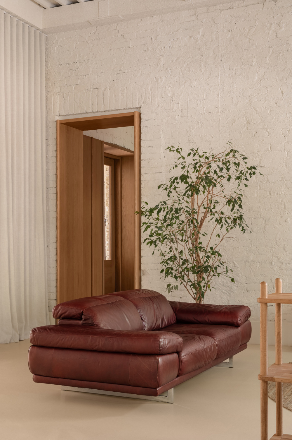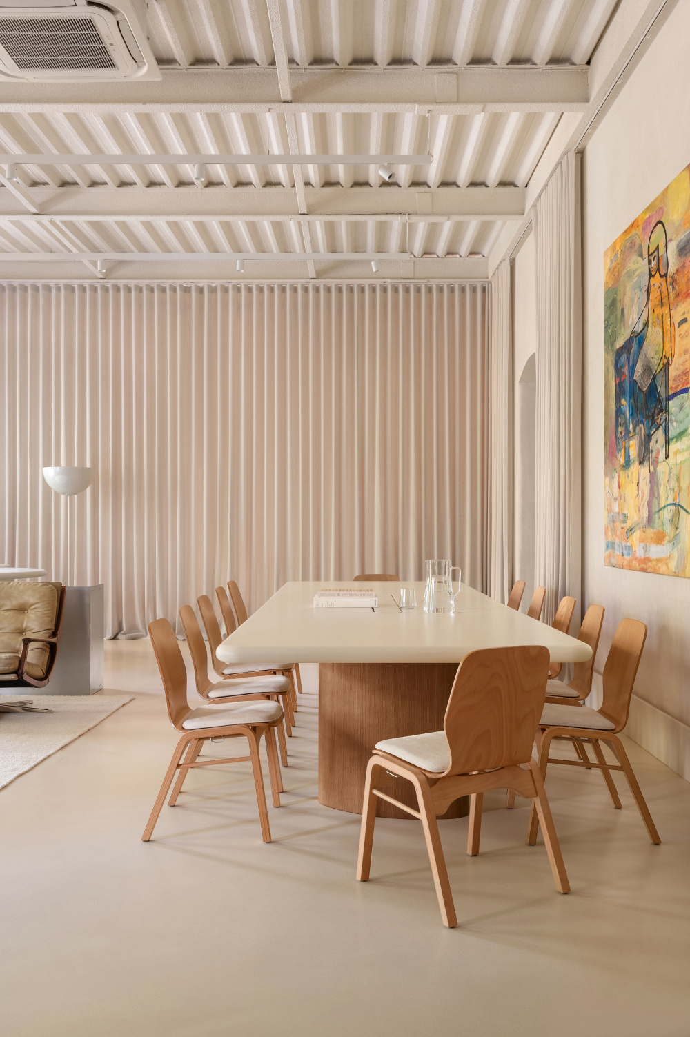 空间的每一处细节,都是Banda企业价值观的具象化表达。ater.architects从欧洲各地搜罗的复古家具,成为传递“有人居住的生活感”的核心载体:等候区的红色复古Dietiker扶手椅、公共长桌搭配的20世纪80年代弯曲胶合板椅、休息区的Soloform皮质座椅,这些带着时光痕迹的单品,让空间摆脱了商业办公的冰冷,传递出“开放包容”的气质。艺术作品的介入则为空间注入了创意灵魂:当代艺术家达尼克·曼若斯的稚拙风格画作、谢尔盖·德卡柳克的大型视觉核心画作、马克西姆·扎布罗德斯基的诙谐作品,既呼应了企业“创意生成”的核心业务,又以多元风格诠释了“尊重个性”的理念。