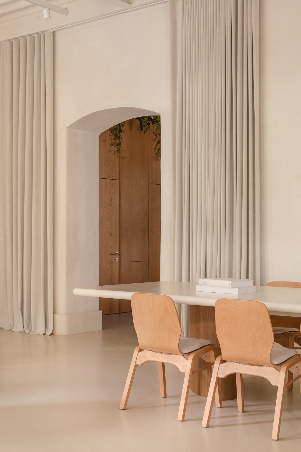 “不该像传统办公室,而更应是一间明亮开阔的公寓”,这一客户诉求成为空间布局的核心指引。ater.architects摒弃了封闭格子间的刻板模式,在保留历史建筑高挑天花板与开放格局的基础上,植入两个带夹层的立方体单元,既划分出功能分区,又维持了空间的通透感,构建出“公共-半私密-私密”的层次化体验。主大厅的公寓式布局打破了办公场景的边界:柔软的休息座椅组与定制公共长桌自由组合,既满足专注办公的需求,又为即兴协作提供了舒适载体;抬高的平台可随时转变为活动舞台,可移动桌椅与折叠椅则让空间能灵活适配会议、展览等多元场景,完美契合创意工作“灵活多变”的特质。