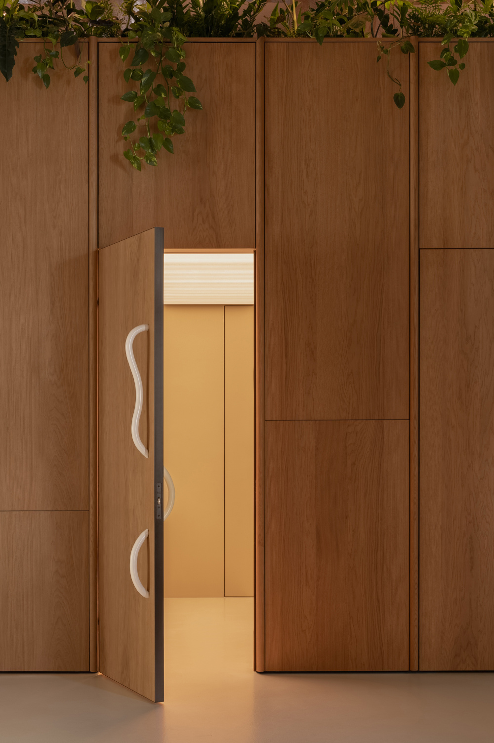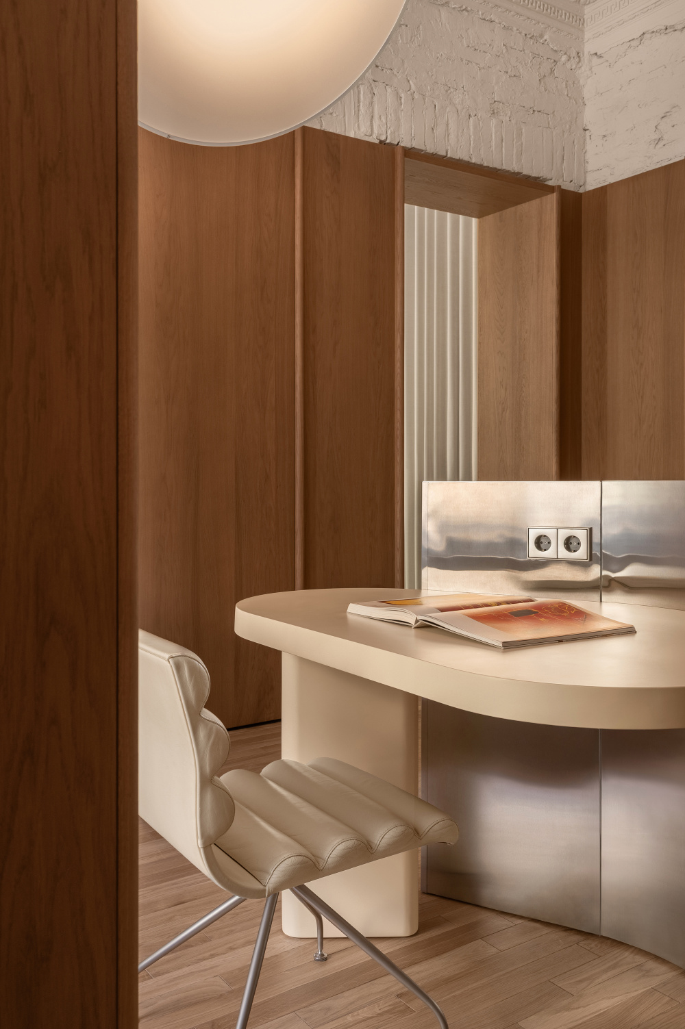 项目的设计起点,是对场地历史的敬畏与激活。办公室位于基辅历史中心雅罗斯拉维夫瓦尔街一栋百年建筑的二层,ater.architects并未割裂这份时光沉淀,而是以“修复优先、植入共生”的策略,让历史肌理成为空间的独特底色。拆除吊顶后,建筑原有的装饰线条与檐口浮雕重见天日,设计师对这些古典元素进行精心修复,使其成为空间的“隐性背景板”,与不锈钢接待台、极简Luceplan灯具形成鲜明的古今对话。这种对话并非表面拼接,而是深入空间体验的细节:入口处的经典木门装配着带有自然瑕疵的复古玻璃,刻意保留的“不完美”既呼应了企业的自嘲态度,也为历史感注入了温度;橡木墙板延续了建筑的典雅基调,同时巧妙隐藏储物空间,实现了历史气质与现代功能的共生;厨房窗户间留存的色卡痕迹,更是将设计过程的“未完成感”定格为空间记忆,成为尊重过程、崇尚真诚的企业理念的生动注脚。