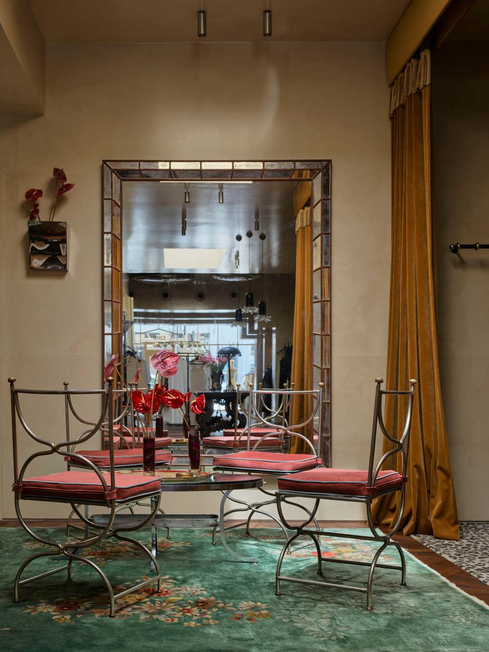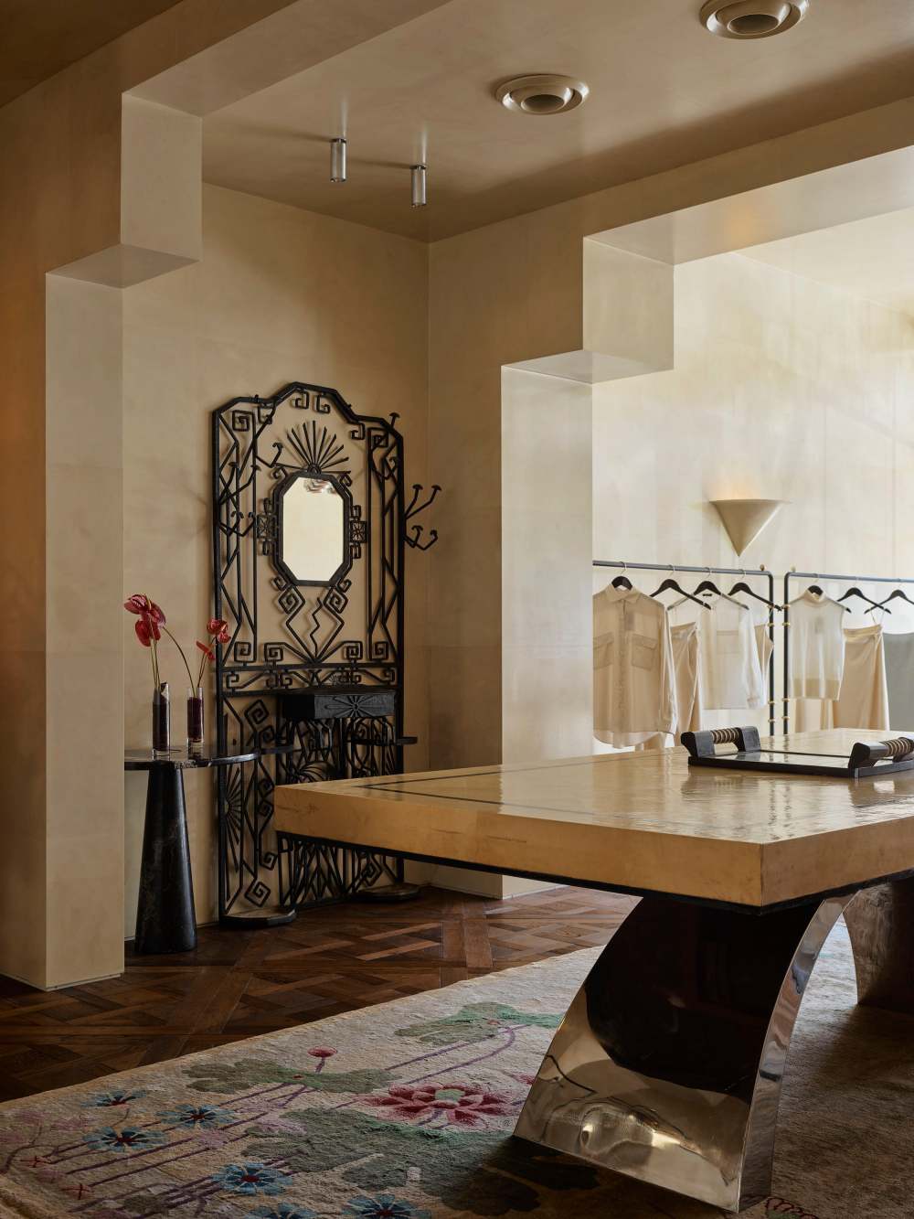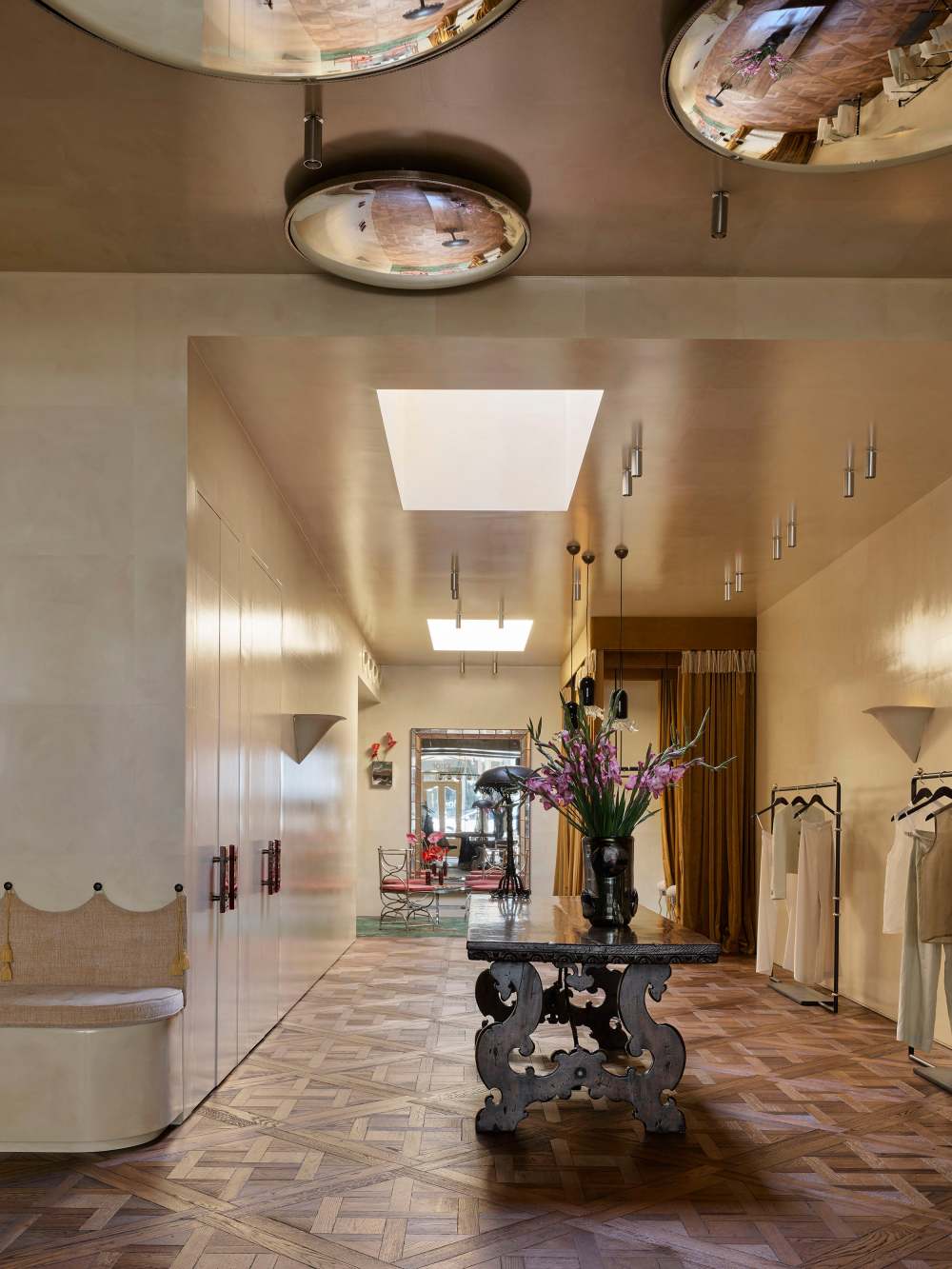 陈设是空间风格与品牌理念的直观表达。复古家具的摆放,如雕花实木桌、复古造型的沙发等,成为空间中的视觉焦点,传递出品牌对复古美学的推崇。而现代服饰的陈列,依托简约的金属衣架,既突出了服饰的时尚感,又与复古陈设形成对话,展现出品牌将复古元素与现代时尚融合的设计理念。此外,花艺、艺术摆件等软装的搭配,为空间增添了生机与艺术氛围,使整个零售空间不再是单纯的购物场所,更像是一个充满格调的艺术展示空间,提升了消费者的购物愉悦感与对品牌的认同感。