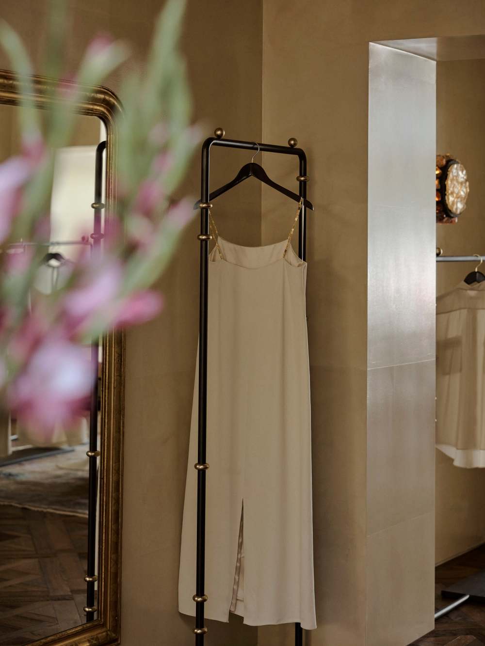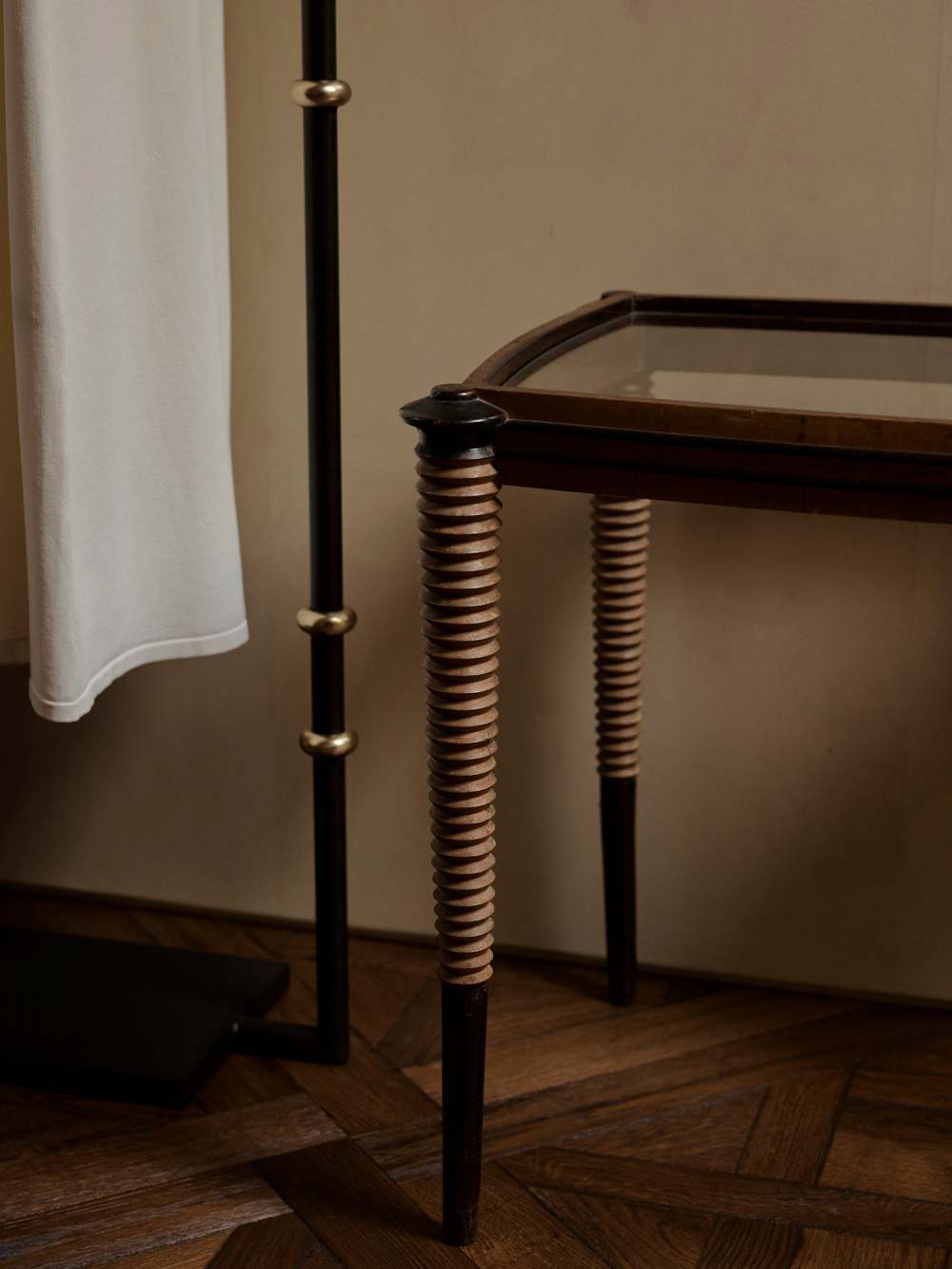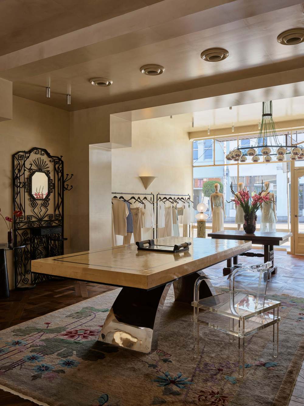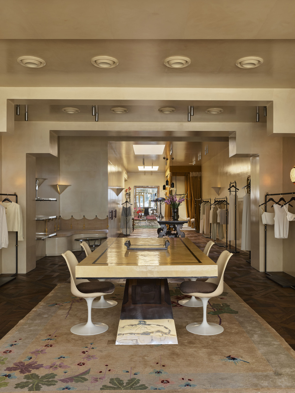 陈设是空间风格与品牌理念的直观表达。复古家具的摆放,如雕花实木桌、复古造型的沙发等,成为空间中的视觉焦点,传递出品牌对复古美学的推崇。而现代服饰的陈列,依托简约的金属衣架,既突出了服饰的时尚感,又与复古陈设形成对话,展现出品牌将复古元素与现代时尚融合的设计理念。此外,花艺、艺术摆件等软装的搭配,为空间增添了生机与艺术氛围,使整个零售空间不再是单纯的购物场所,更像是一个充满格调的艺术展示空间,提升了消费者的购物愉悦感与对品牌的认同感。