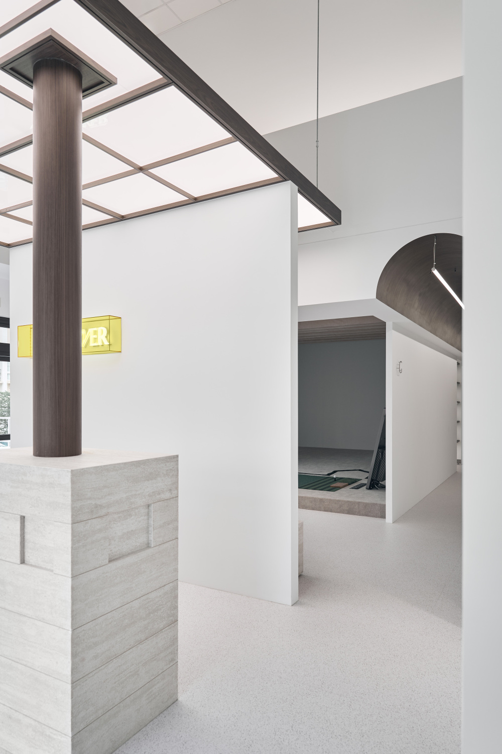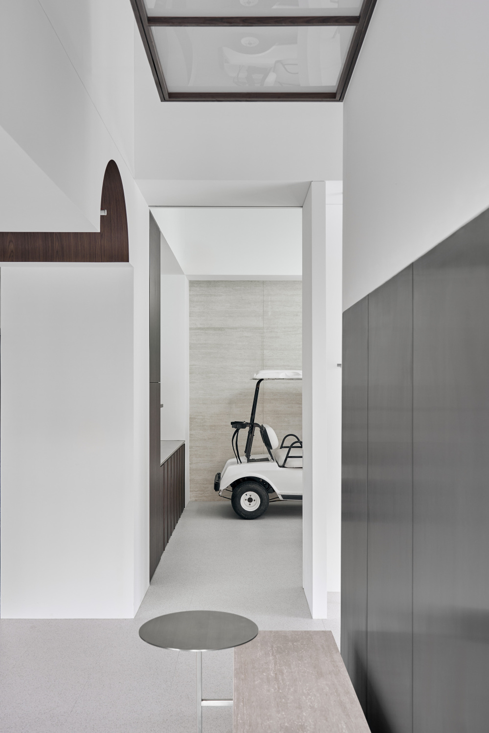 隐藏式门彻底打破 “硬隔断” 的束缚,实现空间的 “静默转换”。开启时,击球区、休息区、观赛区的光线与视野完全贯通,形成开放通透的运动场域,适配多人互动、赛事活动等场景;关闭时,门体与墙面材质融为一体,勾勒出沉稳精准的空间边界,为单人训练、专注练习提供私密安静的环境,让空间在 “开放与封闭” 之间自由切换。柔和的拱形天花板以 “曲线韵律” 规整了空间动线。它如同 “自然的路径指引”,引导访客从入口平缓过渡至各个击球区、休息区,即便空间功能分区清晰,也不会显得割裂。拱形的弧度既呼应了高尔夫球的 “飞行轨迹”,又柔化了空间的几何硬感,让动线在 “秩序中保持呼吸感”。