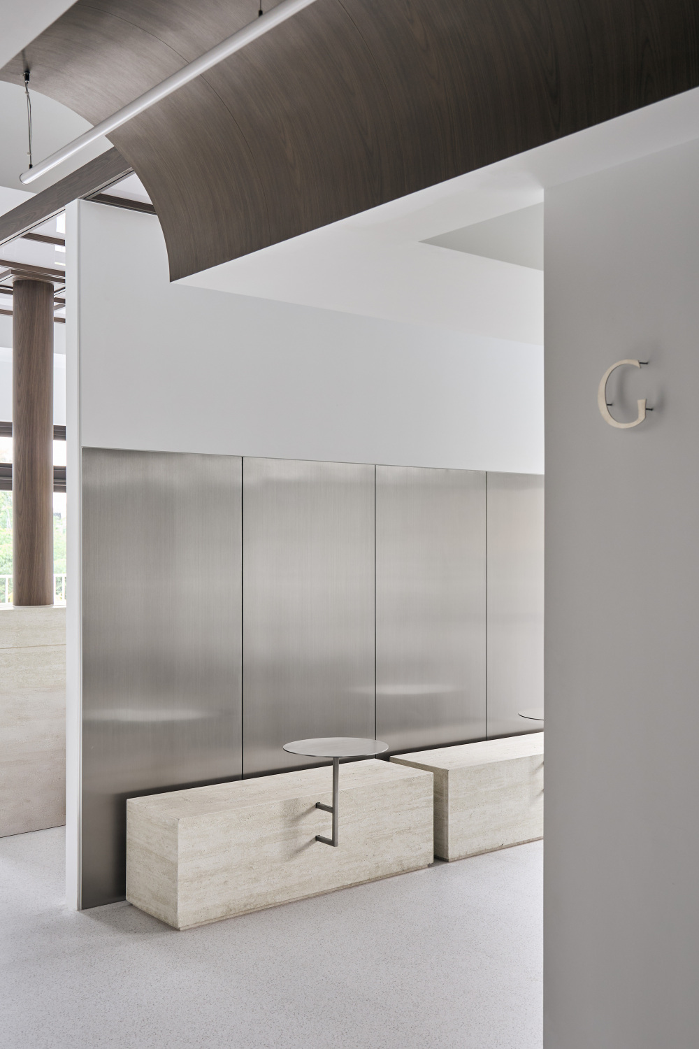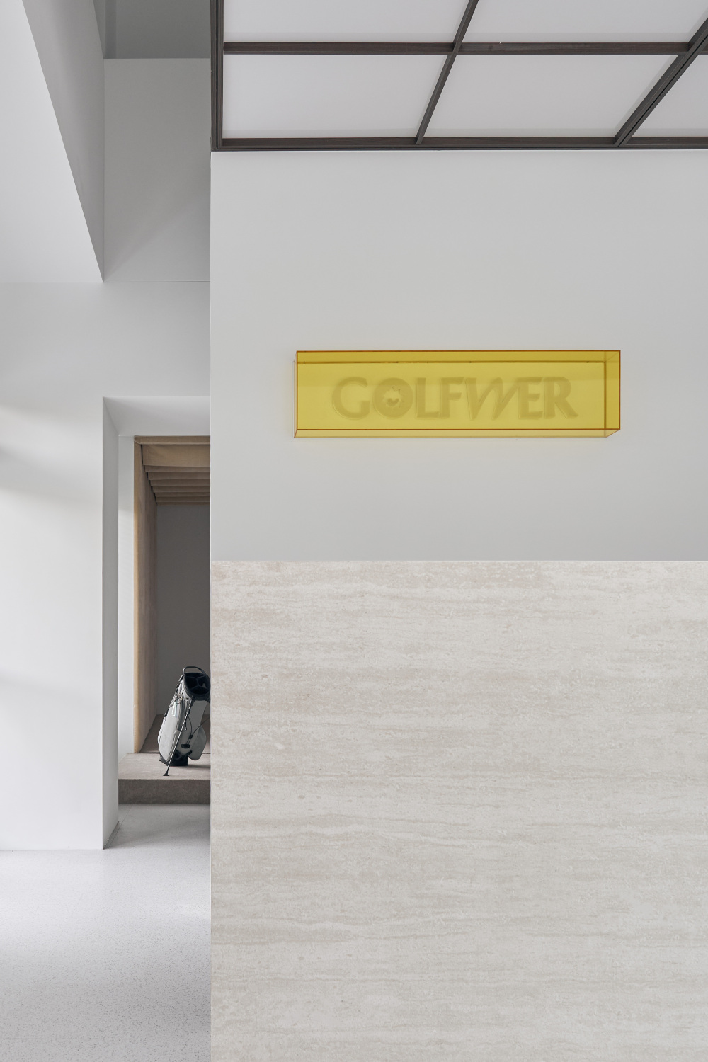 发光天花板如 “天幕” 般覆盖挑高空间,光线垂直倾泻而下,既强化了空间的纵深感,又为入口赋予 “仪式感”。踏入空间的瞬间,光线包裹周身,仿佛 “穿越光影隧道”,让访客从外界的喧嚣迅速切换至专注的运动心境。石材的冷冽、木饰面的温润与金属的精致构成核心材质组合。石材地面的致密肌理与光线碰撞,形成清晰的光影边界;木饰面墙面则以自然纹理中和石材的冷硬,传递出 “运动空间的温度”;金属线条的点缀则如 “光影的勾勒笔”,让三种材质在视觉上形成 “冷与暖”“粗与细” 的平衡,呼应高尔夫运动 “精准与松弛并存” 的特质。镜面元素的巧妙运用,让光线在反射与折射中不断流动。空间在实体墙面与镜面倒影之间反复延伸,形成 “虚实交织” 的视觉效果,既放大了挑高空间的开阔感,又让光线的轨迹变得更加丰富,仿佛 “高尔夫球的飞行弧线” 在空间中无限延展。