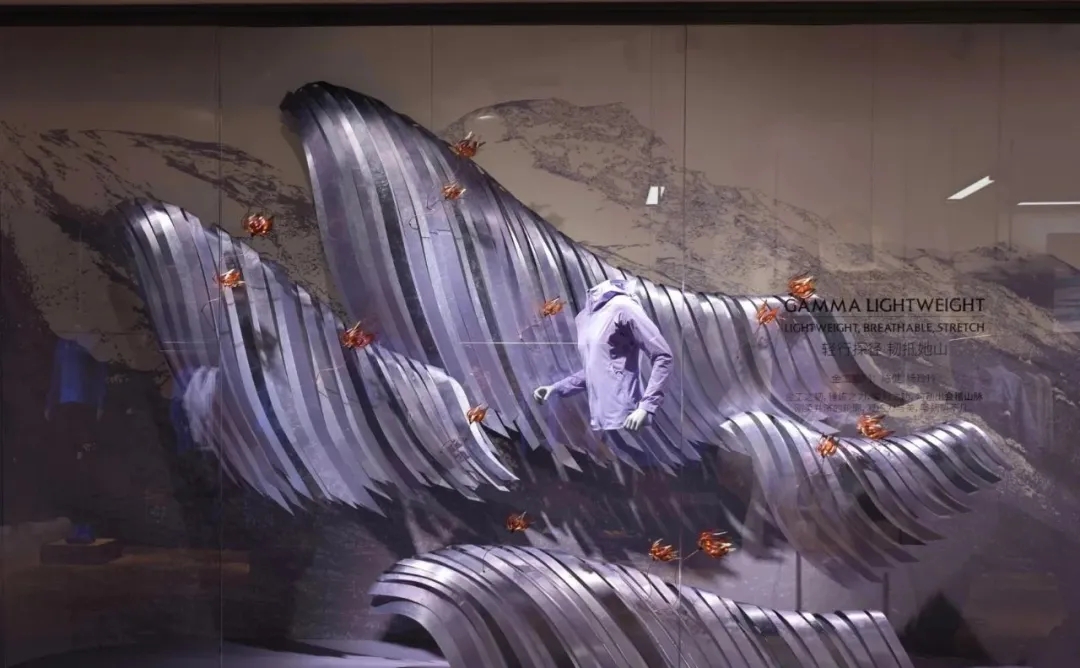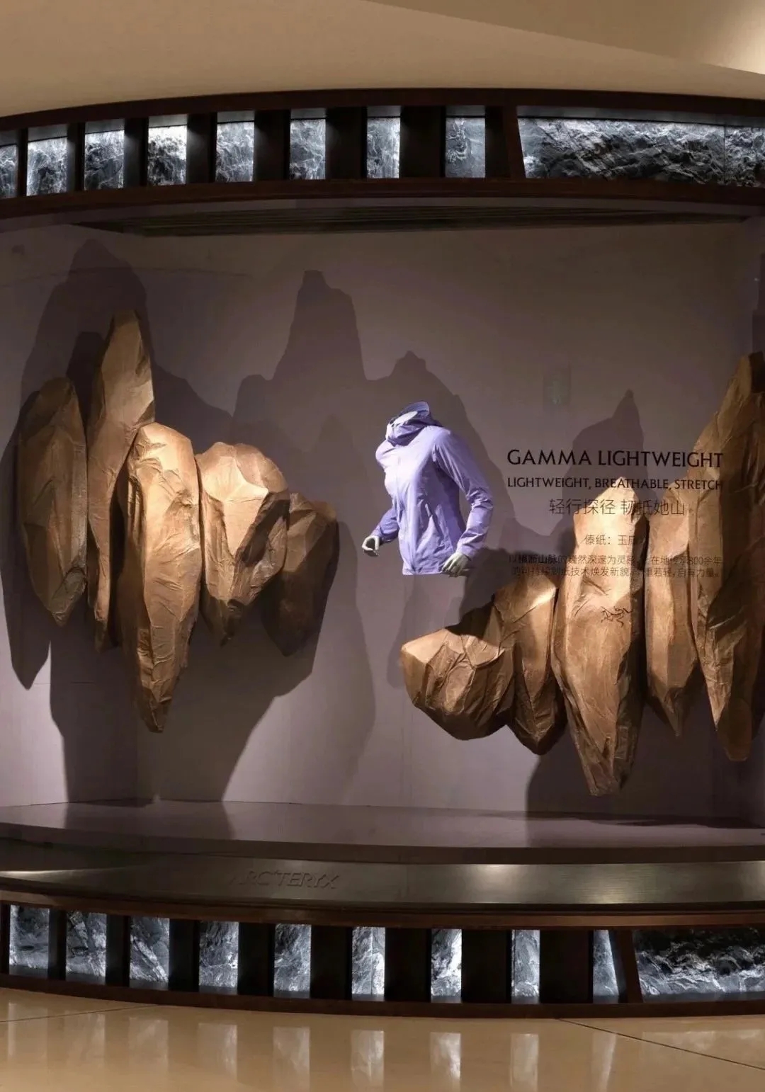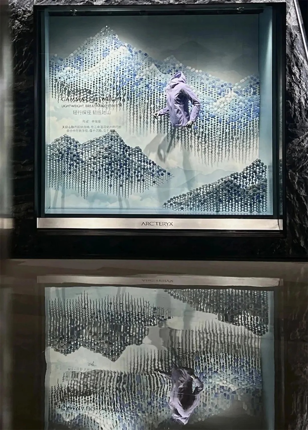 这些作品的展示,不仅仅是对传统手工艺的尊重和传承,更是对人与自然的和谐对话的表达。它们如同徒步登山者的脚步,坚定且有力,不断向前,突破每一座山峰,最终抵达精神的高地。“高山”不仅仅是物理的存在,它更是一种生活的态度,是对自我的探索、对传统文化的尊重、以及对未来的无限可能的追寻。始祖鸟通过这次设计,不仅在品牌和产品之间架起了一座文化与艺术的桥梁,也为我们提供了一个重新审视传统与现代融合的独特视角。始祖鸟通过这次艺术橱窗设计,完美地将传统手工艺与现代生活方式相结合,传递出一种尊重与创新并行的理念。这不仅是一场视觉上的盛宴,更是一场文化深度的洗礼,让我们每一个人都能在探索与挑战中找到属于自己的“高山”。