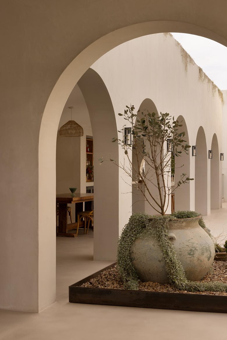 这个项目中最富诗意的元素之一,是环绕庭院的柱廊 —— 一系列拱门的设计灵感,源自原始建筑中一个现存的开口。“我们不断重复这一设计语言,” 迪・巴托洛说,“它为房子赋予了秩序。拱门就像视觉上的摇篮曲,能带来宁静感。” 从功能上看,它们连接了室内外空间,将客房、露天用餐区、酒吧与主要生活区串联起来。