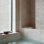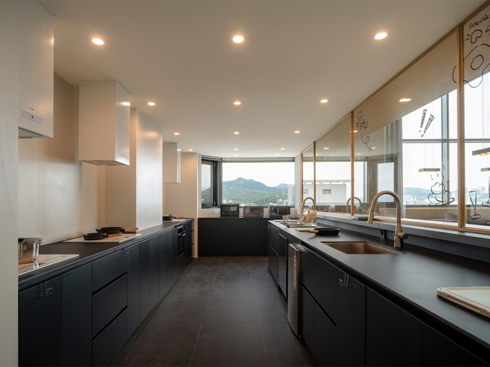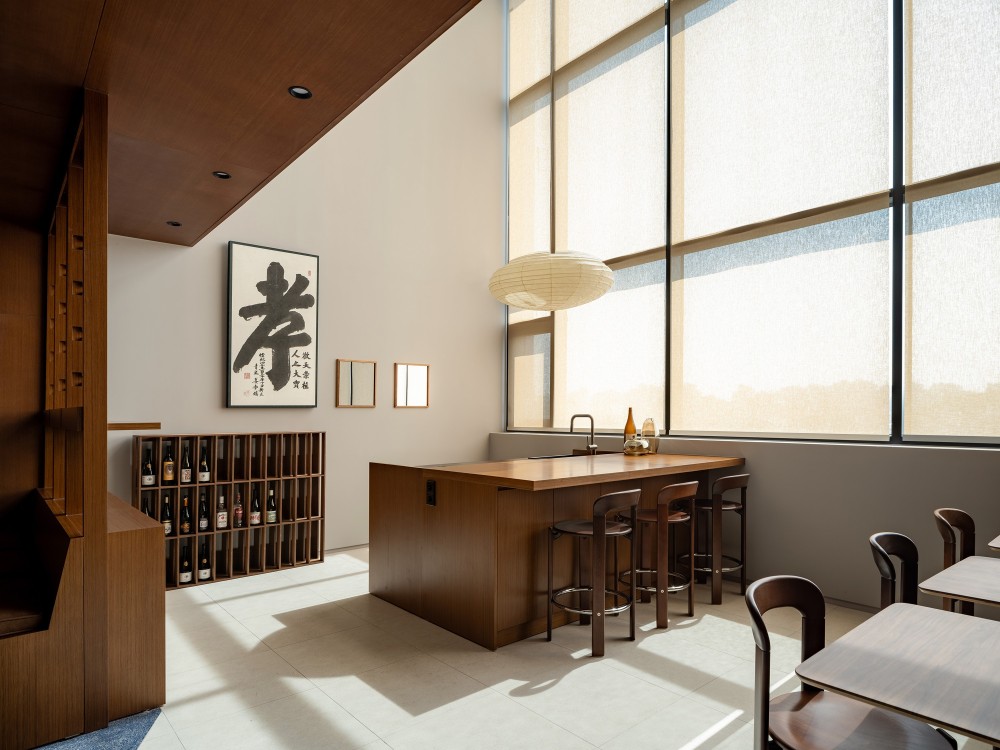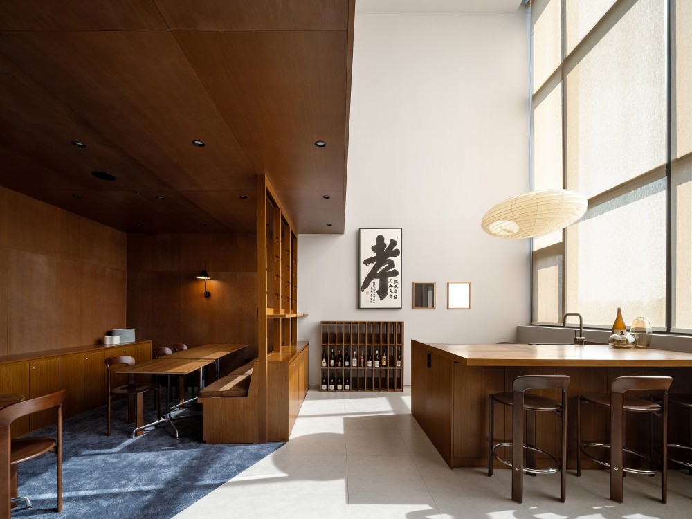 生活配套区的设计是 “功能诗意化” 的集中体现。洗衣房的标准化设备被赋予艺术化的叙事 ——“BEYOND CLEAN, BEYOND CARE” 的标语将洗衣行为从 “家务劳动” 升华为 “生活仪式”,金属推车与玻璃桌的组合则模糊了 “功能家具” 与 “艺术装置” 的边界,让日常空间充满设计巧思。厨房与休闲区的设计同样出彩:木质中岛台与高脚凳的组合营造出社交烹饪的场景,墙面的书法作品与酒柜则传递出东方美学的雅致,而大尺度的落地窗与纸质吊灯的搭配,让自然光线与人工照明形成温柔的对话,将 “烹饪、品酒、休憩” 等日常行为编织成充满人文温度的生活场景。