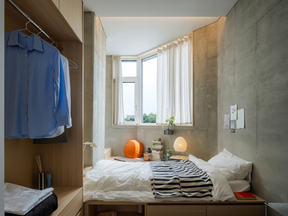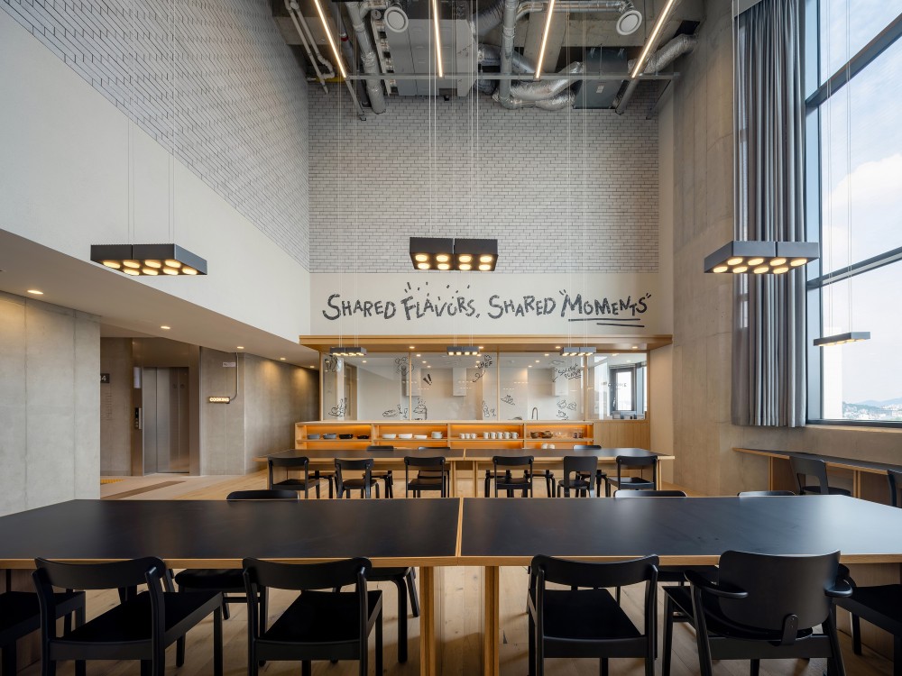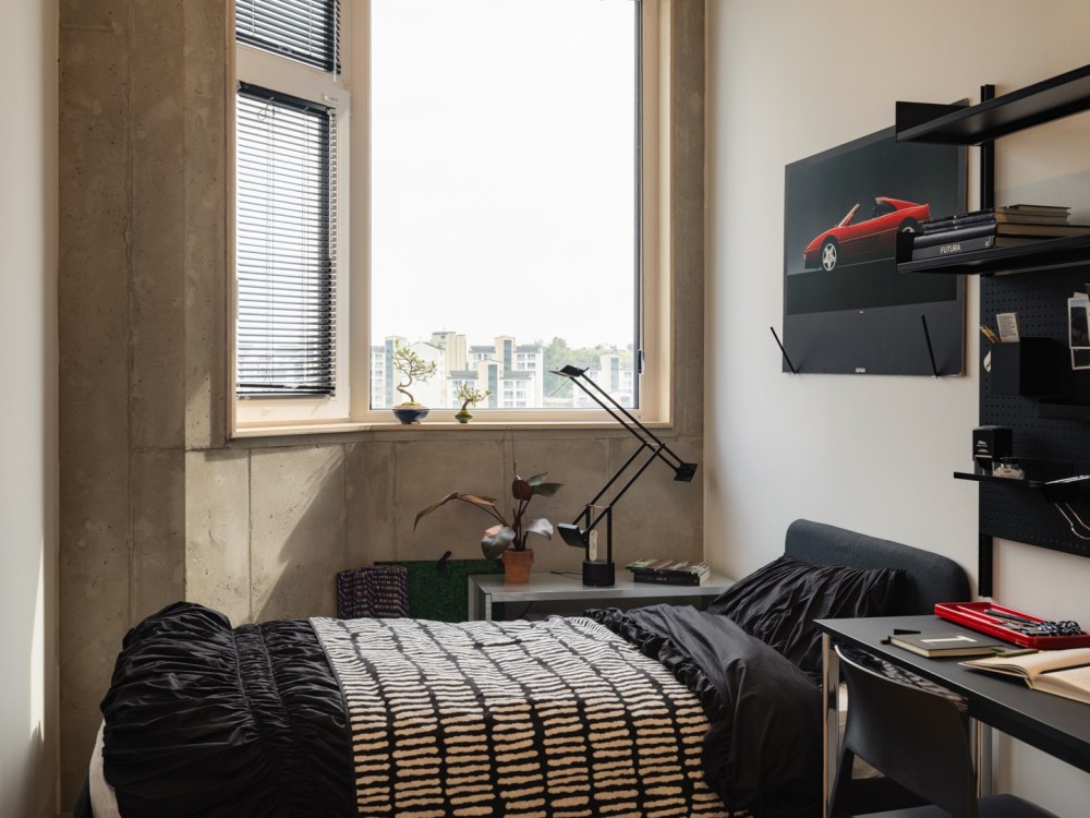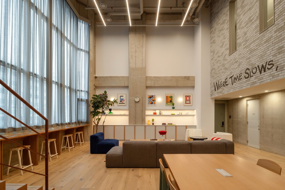 这种主题并非形式的堆砌,而是通过材质、尺度与动线的深层逻辑实现:公共区域的裸露天花如城市肌理的切片,暗示着空间的工业基因;独立工作区的木质隔断则以 “温和的边界” 划分功能,传递出人文关怀;洗衣房的标准化设备与艺术化标语并置,将 “日常功能” 升华为 “空间叙事” 的组成部分。