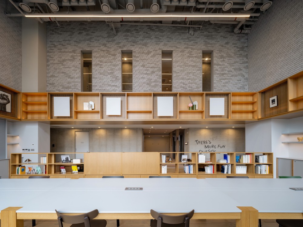 公共协作区的设计打破了传统办公空间的刻板印象,以 “大尺度共享 + 小尺度私密” 的嵌套逻辑,营造出既开放又具归属感的社交场域。高挑的空间中,裸露的管道与结构构件形成工业感的 “空间骨架”,而木质长桌与色彩明快的座椅则如 “软组织” 般填充其中,实现了 “工业冷峻” 与 “人文温暖” 的视觉平衡。墙面的穿孔金属架与嵌入式木质展柜,既是书籍与艺术品的展示载体,又通过材质的对比强化空间层次。顶部的线性灯光与点状照明系统,精准控制光线的明暗与聚焦,既满足协作办公的照度需求,又通过光影变化营造出 “白天高效、夜晚松弛” 的场景转换,让公共区域在不同时段呈现出差异化的空间气质。