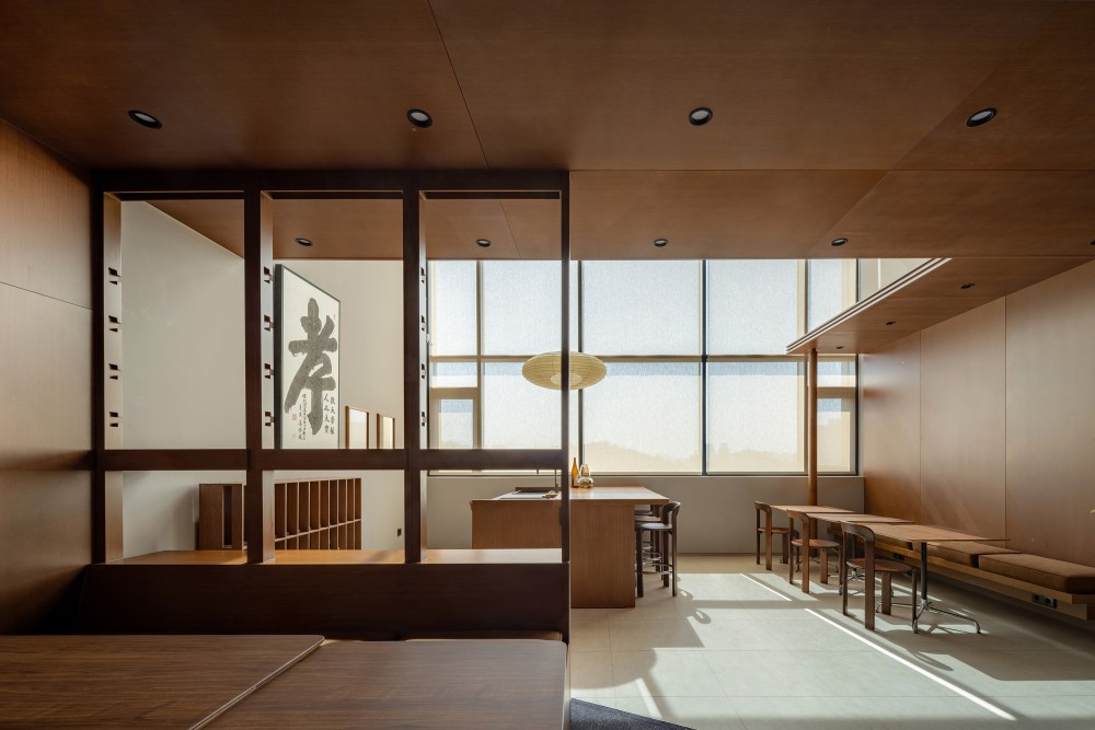 独立工作区的设计以 “温和的边界” 重新定义专注空间。木质隔断的半通透设计,既划分出相对私密的工作单元,又通过材质的温润感消解了封闭空间的压抑。桌面的金属台灯与木质桌椅形成材质碰撞,呼应了 “工业基因 + 人文关怀” 的设计主题,而大面积的落地窗则将城市景观引入室内,让专注工作的过程与城市的动态保持视觉连接。这里的尺度控制尤为精妙:桌面高度与座椅舒适度经过人体工学优化,确保长时间工作的舒适性;隔断的高度既保证了视觉的私密性,又维持了空间的通透感,让独立工作区成为 “开放中的私密,私密中的开放” 的矛盾统一体。