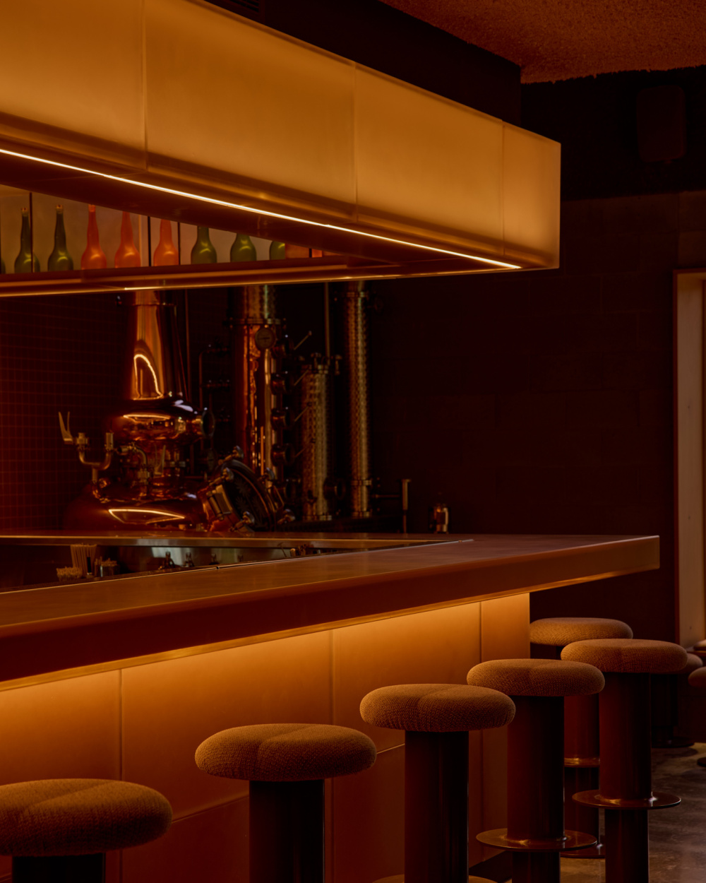 伯利酒吧的设计,不止于“瓶身形态”的表层模仿,更通过细节设计让伯利金酒的品牌基因全方位渗透到空间之中,实现“品牌与空间的深度共生”。吧台区域的设计堪称品牌展示的“核心舞台”:与环氧树脂吧台相映成趣的,是一旁熠熠生辉的黄铜金酒蒸馏器——金属的冷硬质感与树脂的温润形成对比,又共同传递出“匠心酿造”的品牌理念;吧台上方的背光酒架整齐陈列着伯利金酒的各式产品,灯光从酒架后方透出,既勾勒出吧台的专属边界,又让每一瓶金酒都成为空间装饰的一部分;另一面墙面上,成排的背光伯利酒瓶交织出暖橙与翠绿的柔和光韵,既是对品牌产品的展示,又是极具艺术感的墙面装饰,让品牌元素自然融入空间。其他材质的选择也精准契合工业美学基调与品牌气质:马赛克墙面瓷砖与赭石色地面瓷砖,在光泽感与低调质感之间取得精妙平衡,既呼应了仓库园区的工业肌理,又不会抢夺环氧树脂与金酒元素的视觉焦点;黄铜材质除了用于蒸馏器,还被运用在灯具支架、扶手等细节处,与金酒的高端定位相匹配,也为空间增添了复古精致的气息。