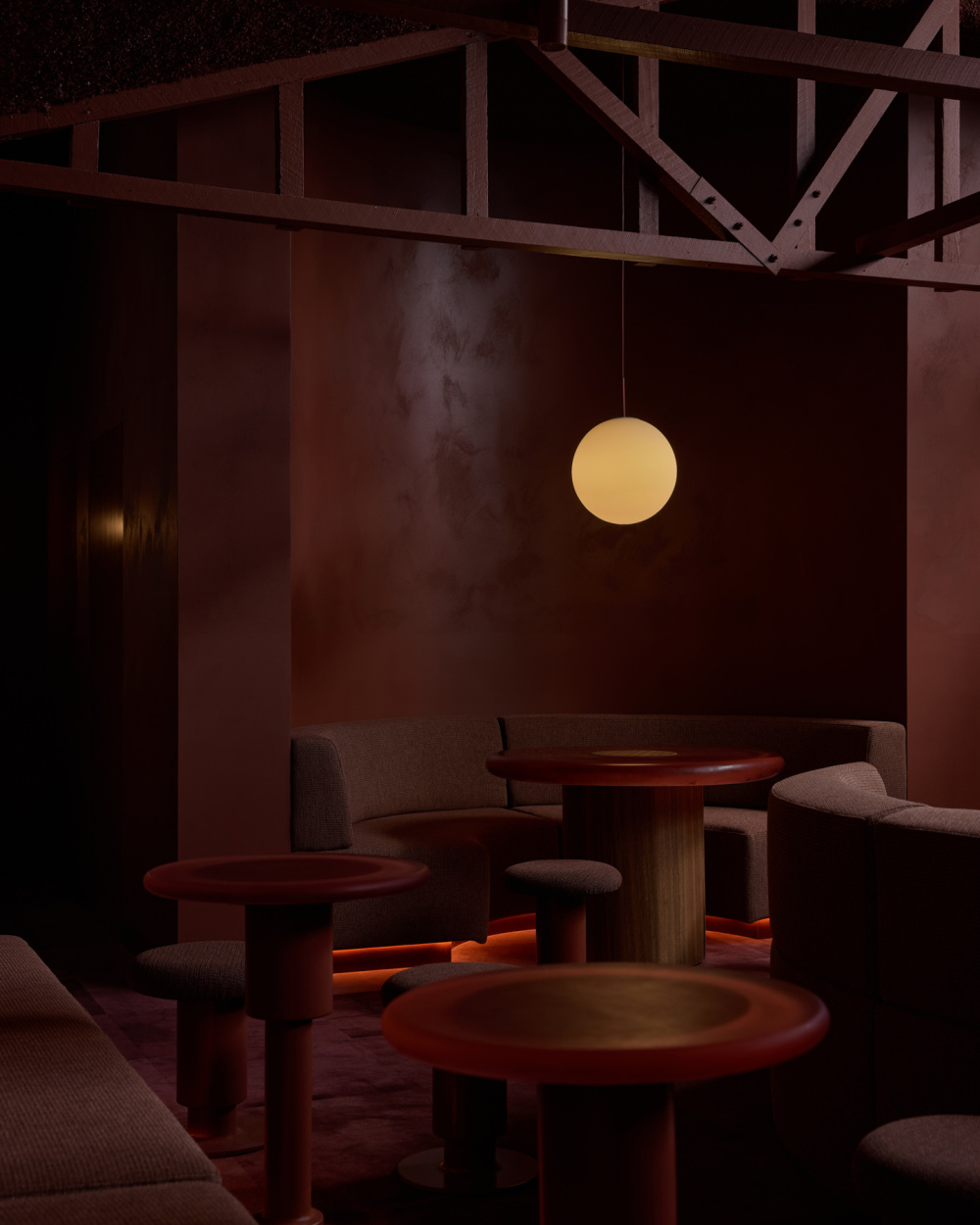 整个酒吧设计的“点睛之笔”,是对伯利金酒瓶身的材质转译——核心材料环氧树脂的运用,让金酒的标志性形态从“饮用载体”变为“空间语言”,成为贯穿全场的视觉线索。酒吧吧台与圆形桌面均采用环氧树脂打造,表面经过精细处理,呈现出光滑莹润的菱形质感,与伯利金酒标志性瓶身的有机形态与磨砂质感遥相呼应。更令人称奇的是环氧树脂的半透明特质,它如同一块“光的介质”,将空间内的焦糖色暖光与红色光晕充分吸收并柔和释放,让整个吧台区域笼罩在温润的光韵之中,与金酒在杯中摇晃时的光泽相得益彰。这些环氧树脂构件的诞生,堪称“工艺与耐心的双重胜利”。拉特格伯透露,整个过程需要先搭建精准的模板,再进行现场浇筑,待树脂完全固化后进行多道工序的打磨抛光,就连宽大的吧台台面也实现了整体浇筑成型。“环氧树脂十分‘挑剔’,不仅需要反复试验配方与工艺,更要在现场非理想环境下密切监测固化过程,任何一点疏忽都可能导致表面出现气泡或裂纹。”这种对工艺的敬畏之心,让最终落成的吧台线条流畅、触感细腻,成为空间当之无愧的视觉核心。