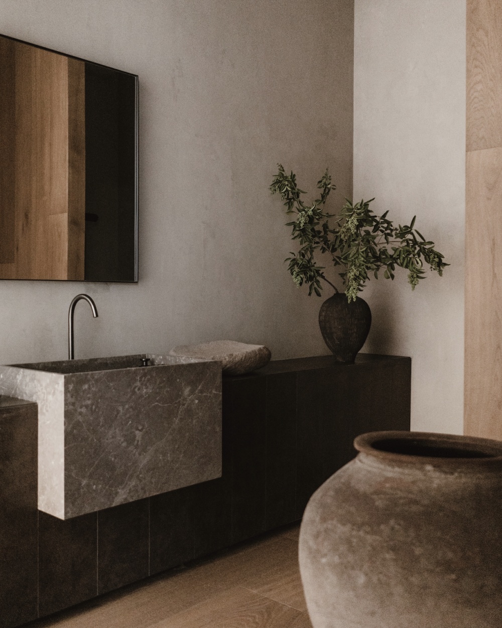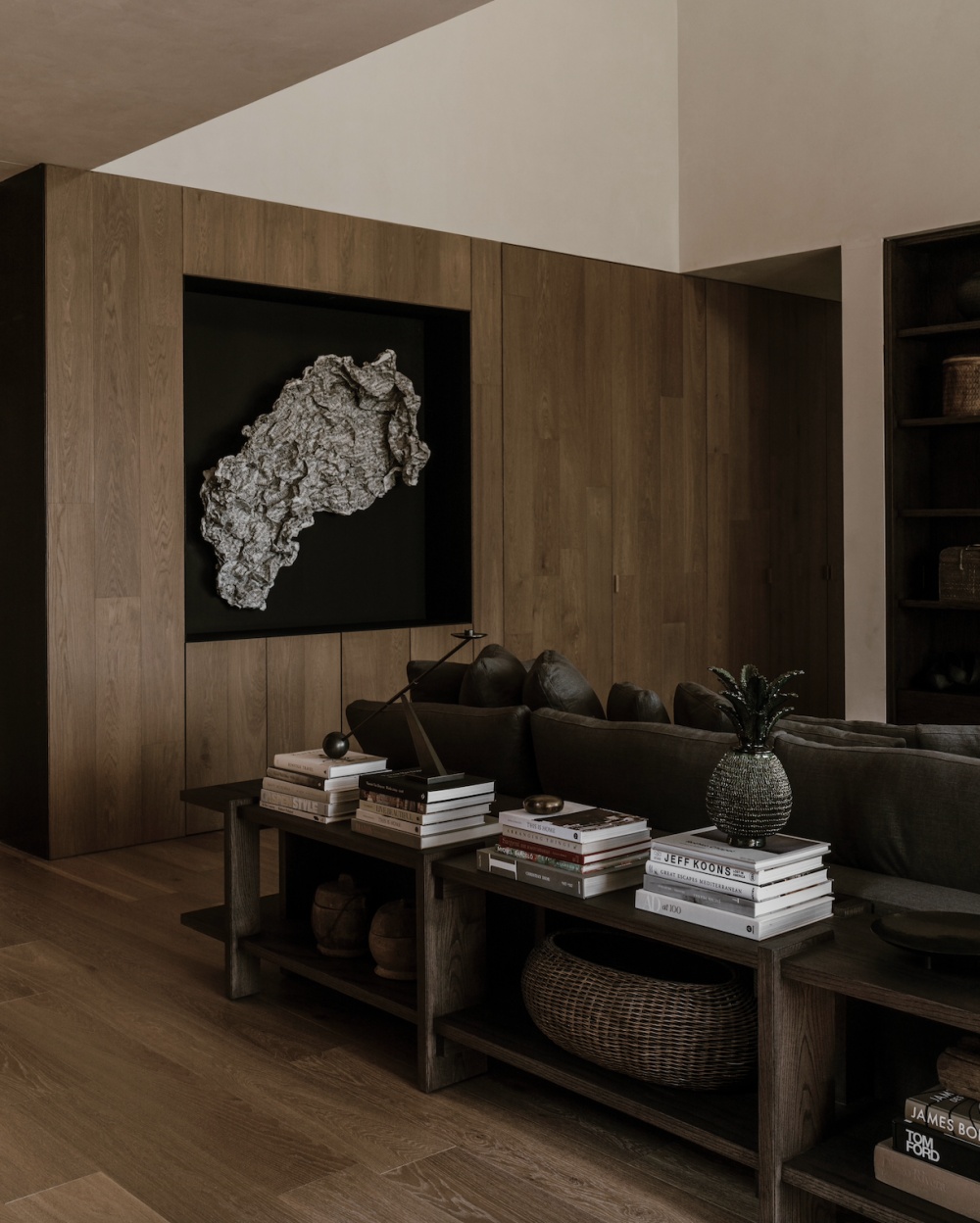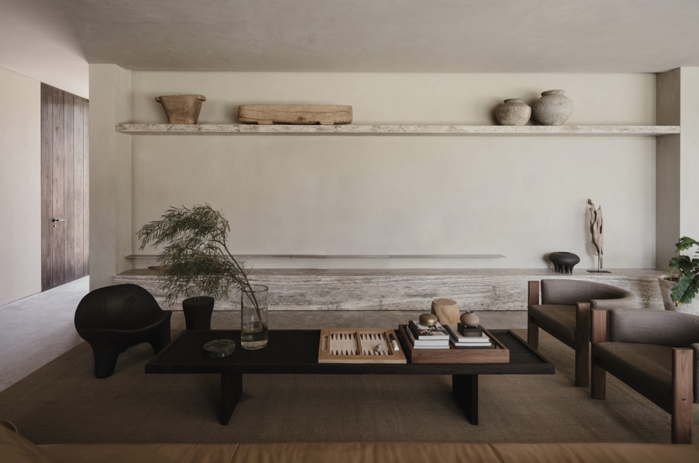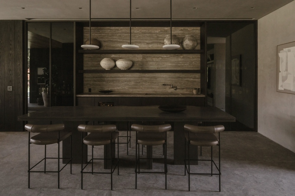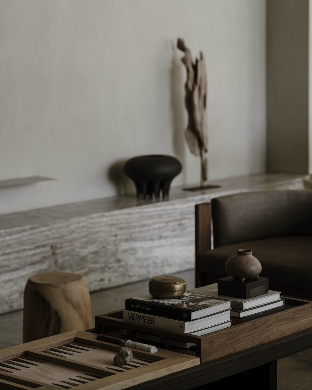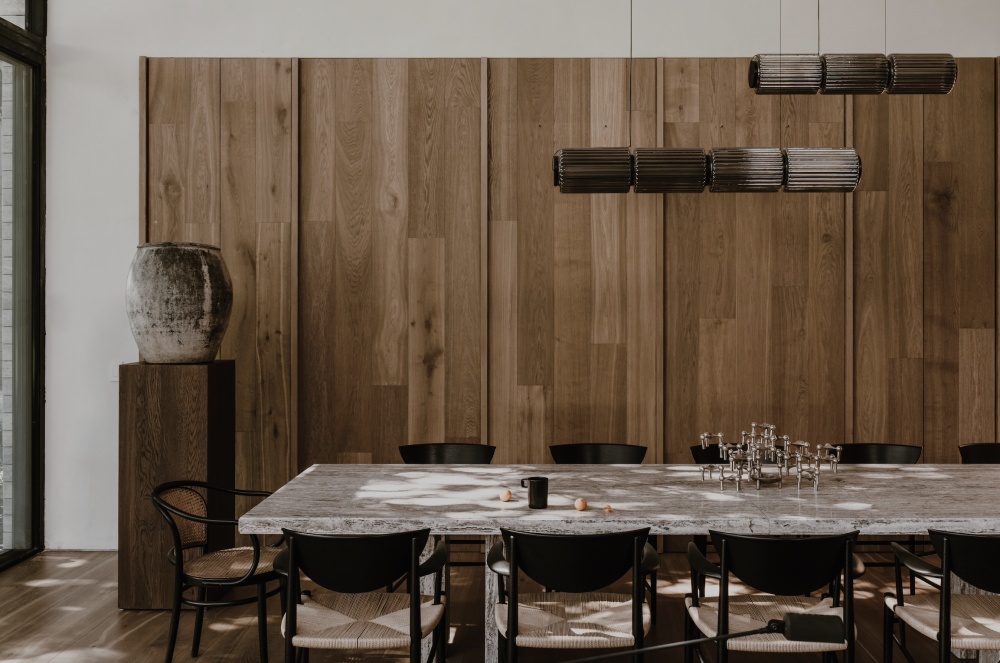 JDEstudio 在材料选择上,秉持 “精准而克制” 的原则,没有华丽的装饰,只用天然材料的本真质感,构建空间的基底。石灰华贯穿室内外,从地面延伸到墙面,它带着自然的孔洞与纹理,不是冰冷的建材,更像从大地里 “生长” 出来的一部分;苔原灰大理石点缀在台面与细节处,冷冽的色泽与石灰华形成 “柔与刚” 的平衡,却又在色调上保持和谐;深色的烧杉木板则为空间注入温暖,无论是墙面还是家具表面,木材的年轮与纹路都清晰可见,触摸时能感受到手工处理的细腻。