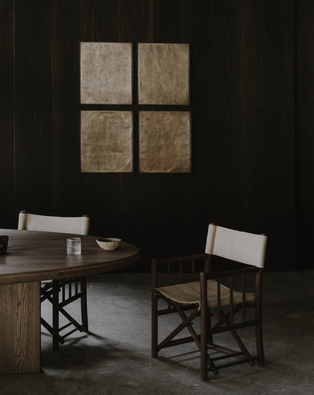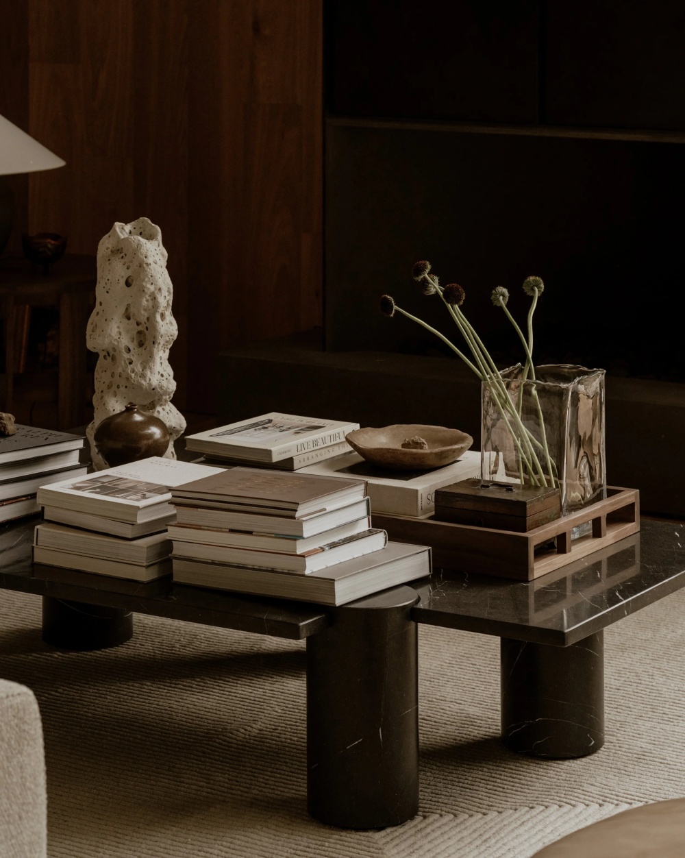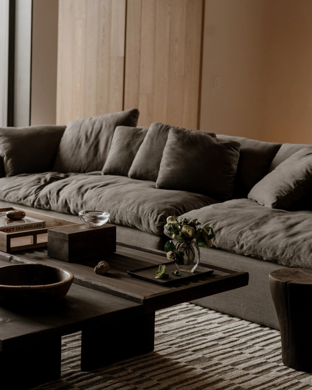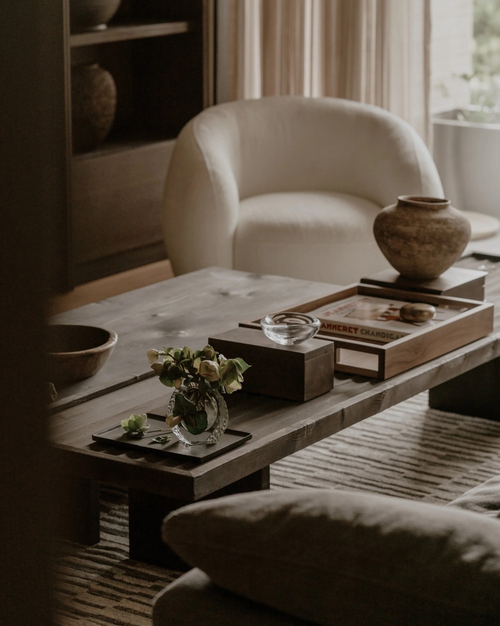 JDEstudio 在材料选择上,秉持 “精准而克制” 的原则,没有华丽的装饰,只用天然材料的本真质感,构建空间的基底。石灰华贯穿室内外,从地面延伸到墙面,它带着自然的孔洞与纹理,不是冰冷的建材,更像从大地里 “生长” 出来的一部分;苔原灰大理石点缀在台面与细节处,冷冽的色泽与石灰华形成 “柔与刚” 的平衡,却又在色调上保持和谐;深色的烧杉木板则为空间注入温暖,无论是墙面还是家具表面,木材的年轮与纹路都清晰可见,触摸时能感受到手工处理的细腻。