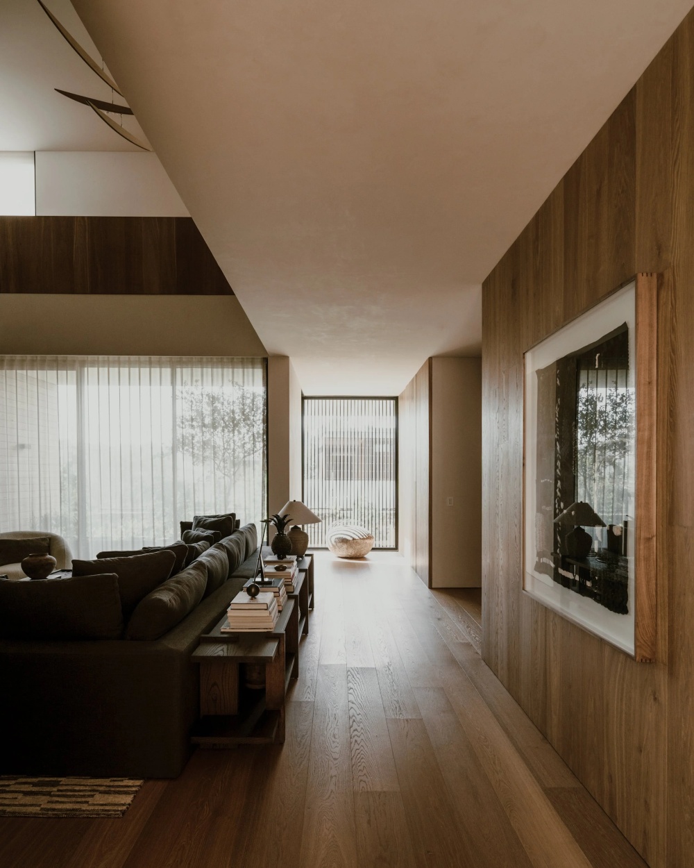 Casa CO 的设计,从一开始就把 “光” 当作核心主角。房屋与太阳轨迹精准呼应,让每一刻的光线都能在空间里留下独特的痕迹:清晨,第一缕阳光越过花园植被,洒在浅色调的石灰华表面,石材的肌理被照亮,像在墙面 “画” 出自然的纹路;正午,露台与花园渐渐融为一体,阳光穿过树叶的缝隙,在深色烧杉板墙上投下斑驳的影子,木材的温暖与光影的灵动碰撞,连风拂过的痕迹都能被看见;傍晚,阳光慢慢减弱,透过卧室的窗帘,在墙面投下柔和的条纹,像在提醒 “一天即将收尾”,引导空间从 “活跃” 过渡到 “休憩”。这种对光的 “刻意捕捉”,让 Casa CO 有了 “时间刻度”—— 居住者不用看时钟,从光影的变化里,就能感知清晨、正午与黄昏,让快节奏的生活,重新找回与自然同步的松弛感。