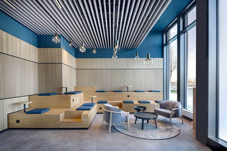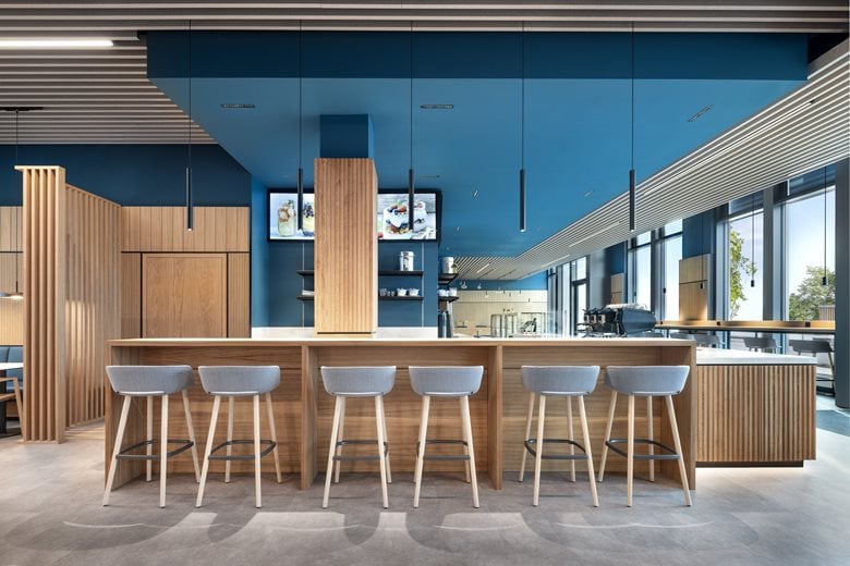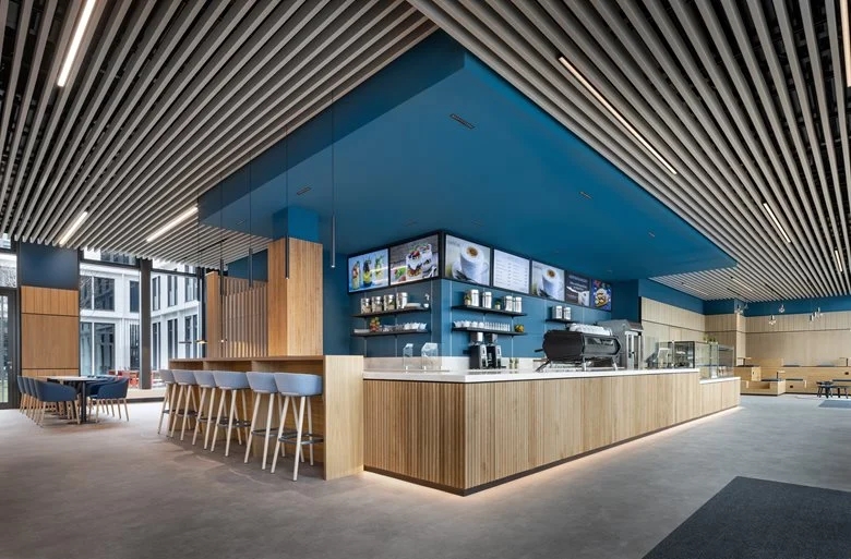 室内空间结构遵循清晰的分区理念,同时保留足够灵活性以适配多元使用场景。访客可在此体验丰富多样的使用方式:从咖啡馆区域的经典座椅,到舒适奢华的休息区,再到沿窗设置的抬高式靠垫座椅。无论是与人会面、短暂休憩,还是完成几小时的工作任务,小酒馆都是一处兼具功能性与轻松氛围的聚会点 —— 在此可尽览周边绿植景观与充满活力的园区景致。为实现最大灵活性,小酒馆还增设了外带服务,方便访客点餐后带走享用。