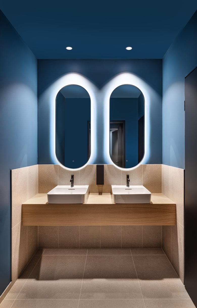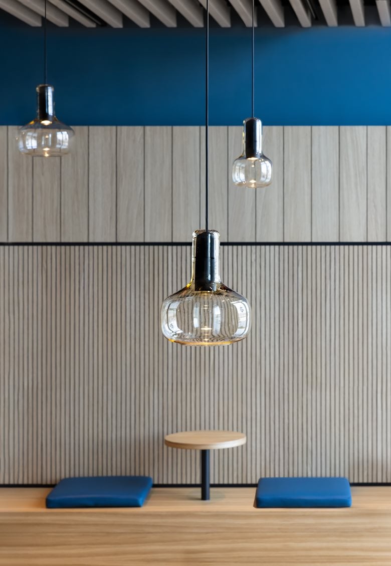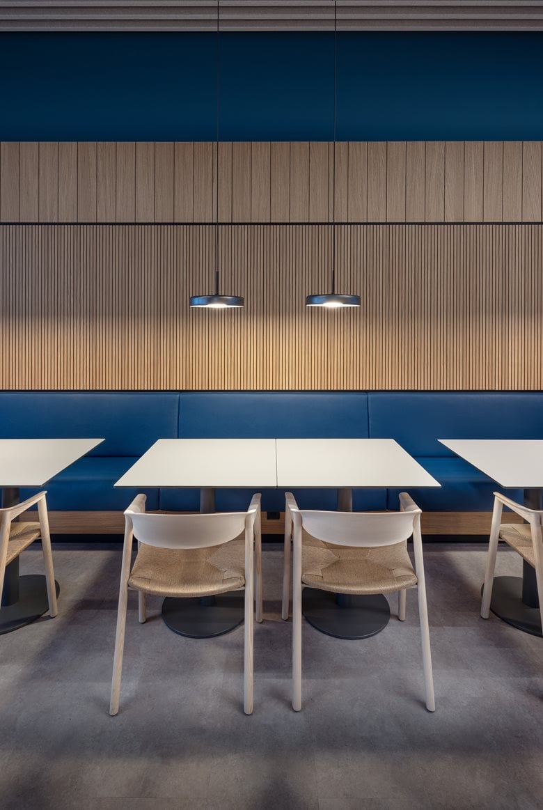 迪特尔建筑事务所的设计理念以清晰现代的美学风格为基础,旨在吸引访客停留 —— 从墙面镶板到吧台,温暖的木色调贯穿整体设计。设计刻意避开柏林储蓄银行品牌标志性的红色,转而选用沉稳鲜明的蓝色,营造出既充满张力又和谐统一的视觉对比。色彩与材料的选择中可见 “对立元素的交融”:一面是温暖木材与利落线条,另一面是自然肌理与精致细节。可移动桌椅与休闲躺椅搭配定制配件,而两张长条靠垫座椅与一系列工艺精湛的座椅,不仅为小酒馆赋予优雅气质,也拓展了多元使用可能。精心设计的灯光装置(从低调实用型到富有表现力的氛围灯),为每个区域营造出恰到好处的氛围。其中一大亮点是悬挂在休息区上方的 “光之云” 装置 —— 它不仅是视觉设计元素,更帮助将开放的空间结构划分成不同功能区域。