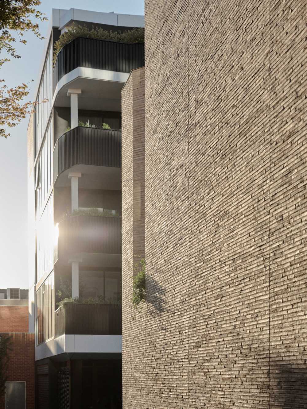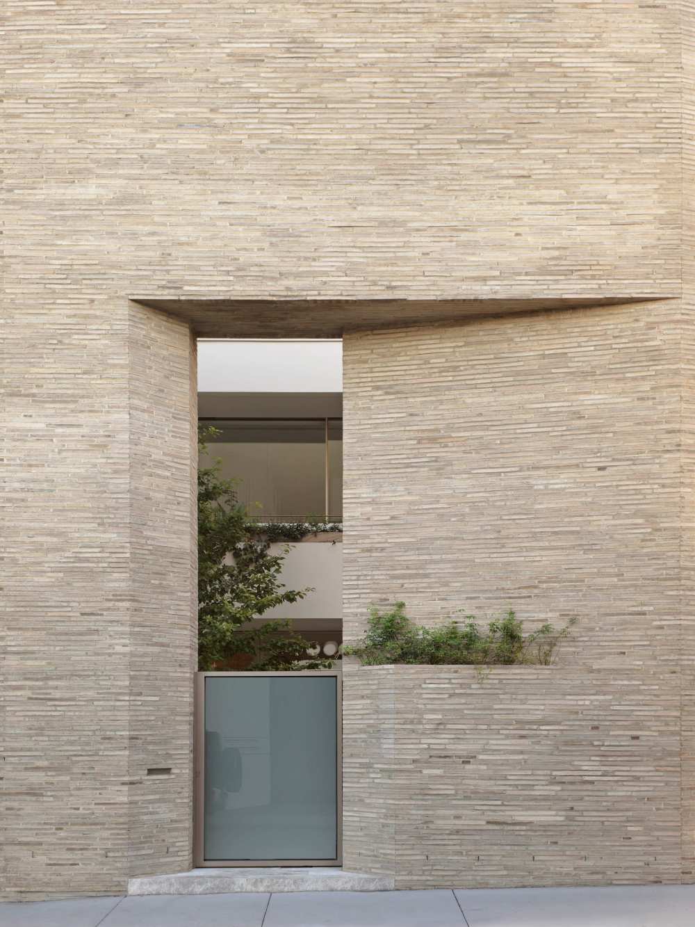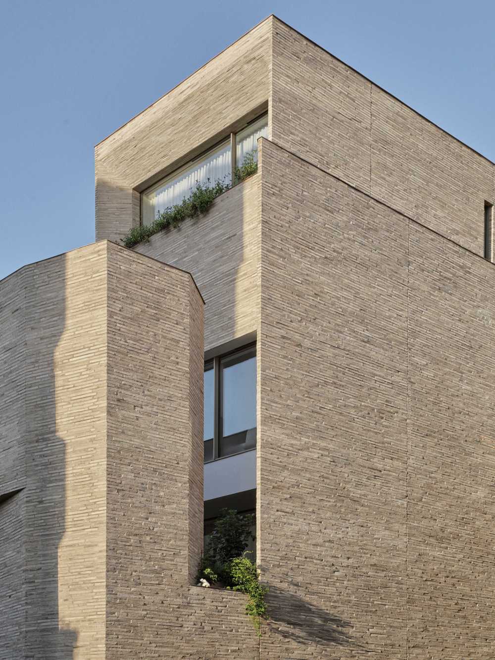 外墙采用质感厚重的手工砖块,如同为建筑披上一层 “坚固的保护壳”。砖块的天然纹理与深浅不一的色泽,传递出 “经得起时间打磨” 的质朴感,既与墨尔本都市的粗粝氛围相呼应,又为室内空间隔绝了外界的喧嚣与纷扰。墙面点缀的绿植区域与顺势蔓延的藤蔓,是对厚重砖墙的 “温柔中和”。这些绿植并非随意堆砌,而是由 Florian Wild 设计的克制搭配,形成一层 “活的帷幕”,柔化了建筑的硬朗边缘。随着时间推移,绿植将逐渐覆盖建筑结构,让硬质材料与自然生命形成 “动态共生”,让建筑在都市中呈现出 “生长” 的姿态。