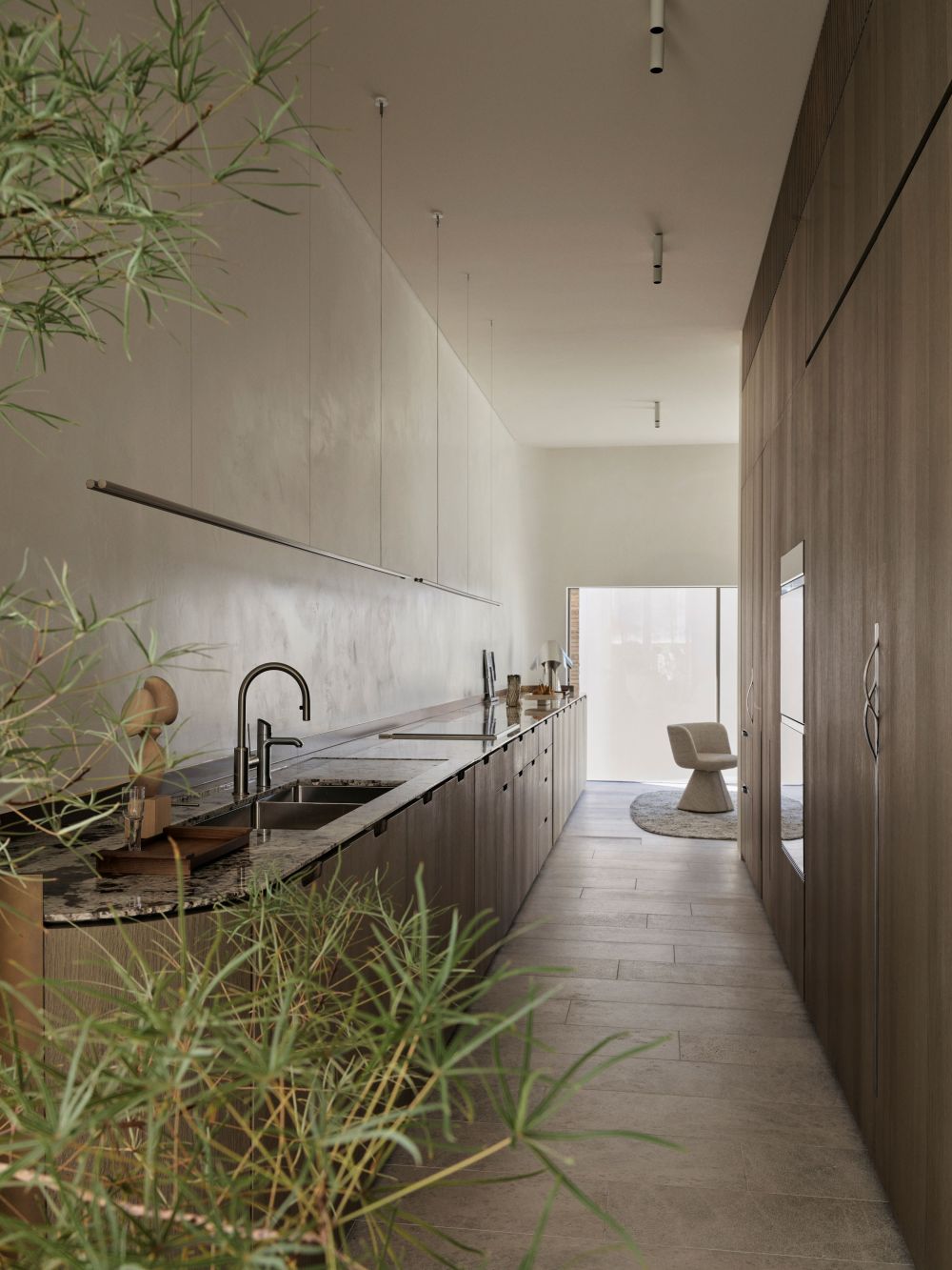 青铜材质点缀在书柜边缘、扶手与细木工制品上,为空间赋予了微妙的连贯感;厨房台面采用巴塔哥尼亚石英岩打造,独特的造型与质感使其本身成为一件极具雕塑感的家具,既满足了烹饪功能,又彰显了设计的艺术品位。动物纹理灵感的圈圈绒面料座椅、取自花园色调的色彩搭配、手工编织的尼泊尔地毯,为起居空间奠定了温暖基调;屋顶露台的家具与色彩设计师 Paola Lenti 合作甄选,确保家具色调能与随季节变化的景观色调和谐相融,让室内外的视觉体验无缝衔接。Florian Wild 设计的绿植方案,采用 “少而精” 的克制原则,避免了过度种植的杂乱。藤蔓植物与树木沿建筑垂直生长,与砖质外墙形成巧妙对话,既柔化了建筑的硬朗线条,又为室内提供了 “框景式” 的自然景观,让每一扇窗户都成为 “流动的风景画”。随着时间推移,绿植将逐渐覆盖建筑结构,中和硬质材料的厚重感,进一步加深室内外空间的联结。这种 “动态设计” 让 “光之屋” 超越了静态的建筑形态,成为 “与时间共生、与自然共长” 的生命体,在都市中始终保持着鲜活的生命力。