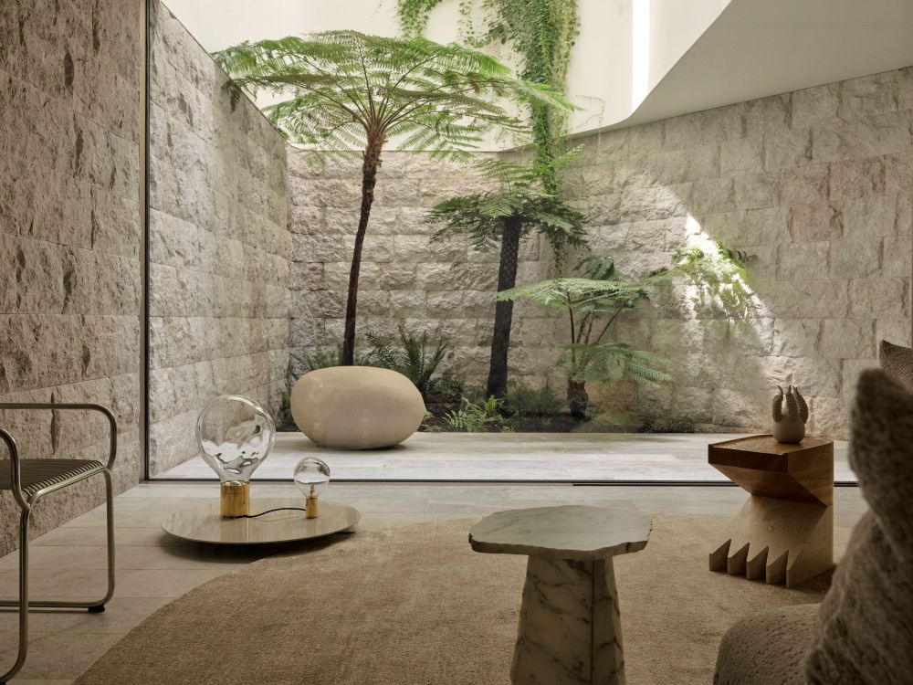 贯穿住宅全高的楼梯,是空间的 “垂直纽带”。光线沿其抛光墙面流淌而下时,进一步放大了空间的纵深感与开阔感,让上下楼层的过渡不再单调。楼梯的设计不仅是交通功能的实现,更成为室内的 “视觉焦点”,其流畅的线条与石材的质感,与整体空间的静谧美学高度契合。挑高空间中悬挂的 Lindsey Adelman 定制灯具,宛如悬浮于空中的珠宝。简约的造型避免了过度装饰的繁琐,精致的细节又为空间注入了艺术感,灯光亮起时,柔和的光线与自然光交织,让空间更显温暖通透,成为 “光的叙事” 中最具代表性的一笔。地下康养区的设计,将 “私密感” 与 “自然互动” 完美平衡。带有纹理的石灰岩墙面围合出桑拿房与冥想区,下沉式庭院中蕨类植物与垂直绿植盎然生长,形成一处 “地下绿洲”。每一处视野都能将室外景致引入室内,让康养过程成为 “与自然对话” 的体验,在都市环境中维系着人与自然的深层联结。
