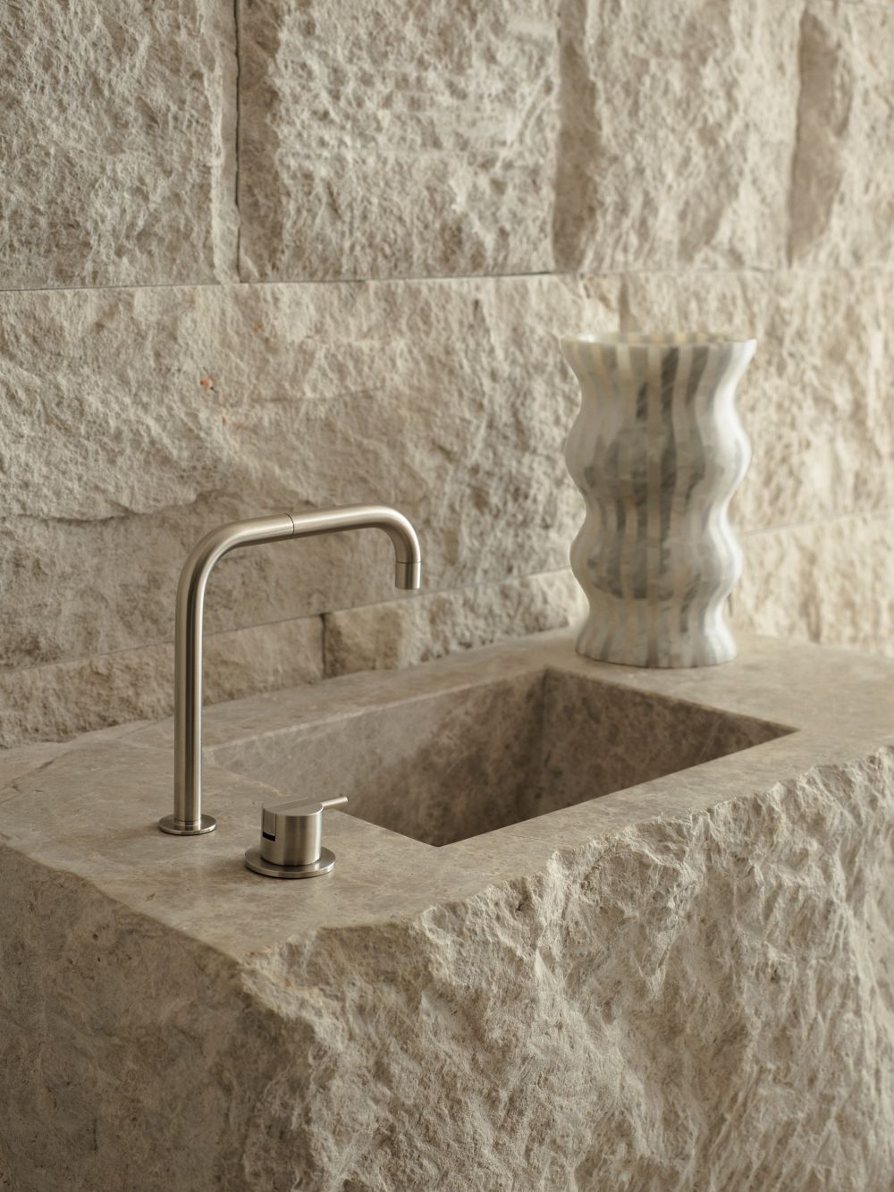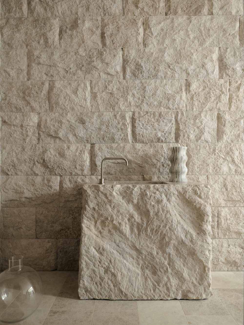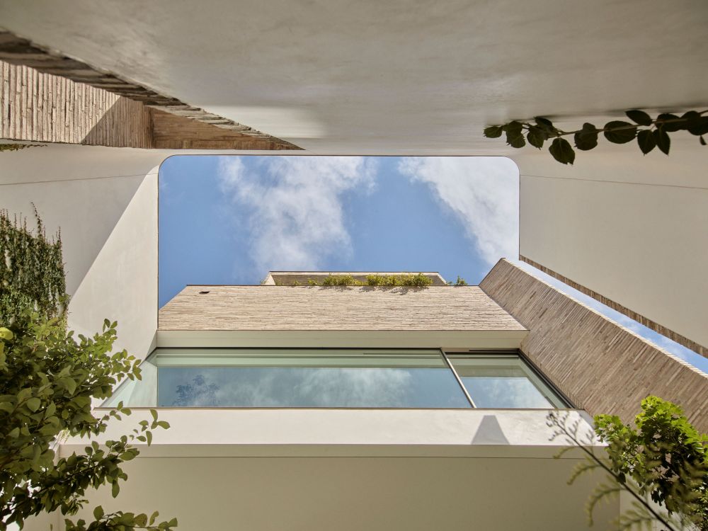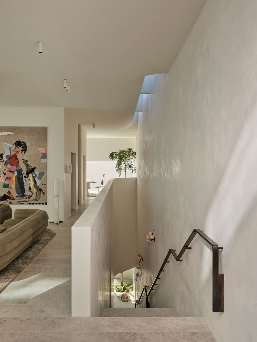 设计团队通过天窗、悬挂式花园与挑高空间的组合,将自然光引入四层住宅的最深处。光线沿抛光墙面流淌,引导人们的视线向上探寻,既拓展了空间的开阔感,又让室内每一个角落都能感受到 “光的存在”。这种对光的极致运用,让空间摆脱了紧凑地块的压抑感,呈现出 “通透而不空旷” 的舒适尺度。曲面石膏与石材饰面的柔和质感,与外墙手工砖块的厚重形成鲜明对比,让空间体验从都市的粗粝感,悄然过渡到静谧的休憩氛围。温暖的土耳其石灰岩作为贯穿空间的视觉线索,通过锤凿、雕刻与精磨等不同工艺处理,既划分了功能区域,又强化了空间的连贯感,让每一处转折都自然流畅,充满冥想般的宁静。