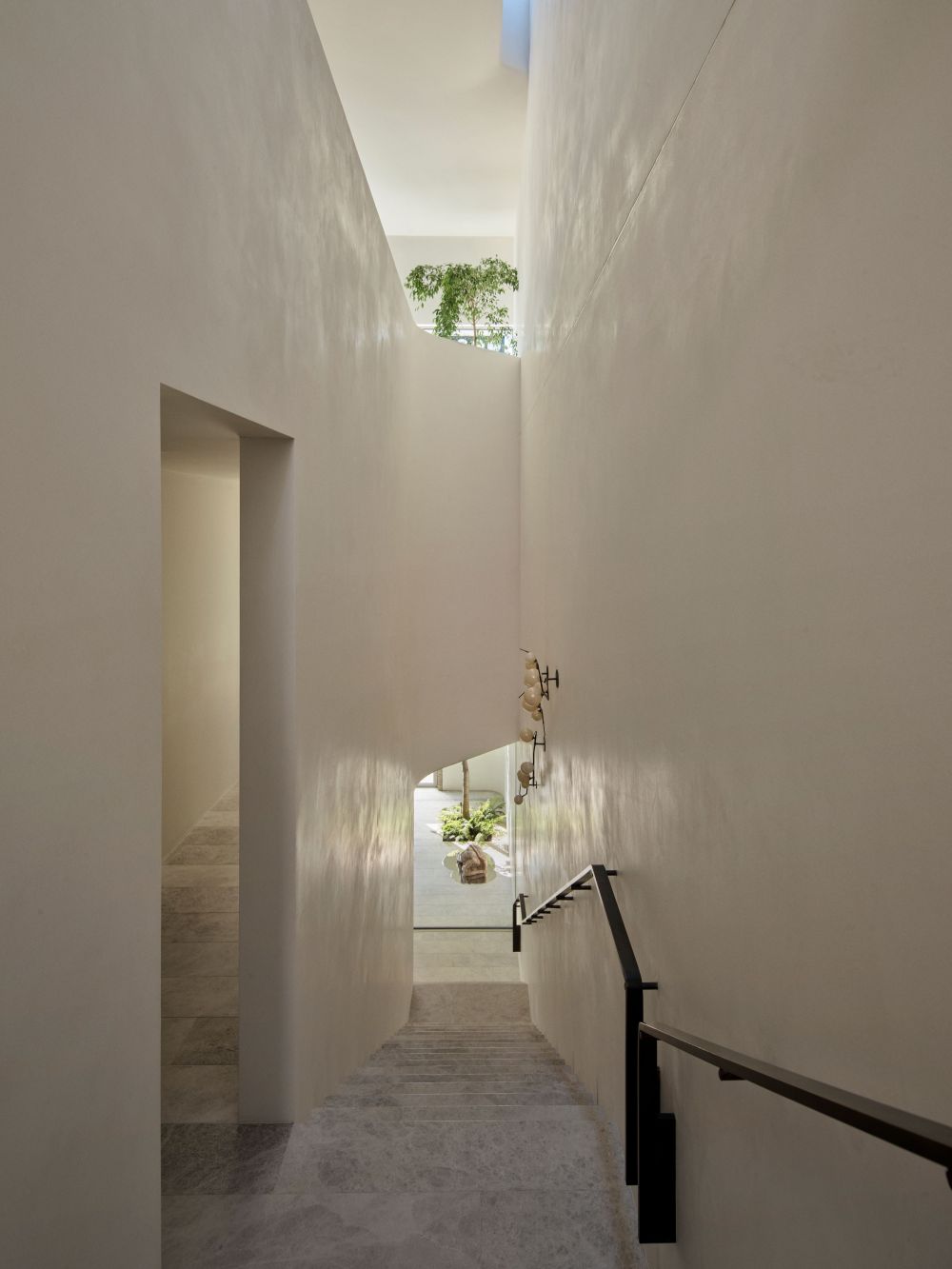 独特的斜向入口门槛,如同 “现实与静谧的分界线”。当访客跨过门槛的瞬间,城市的喧嚣被自然隔绝,心理上完成从 “公共空间” 到 “私人领域” 的切换,这种设计让 “踏入家门” 成为一种具有仪式感的体验。入口后的前院被茂密绿植环绕,形成一处 “微型绿洲”。绿植的自然气息、叶片的光影斑驳,为室内空间奠定了宁静基调,让访客在进入室内前,先通过视觉与嗅觉的沉浸,卸下都市生活的疲惫,做好 “拥抱静谧” 的心理准备。