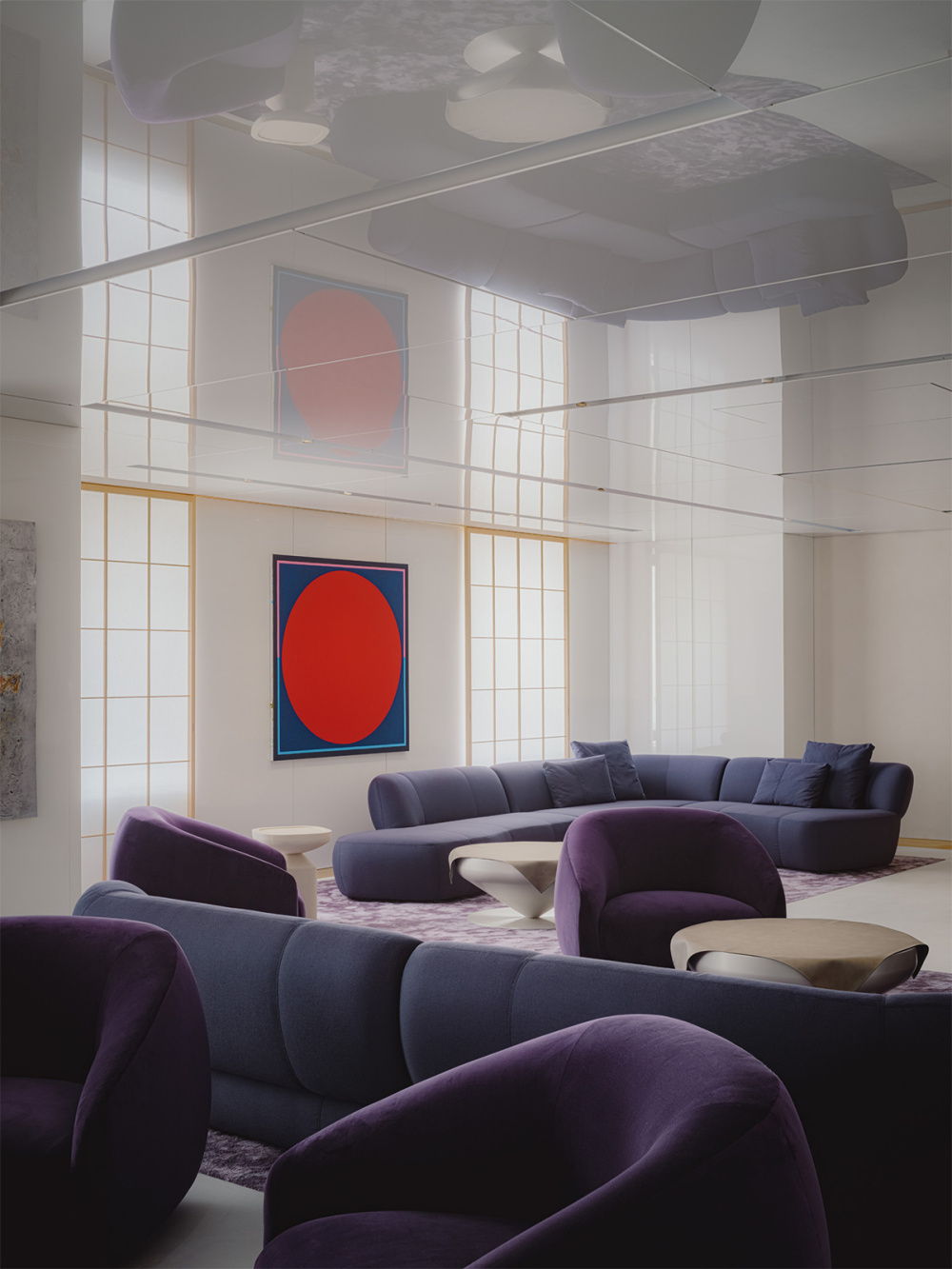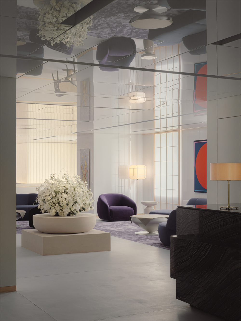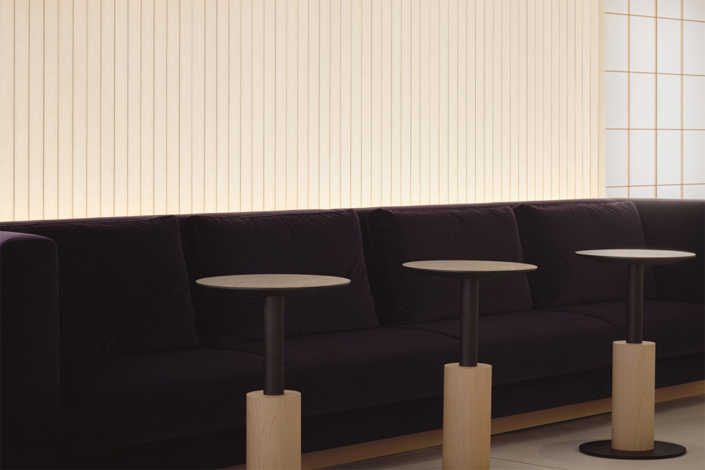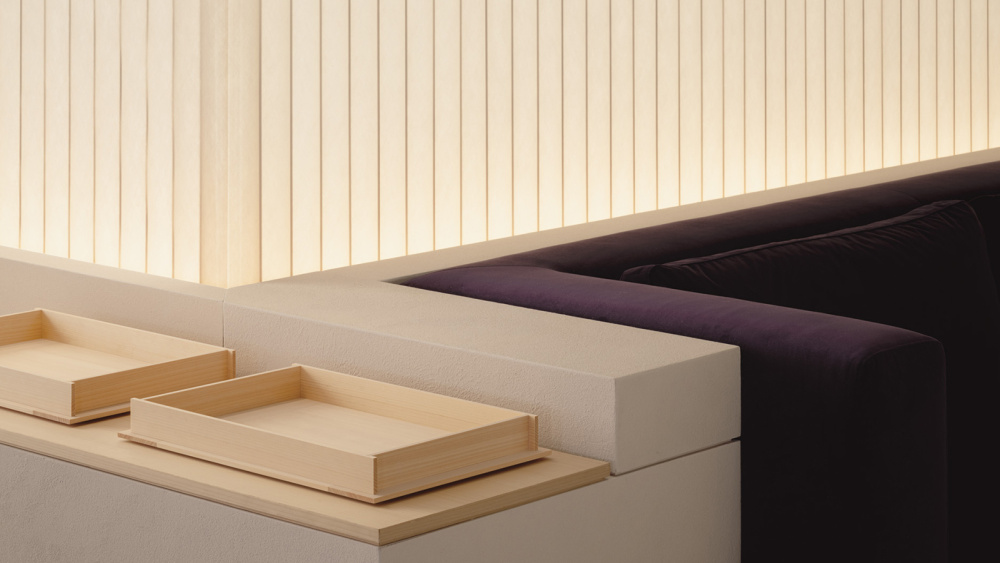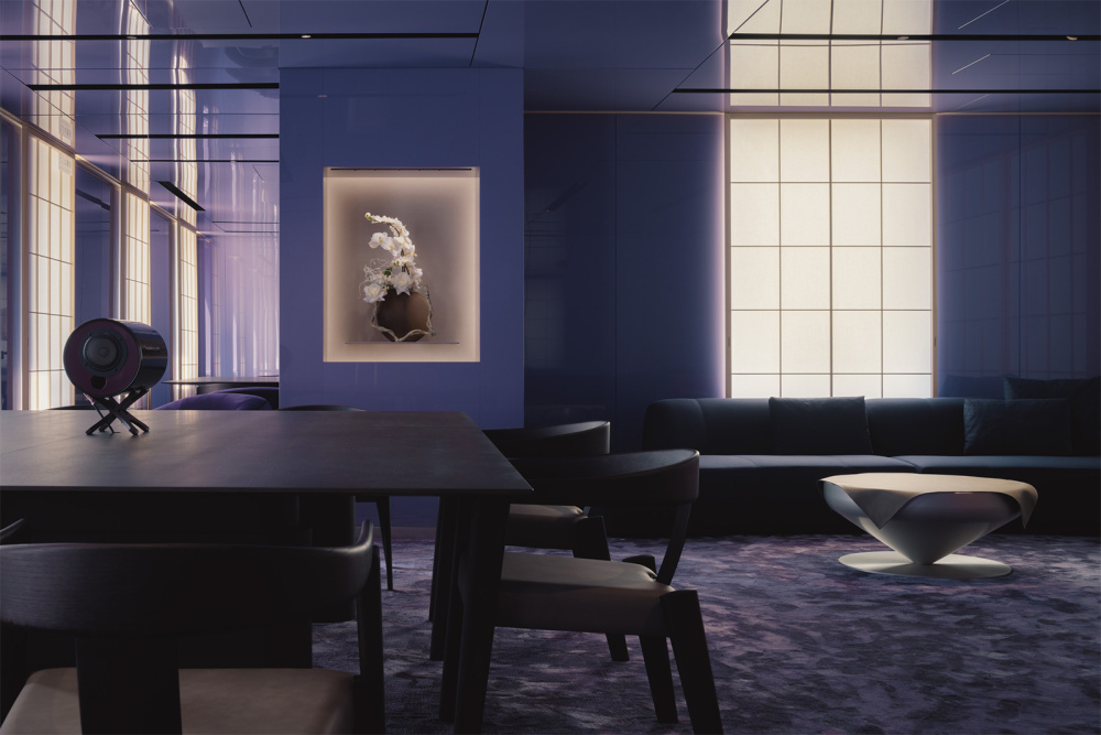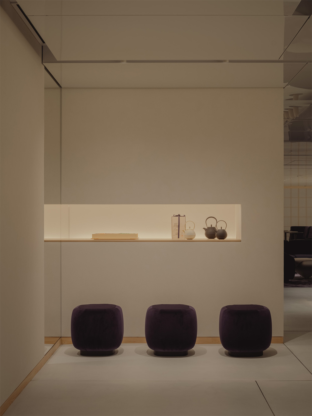 色彩是空间 “文化基因” 的直接载体,I IN 摒弃了银座常见的 “浮夸奢华”,选择以 “江户紫 + 白色” 的组合,在简约中注入日式美学的厚重:江户紫:点睛之笔的日式端庄江户紫并非大面积铺陈,而是作为 “情感点缀色”,悄然融入白色基底 —— 后方区域的软装、局部装饰细节均以江户紫包裹,其深邃而温润的色调,自带日式传统的庄重感,既呼应了银座作为日本高端商业核心的 “文化底蕴”,又避免了现代空间的 “冰冷空洞”,让 “端庄” 成为空间的隐性气质;白色:基底的现代包容白色作为空间主色调,并非单一的 “纯粹白”,而是通过不同材质(墙面、家具、织物)呈现出 “暖白、米白、乳白” 的细微差异,既为 “光的反射” 提供了纯净载体,又以 “包容感” 承接江户紫的点缀,让色彩组合在 “对比” 中达成和谐,完美诠释 “现代简约中藏日式韵味” 的设计内核。