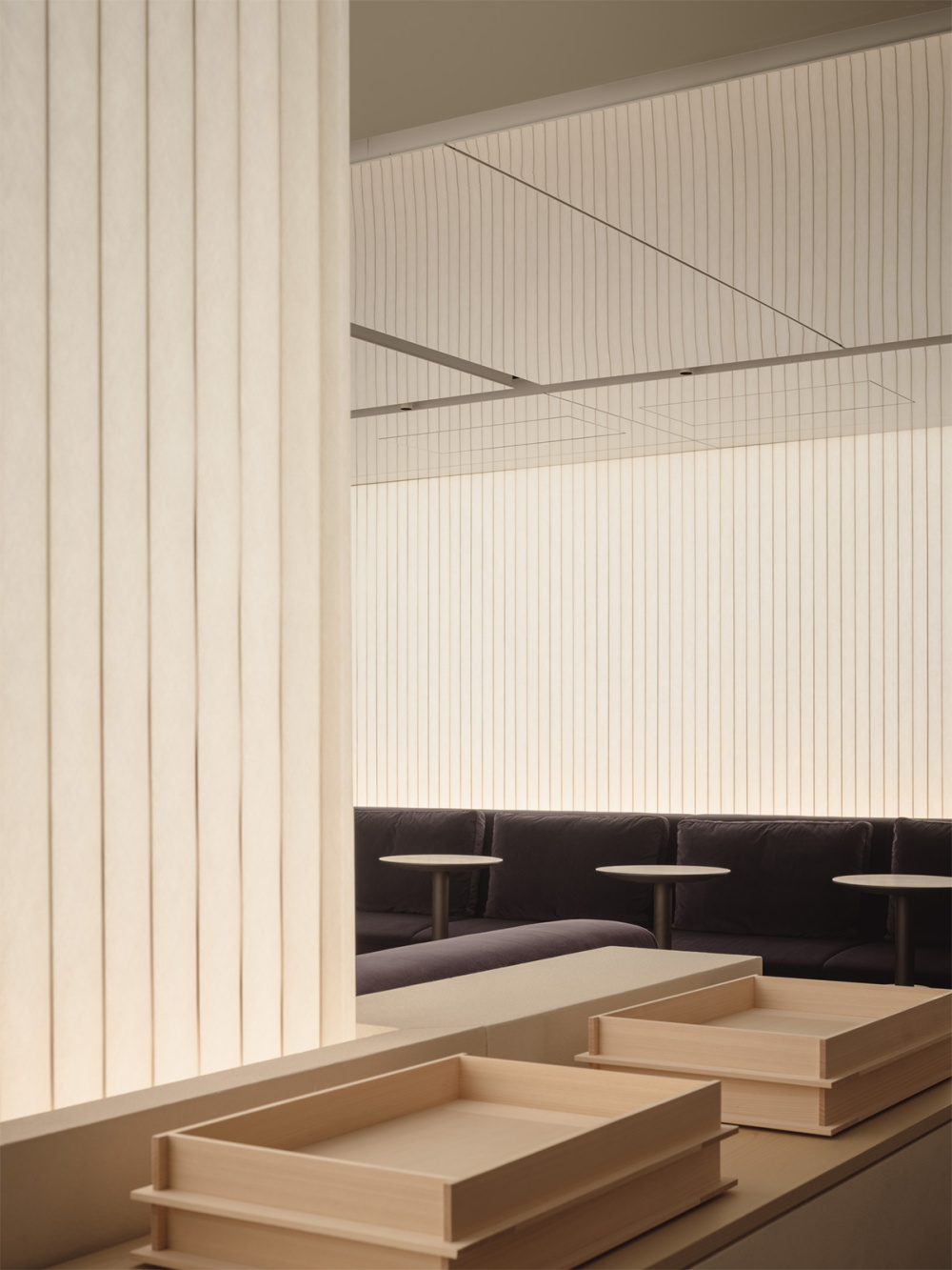 “光” 是松屋银座休息室的 “灵魂”,设计团队从 “反光材质、光源组合、景观呼应” 三个维度,将银座的 “都市光泽” 转化为空间的沉浸式体验:反光天花板:放大光的流动感针对原有空间 “宽敞流畅 + 落地窗” 的优势,天花板采用反光材质,如同 “空间的镜面”—— 白天,落地窗引入的自然光经天花板反射,均匀铺满整个空间,让光线不再局限于窗边,而是渗透到角落;夜晚,室内标志性照明(落地灯、氛围灯)的光芒在天花板上折射,与窗外银座的建筑灯光、橱窗光粒呼应,仿佛将 “都市夜景” 拉入室内,让休息室与银座的璀璨融为一体;光源组合:柔化光的层次,营造松弛感照明设计拒绝 “单一强光”,而是采用 “自然光 + 落地灯 + 障子屏风滤光” 的组合。