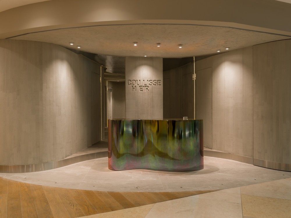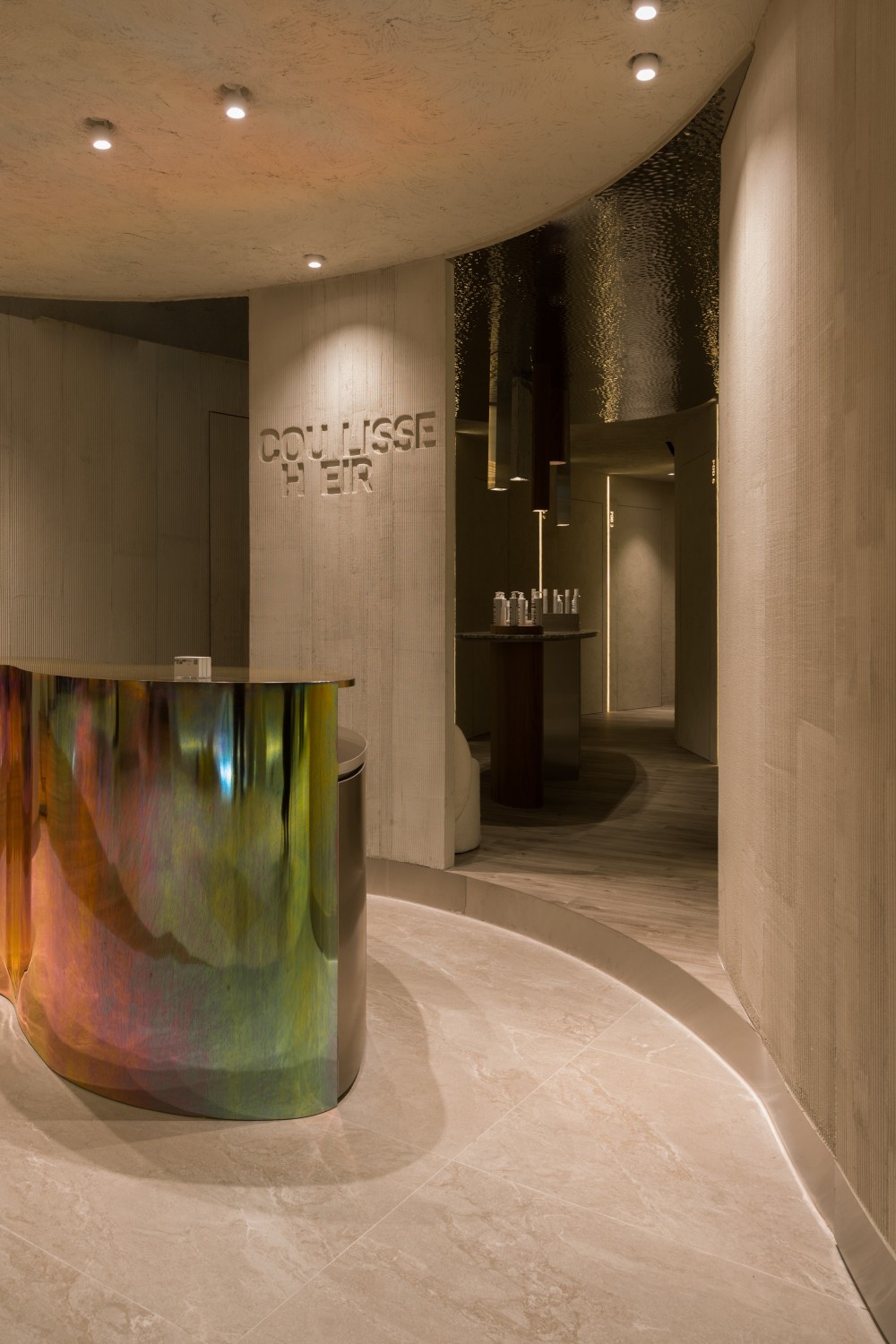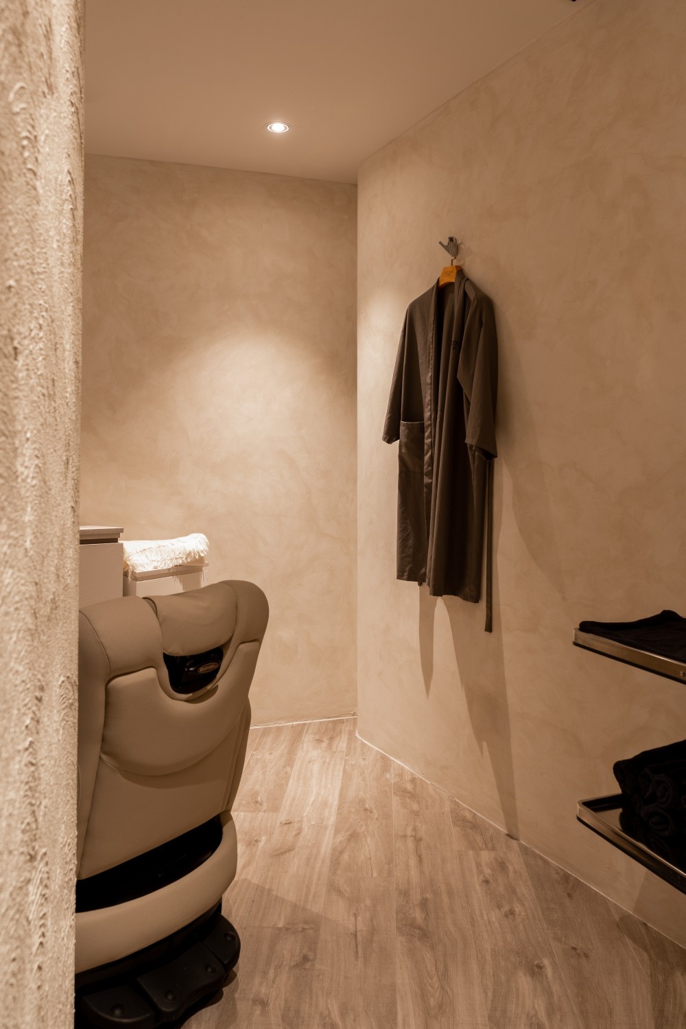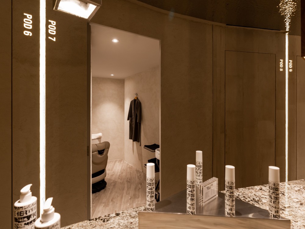 在新加坡繁华的商区里,藏着一间特别的美发沙龙店和按摩店设计。它没有传统美发店的嘈杂拥挤,而是用通透的空间、柔和的光影和自然的材质,让 “做头发” 成了一场治愈身心的体验。走近沙龙,大面积的超白钢化玻璃幕墙最先抓人眼球,通透得像没设屏障,路过的人能隐约看到里面柔和的灯光和点缀的绿植,忍不住想进去瞧瞧。玻璃上就简单用金属字标着品牌名,不花哨却很醒目。脚下的浅灰色水磨石地板,和室外街道的地砖自然衔接,门口那盆琴叶榕,既给室内留了些隐私,又把户外的自然气息带了进来,让人刚踏进沙龙,就像走进了个舒服的小角落。