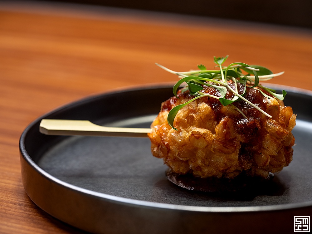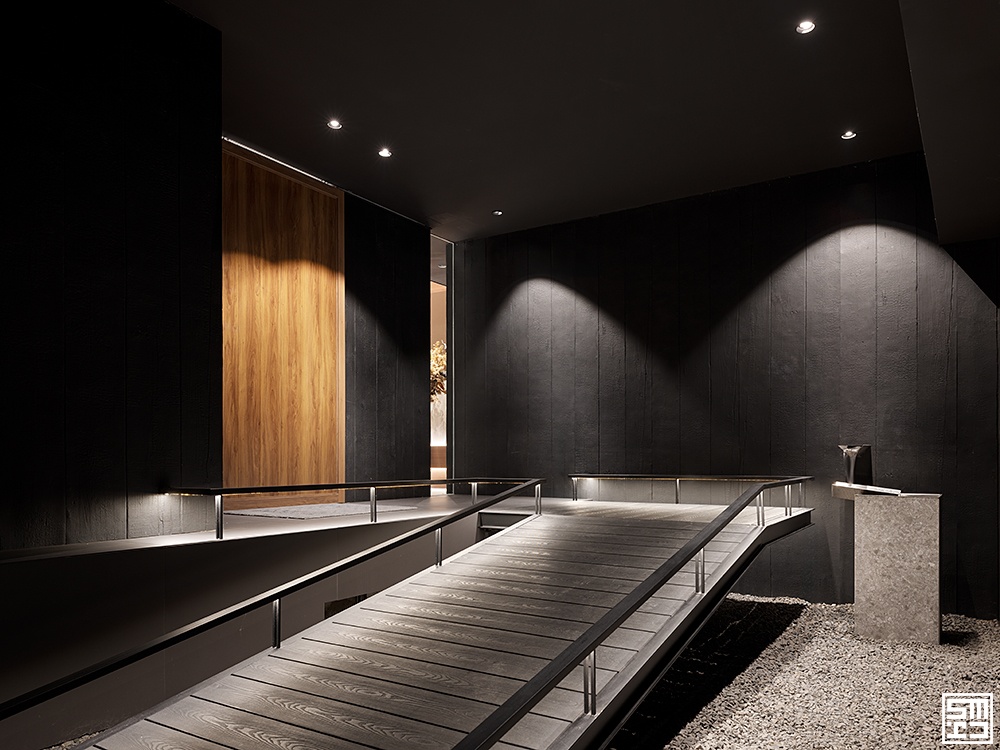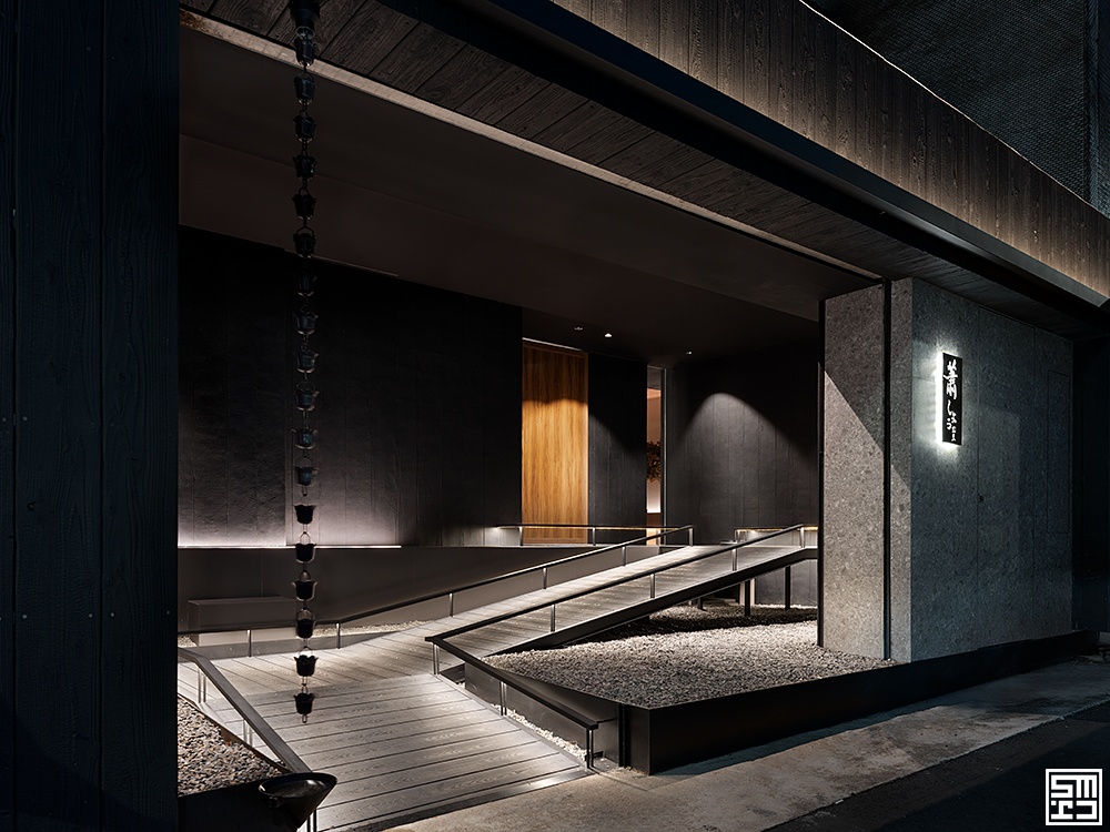 缓升的坡道如日本神社的参道,将城市的喧嚣逐步隔绝在外。木质坡道与砾石景观的组合,在灯光的勾勒下形成 “刚与柔” 的材质对话 —— 砾石的冷冽粗糙呼应日式枯山水的空灵,木质坡道的温润则传递出 “归家般” 的亲切,让食客在行走间完成 “从世俗到食境” 的心境转换。入口悬挂的金属雨链是 “五感设计” 的点睛之笔。雨水落下时,雨链会发出清脆且有节奏的声响,如日式茶道的水音,为空间注入 “听觉禅意”;即便无雨,其黑色金属的冷冽质感与灯光下的光影变化,也成为入口的视觉焦点,让 “等待” 也成为一种仪式。