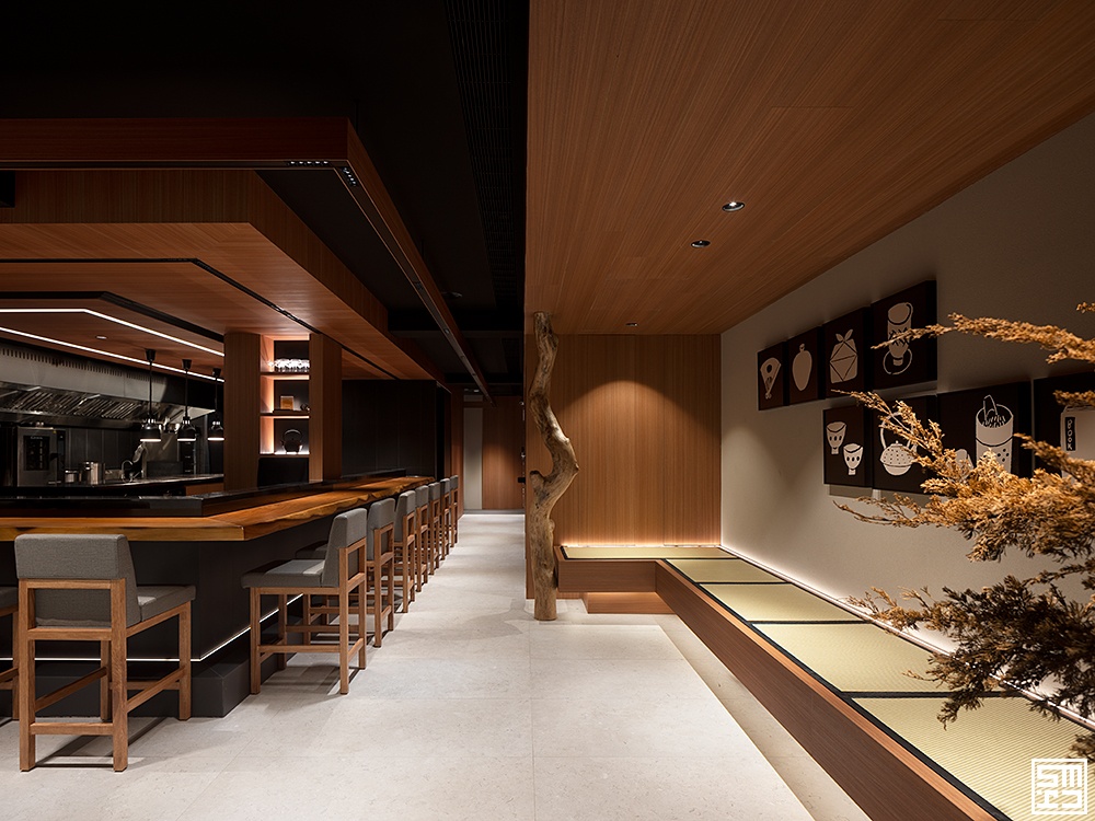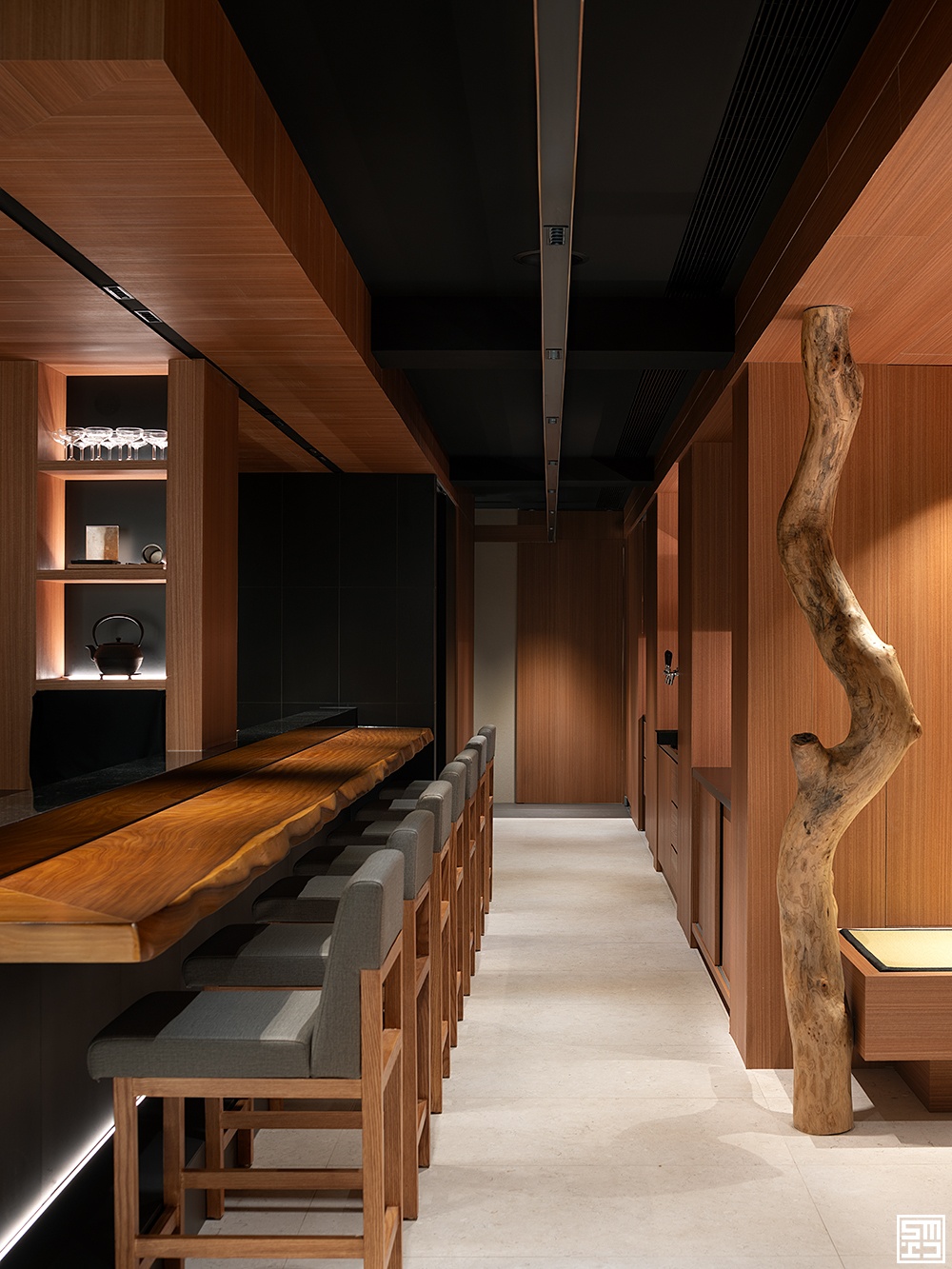 嵌入式灯光沿坡道边缘铺设,形成 “光的路径”。光线的明暗变化如同呼吸,既引导食客的行进方向,又在视觉上强化了坡道的纵深感,让 “缓升” 的过程充满 “探索未知” 的期待感,最终在入口木门处形成 “光的汇聚”,暗示着 “美食圣域” 的抵达。樱桃木、原木枝干等材质的大量运用,是日式 “木文化” 的当代表达。料理台的整根原木台面保留了天然的树边轮廓,其粗糙肌理与温润色泽形成强烈视觉反差,传递出 “食材本味” 的餐饮哲学;墙面与天花的樱桃木饰面则以简洁的几何造型呈现,摒弃繁复雕花,让木材的自然纹理成为 “静默的装饰”,呼应日式料理 “极简却极致” 的精神内核。