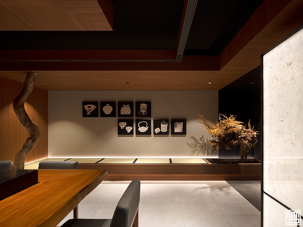 料理台上方的嵌入式灯光形成 “光的舞台”。光线以 “明暗渐变” 的方式聚焦于料理区域,让厨师的动作、食材的色泽成为视觉中心,如同剧场的追光,将 “料理过程” 升华为 “美食表演”,让食客在品尝前先享受 “视觉盛宴”。公共区域的灯光设计极具 “叙事性”。木质枝干旁的灯光以 “点光源” 呈现,形成 “光影斑驳” 的自然效果,如同一束光透过树叶洒下;墙面的嵌入式灯光则以 “面光源” 营造氛围,让悬挂的干枝装置在光影中呈现出 “立体的禅意画卷”,让食客在行走间不断发现 “光影惊喜”。包间与休闲区的灯光设计更趋柔和。暖光从木质天花的缝隙中溢出,形成 “光影留白”,既保障了私密性,又让空间充满 “侘寂式的松弛感”。例如墙面的日式器物装饰画,在灯光的映衬下,其黑白线条更加鲜明,传递出 “饮食文化” 的历史厚重感。