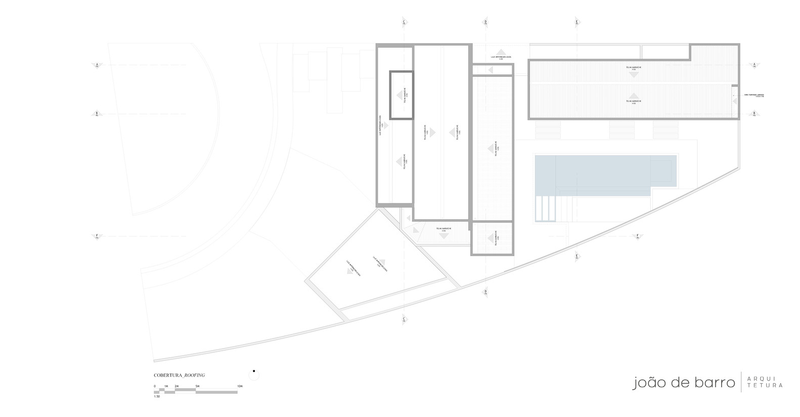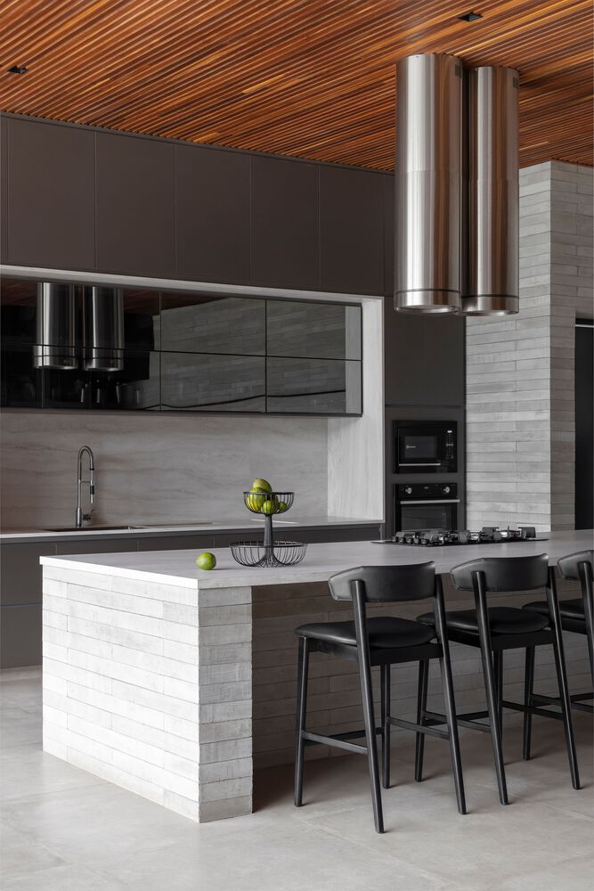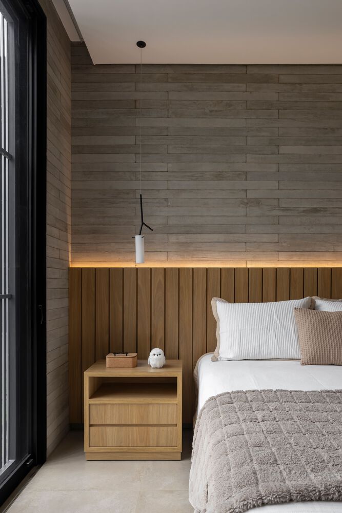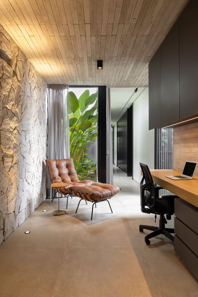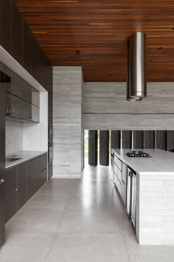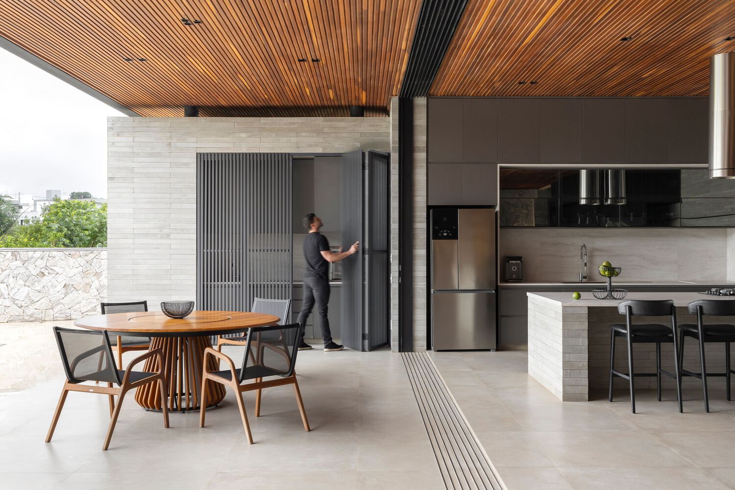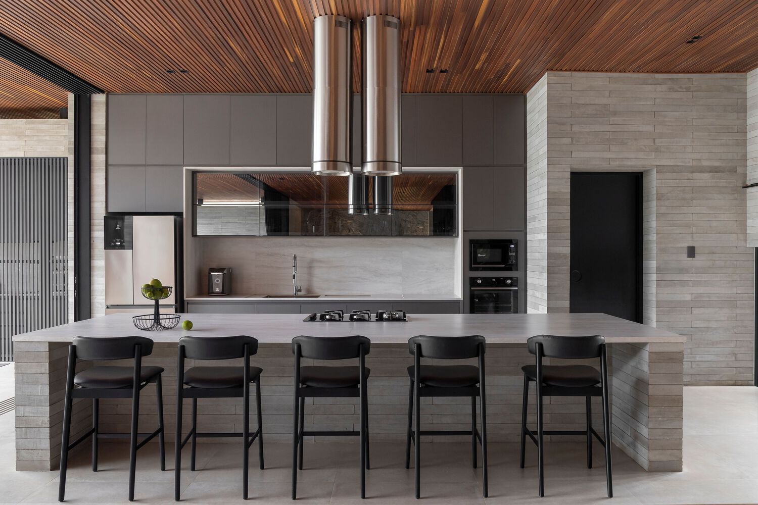 这座一层别墅设计位于米纳斯吉拉斯州内陆的一个封闭式小区内,是当代建筑中寻求乡村风格与极简主义相融合的典范。该项目以其高档天然的材料选择而引人注目。建筑外立面和客厅采用了经日本烧杉板(Shou Sugi Ban)工艺处理的碳化木材,这种工艺赋予材料独特的美学质感和耐用性。住宅外墙覆盖着天然混凝土板,而香二翅豆木(cumaru)制成的条形天花板则延伸至整个社交区域和主浴室,增添了温暖与精致感。