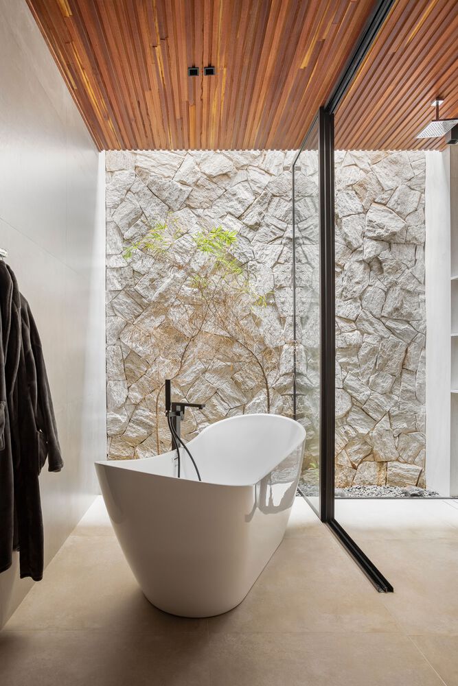 空间之间的连接是该项目的一大亮点。用于分隔卧室区域的铝制 “虾形” 活动隔断和门系统,在社交区域与私人区域之间营造出流畅的过渡。卧室、书房等更为私密的空间保持了一致的美学风格,石墙与木元素相互搭配,间接照明则突出了细节之处。浴室堪称舒适的休憩之所,配备沉浸式浴缸,温馨的设计带来如同水疗般的体验。