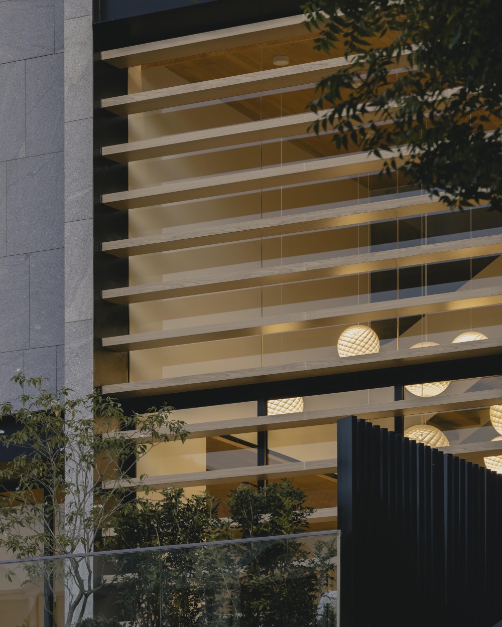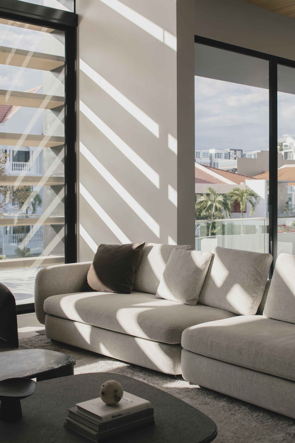 立面上的规则横梁,像给高窗 “装了个滤镜”。它们精心塑造和过滤自然光,让光线不是直接 “砸” 进室内,而是形成 “动态阴影”,投射在家具上。早上、中午、傍晚,阴影的形状和位置都不一样,就像空间里有个 “流动的艺术装置”,时刻给人新鲜感。而且,为了隐私,半透明百叶窗可以拉下来,既不影响光线的柔和感,又能巧妙隐藏室内,晚上,室内的灯光透过百叶,从里面发出温暖的光,建筑仿佛变成了 “发光的盒子”。