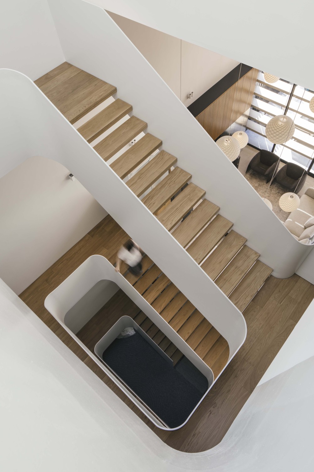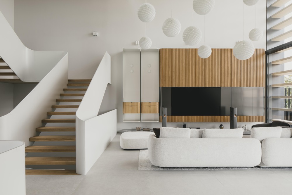 客厅旁的特色楼梯,是 “连接与互动” 的关键。它不仅是从一楼到二楼的通道,更让楼上的人能 “俯瞰客厅”—— 家人在二楼走动时,能看到楼下的动态,孩子在客厅玩耍,楼上的父母也能随时关注;同时,楼梯的设计本身也很有看点,辐射状的白色栏杆搭配浅色木踏板,阳光透过天窗洒下来,楼梯像是被 “镀了层光”,行走其中,仿佛在 “光的阶梯” 上漫步,每一步都充满了轻盈感。