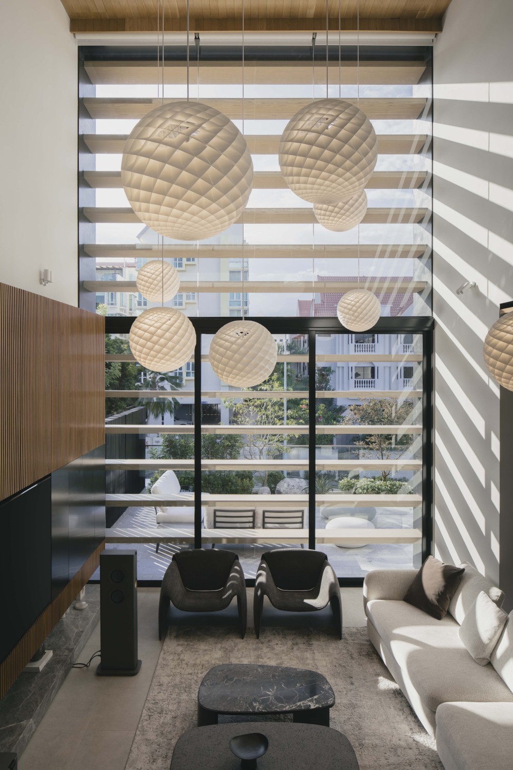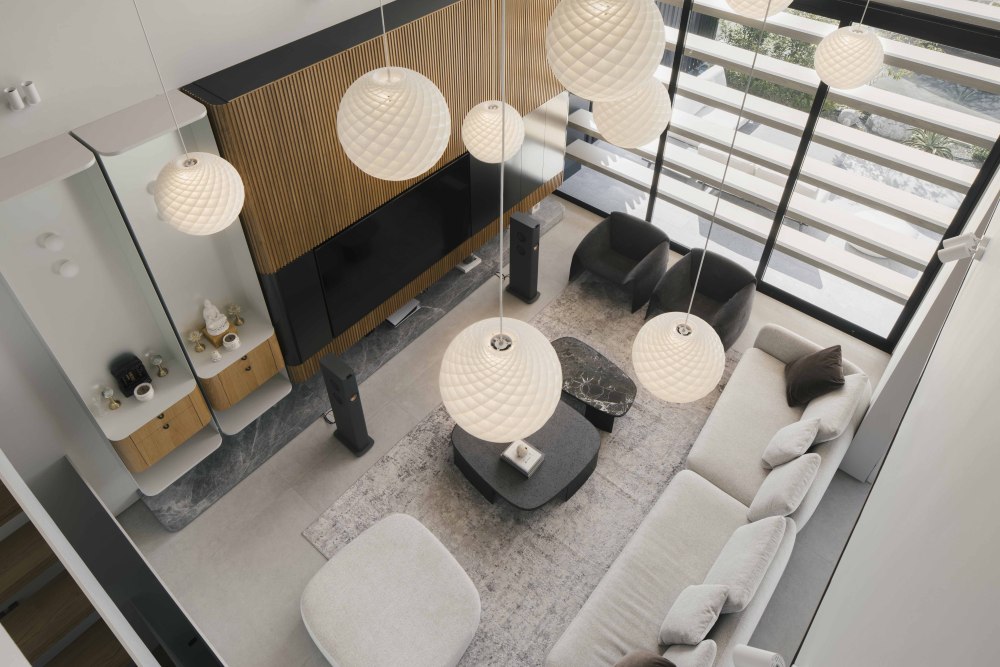 客厅拥有 “夸张的高度”,搭配立面上同样高挑的窗户,阳光能毫无阻碍地涌入,让整个空间亮堂堂的,却不刺眼。多盏吊灯悬于空中,与高窗共同营造出 “开阔又有仪式感” 的氛围:白天,自然光透过窗户洒在家具上,光影随着太阳移动而变化;夜晚,吊灯亮起,暖黄的光线包裹着空间,温馨感拉满。无论是家人围坐聊天,还是招待朋友,这样的客厅都能 hold 住场面,既显大气,又不失家的温度。