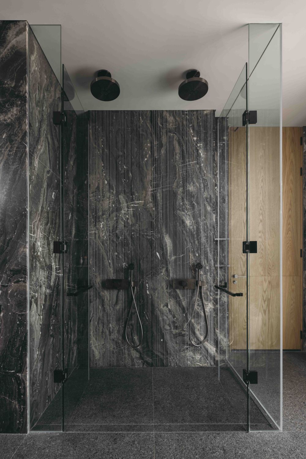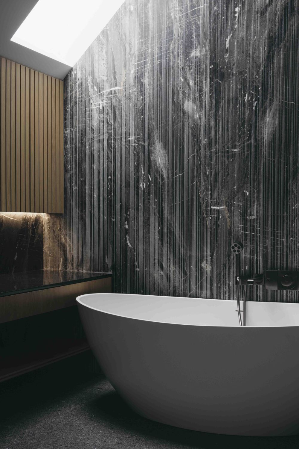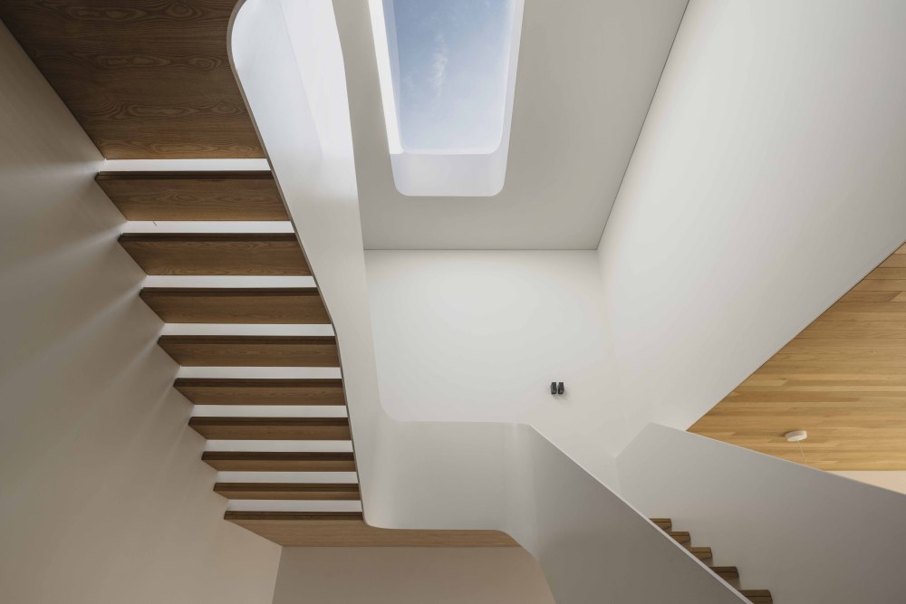 特色楼梯上方的天窗,是 “光的漏斗”,把光线引入,顺着楼梯的开放式踏板倾泻而下,让楼梯始终被光笼罩;主浴室的天窗,直接开在浴缸上方,光线洒在锯齿状的石墙上,投射出辐射状的图案,泡在浴缸里,看着石墙上的光影变化,仿佛在 “自然的光影浴场” 里放松,一天的疲惫都被冲刷掉了。