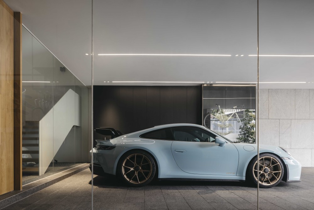 汽车门廊被深深嵌入建筑结构,形成一个宽敞的 “汽车展示区”—— 对于爱车的家庭来说,这简直是 “梦中情位”。车停在这里,不再是 “随便一放”,而是像展品一样被妥善安置,家人进出时,能自然欣赏到爱车的美,连停车这件事,都变得有仪式感。