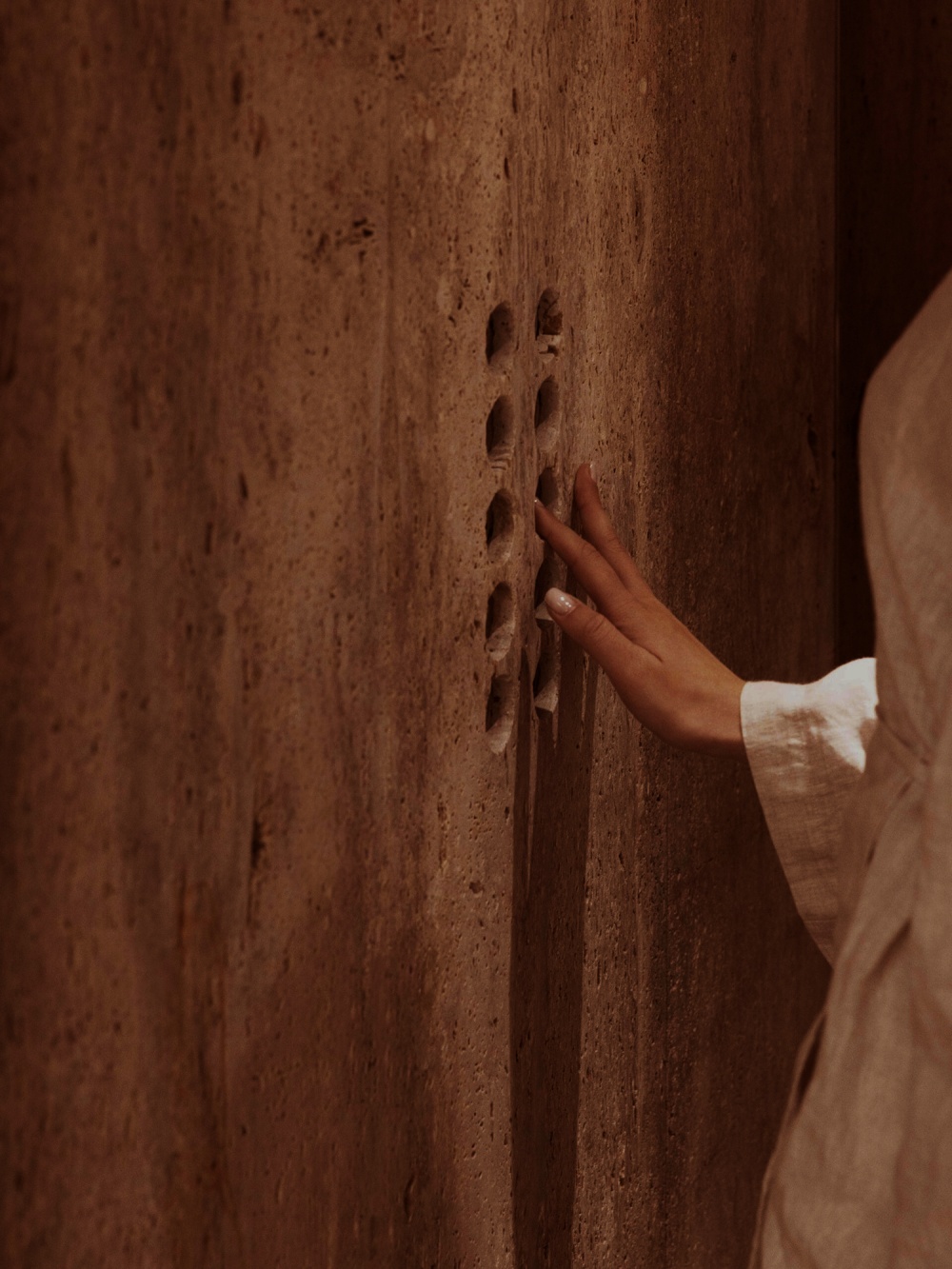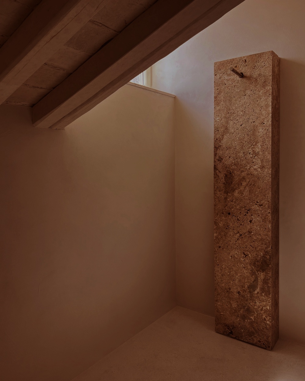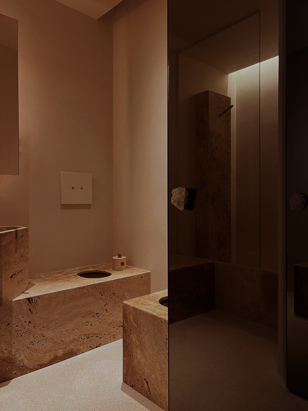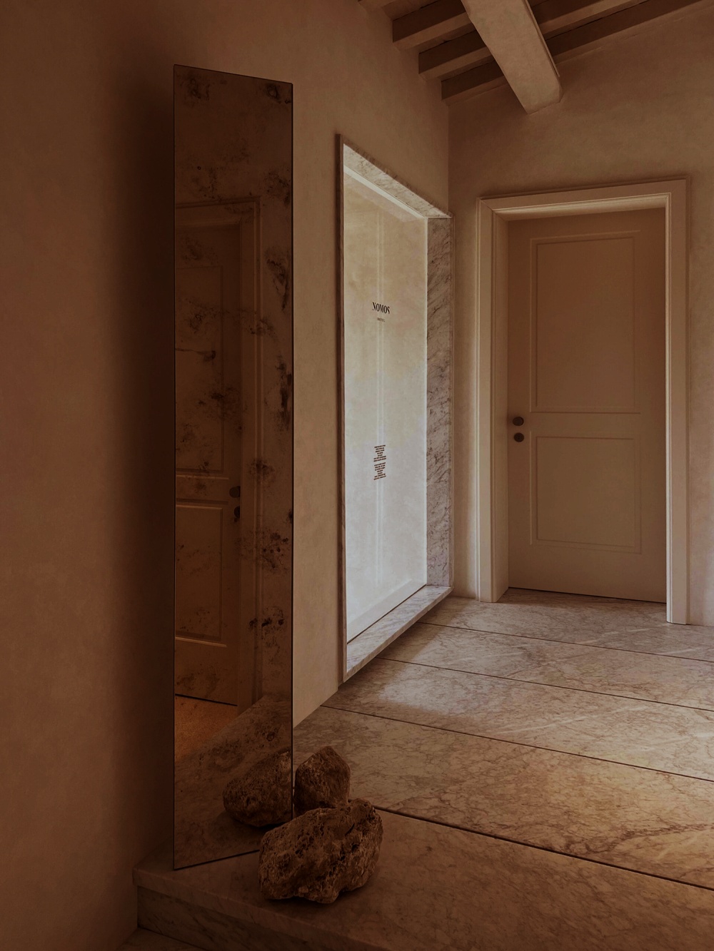 作为罗马建筑的 “基因材料”,石灰华在 NOMOS 酒店中被赋予了新的生命。其天然的纹理与浅米色调,既唤起人们对古罗马浴场、万神殿的历史记忆,又通过 STONE PLUS 涂层处理(增强色泽、防污抗紫外线)实现了现代功能的适配。在酒店公共区域,大块石灰华墙面如同一幅 “未完成的历史画卷”,粗糙肌理与光影的互动,让空间充满 “时间的厚重感”。