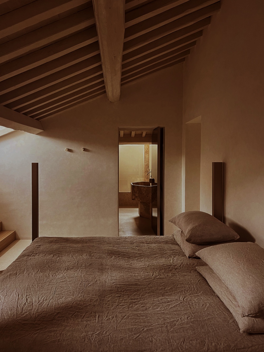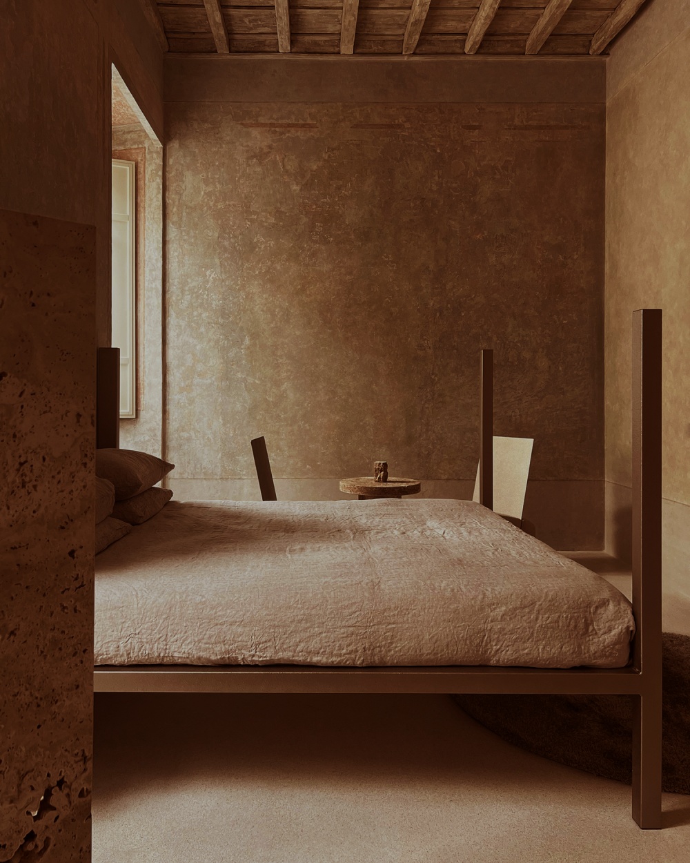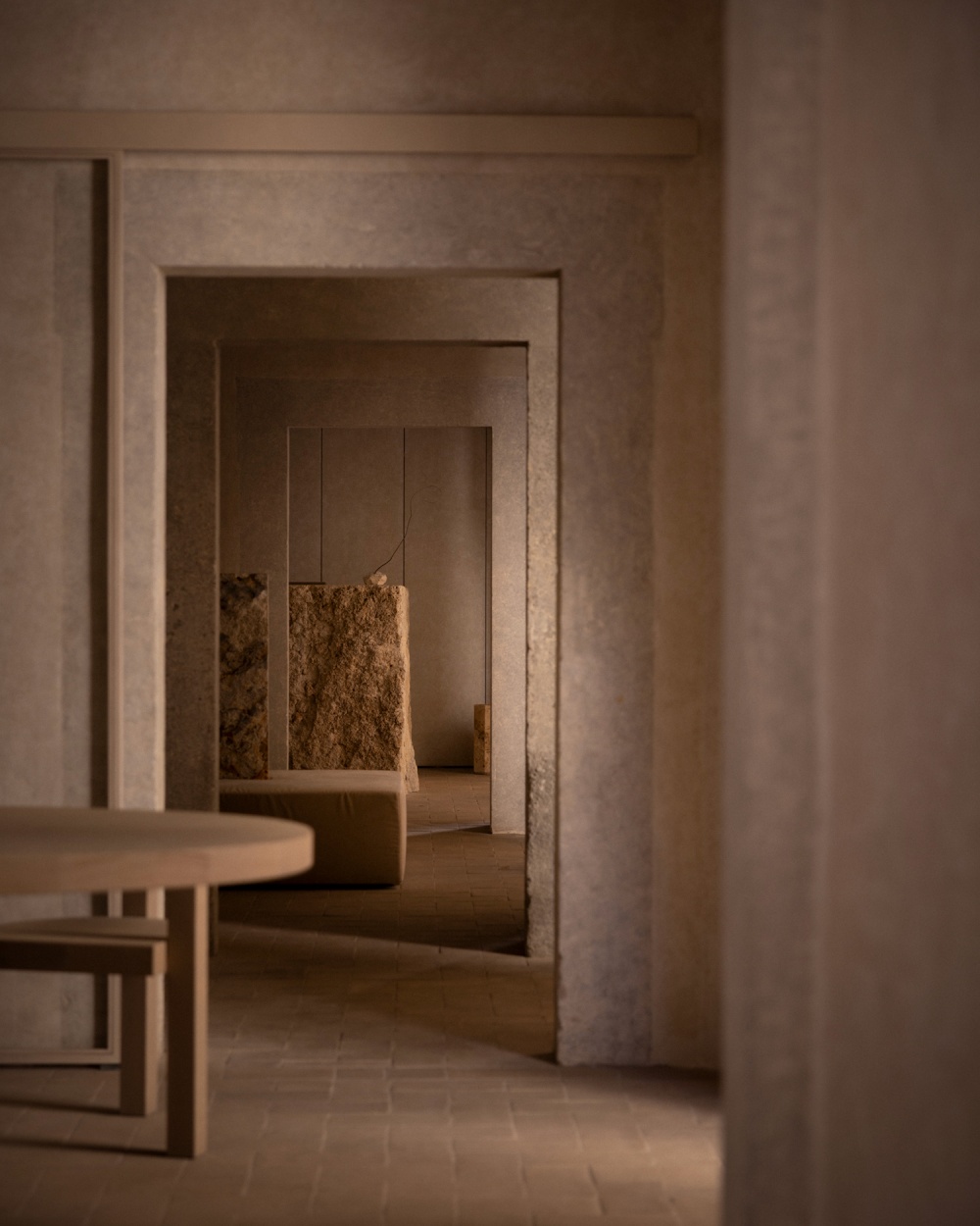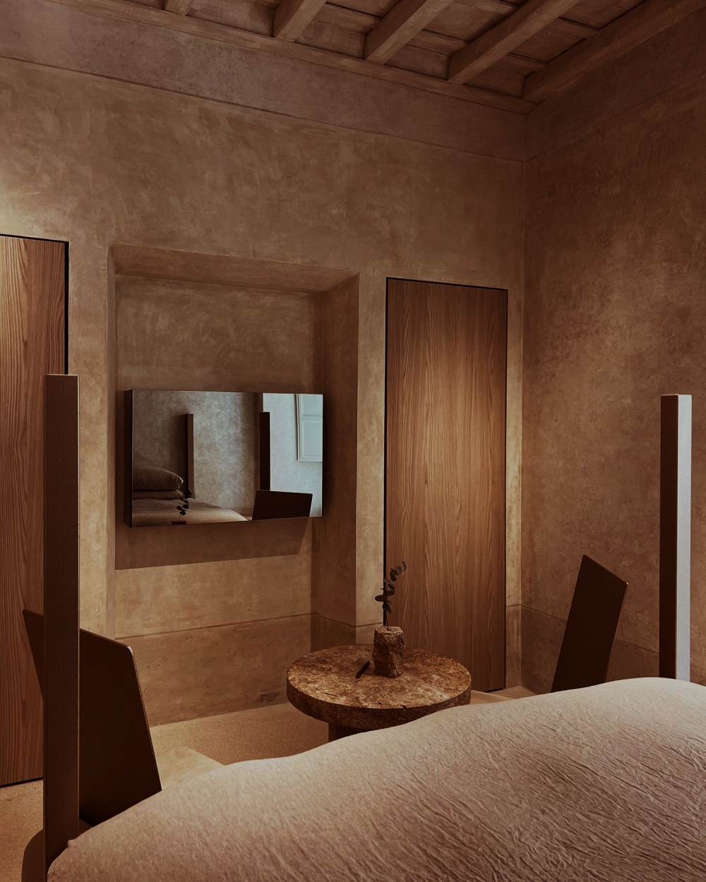 厚重的木质餐桌、简洁的书桌与天鹅绒坐垫的组合,以 “质朴与精致的对比” 传递设计哲学。木材的天然纹理与陶土、石灰华形成材质对话,例如餐厅的木质餐桌与陶土地板的搭配,既呼应了修道院的历史质感,又以现代极简的造型语言,让 “过去” 与 “现在” 在材质的碰撞中达成和谐。
