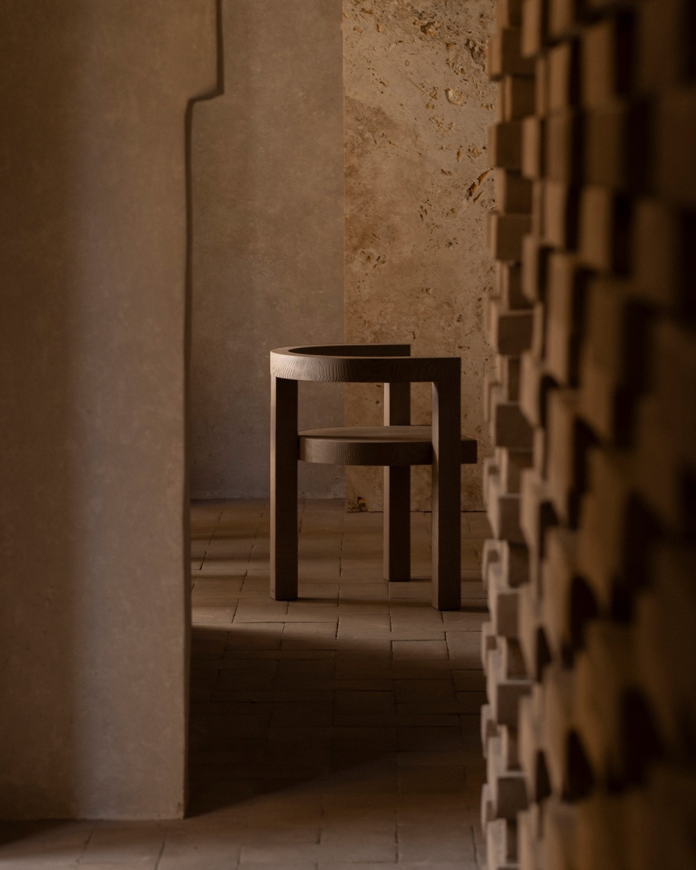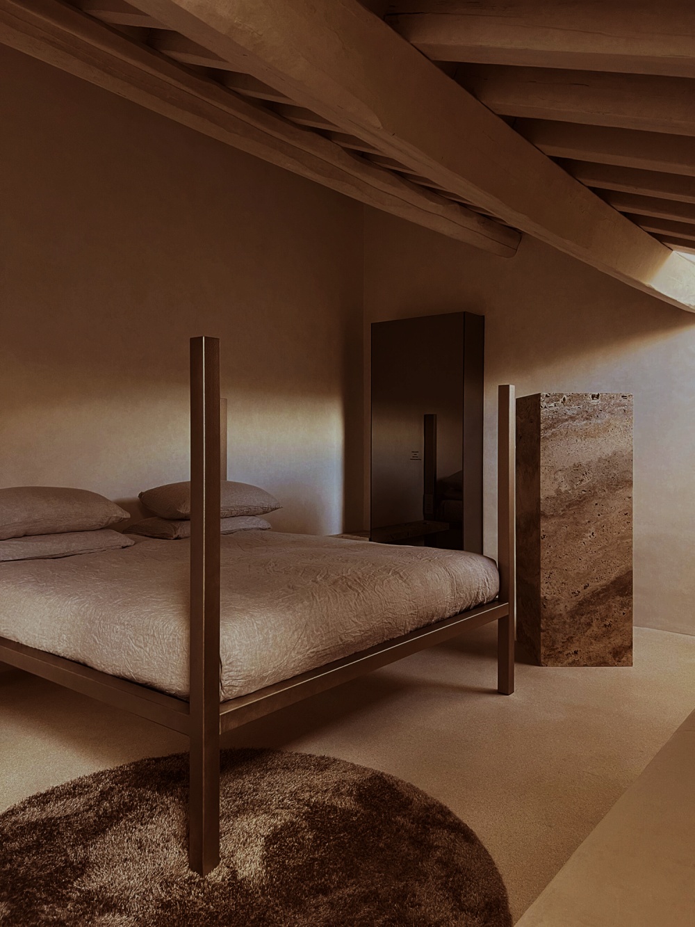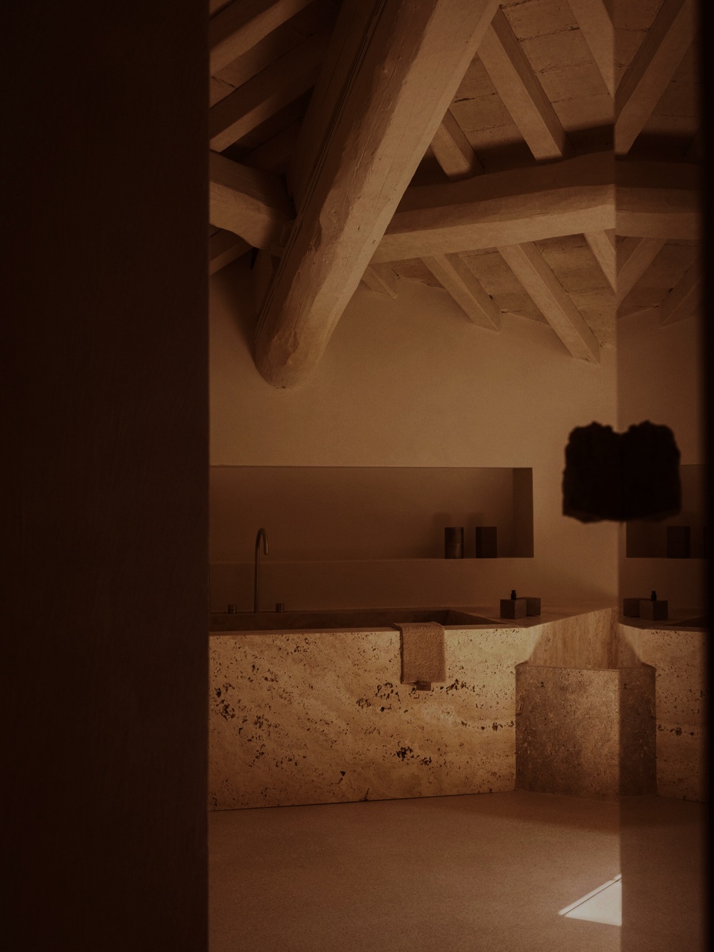 厚重的木质餐桌、简洁的书桌与天鹅绒坐垫的组合,以 “质朴与精致的对比” 传递设计哲学。木材的天然纹理与陶土、石灰华形成材质对话,例如餐厅的木质餐桌与陶土地板的搭配,既呼应了修道院的历史质感,又以现代极简的造型语言,让 “过去” 与 “现在” 在材质的碰撞中达成和谐。