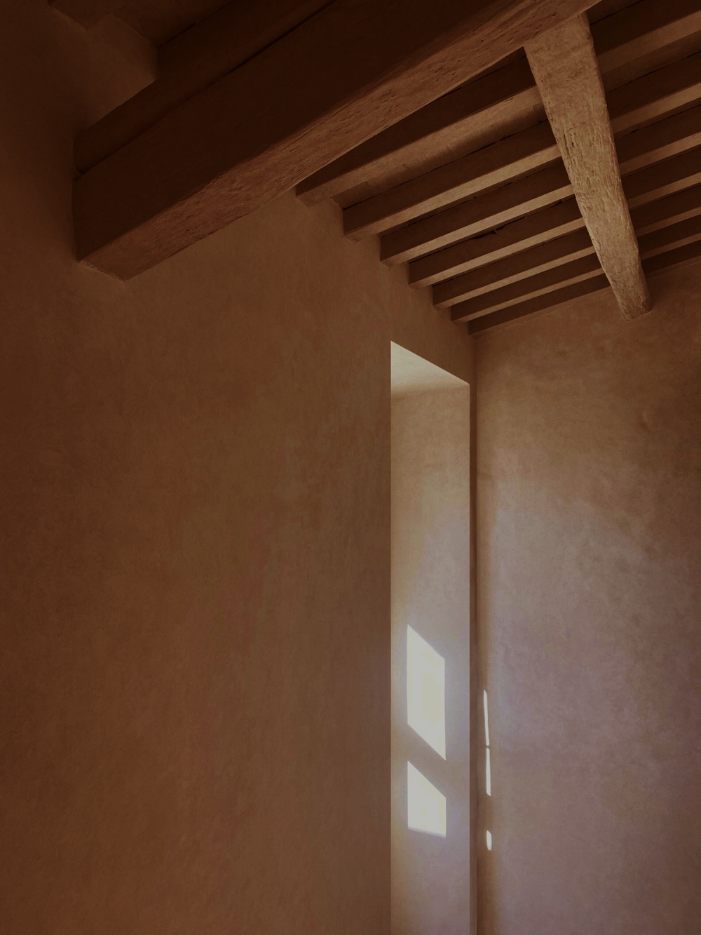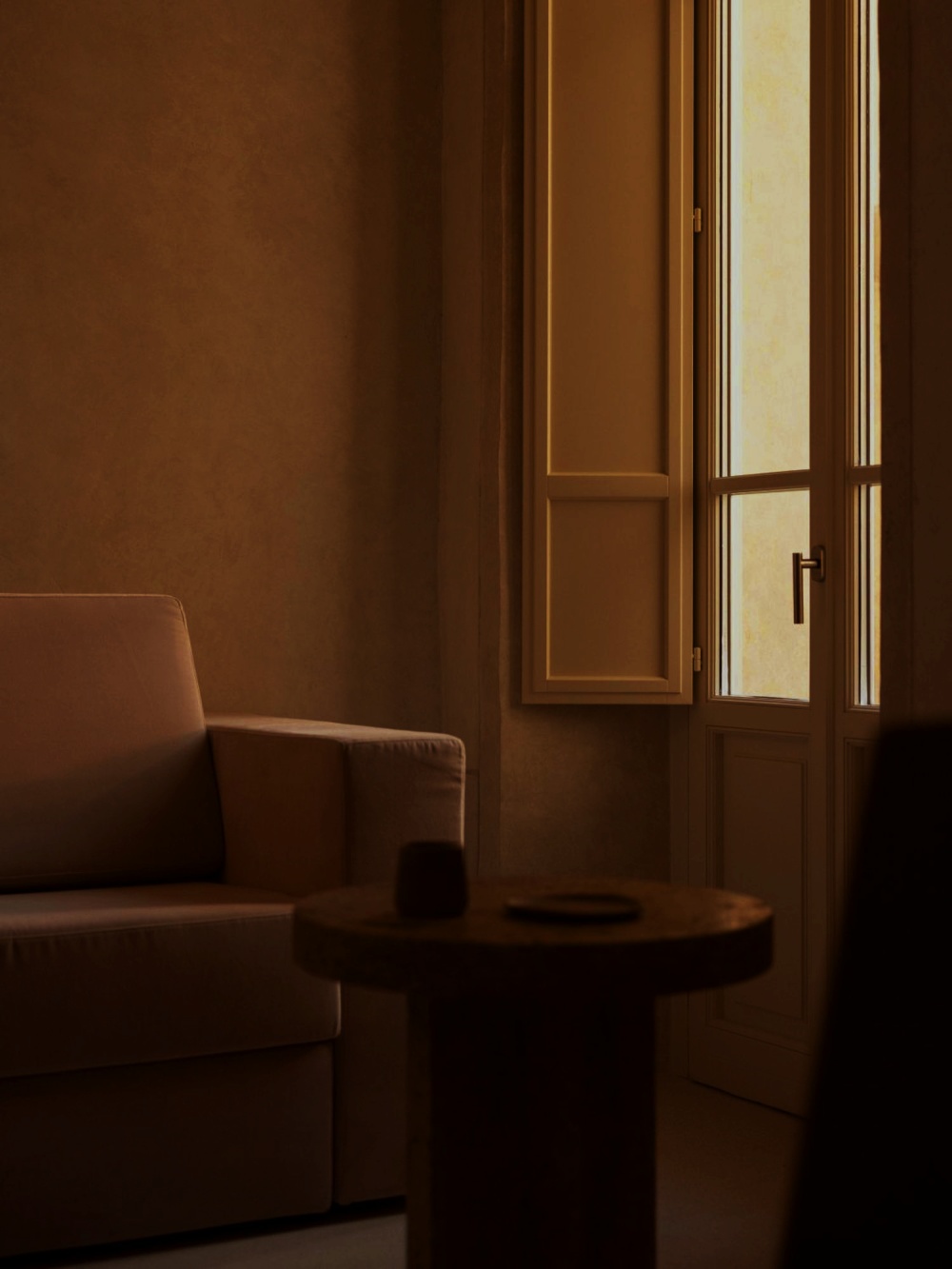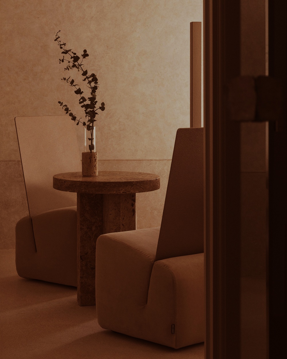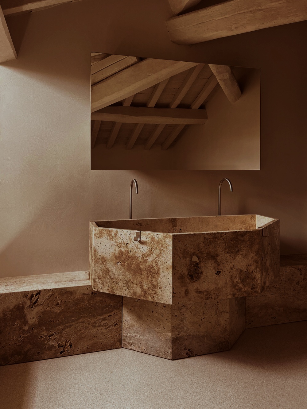 厚重的木质餐桌、简洁的书桌与天鹅绒坐垫的组合,以 “质朴与精致的对比” 传递设计哲学。木材的天然纹理与陶土、石灰华形成材质对话,例如餐厅的木质餐桌与陶土地板的搭配,既呼应了修道院的历史质感,又以现代极简的造型语言,让 “过去” 与 “现在” 在材质的碰撞中达成和谐。
