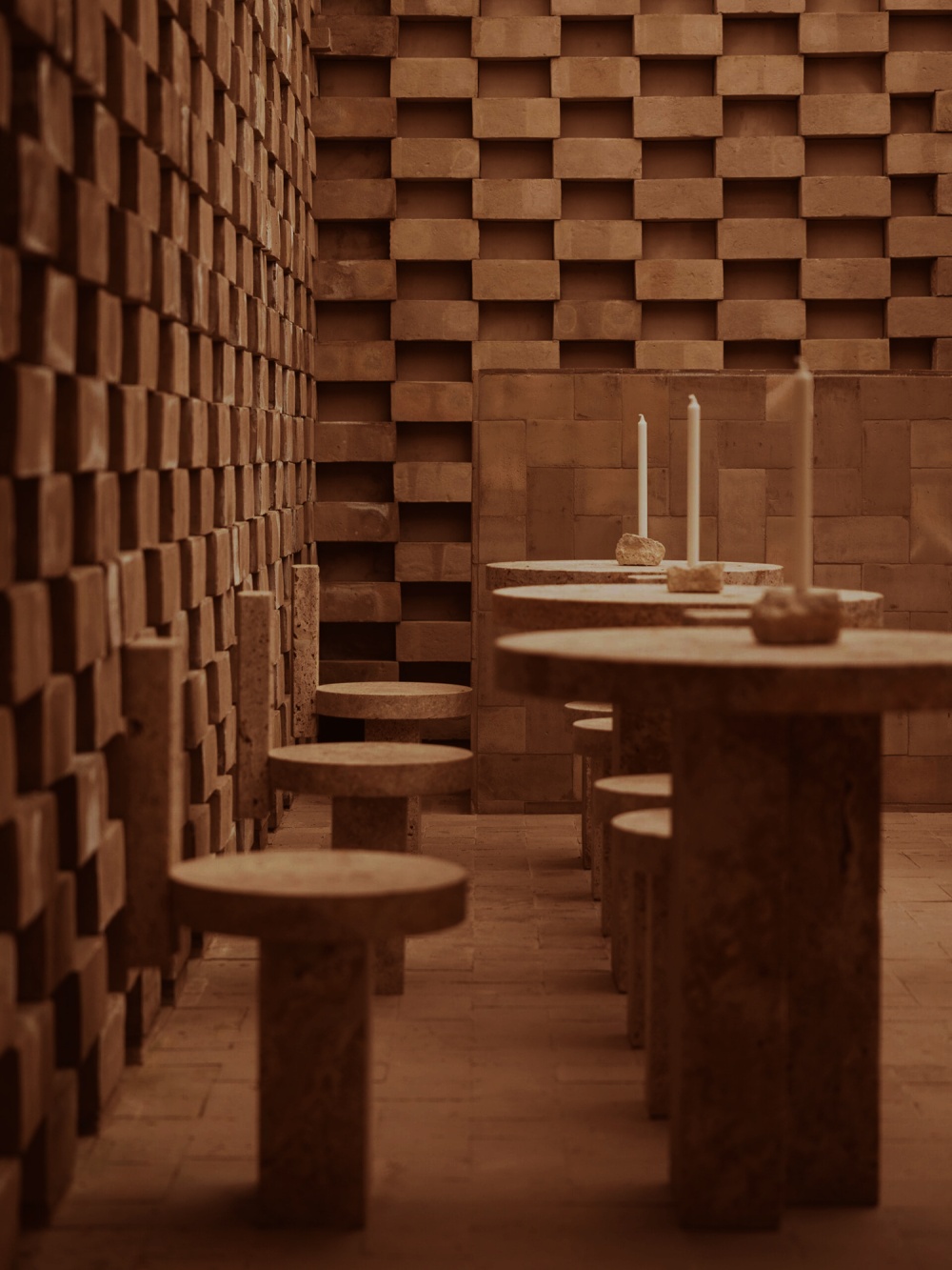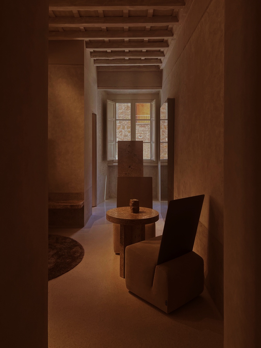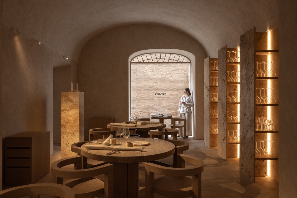 酒吧与庭院的设计,是 “材质诗学” 在社交场景的延伸。酒吧的 24 个座位围绕着 “从地面升起” 的桌子排列,几何底座的 “古代文物感” 与现代饮酒体验的结合,让 “社交” 也成为一种 “历史与当代的对话”;庭院的陶土元素与木质家具,在罗马的阳光下,为住客提供了一个 “在历史中放松” 的场所,让 “材质的诗意” 在人与人的互动中得以传递。
