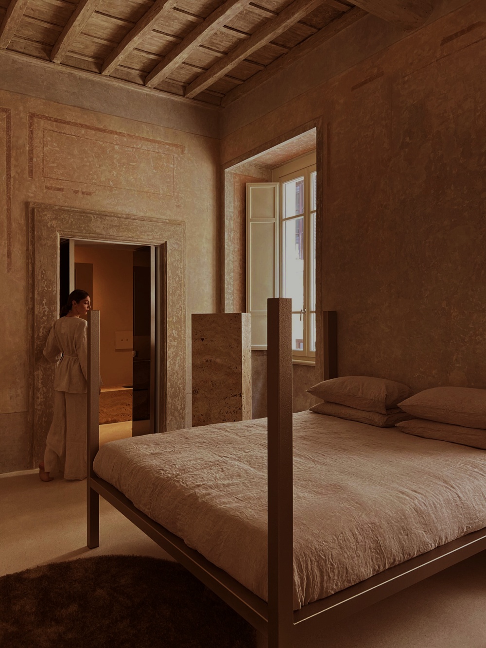 酒店套房以 “回归本质” 的设计逻辑,营造出远离罗马喧嚣的宁静港湾。粗织亚麻床品的触感、木材书桌的温度、石灰华墙面的肌理,共同构建出 “触觉、视觉、嗅觉(木材与石灰华的天然气息)” 的多维体验;套房中的艺术品(同时作为储物空间)则以 “残缺美” 的姿态,传递 Henry Timi 对 “不完美即真实” 的哲学思考,让住客在休憩中感受精神的松弛。