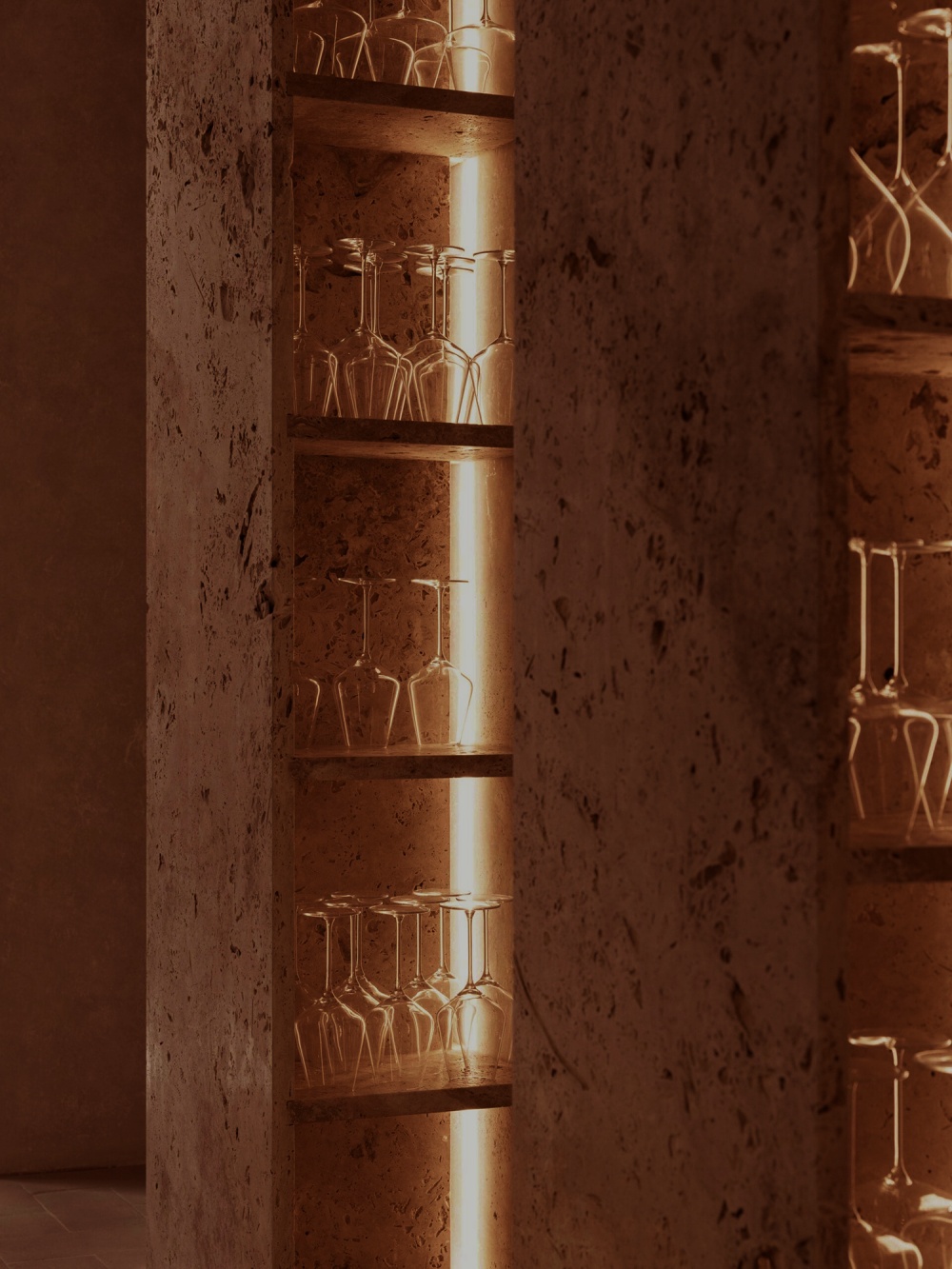 自然光透过修道院的高窗洒入,在石灰华墙面上形成斑驳的光影,如同 “上帝的笔触” 在空间中作画;人工光则以嵌入式灯带、极简吊灯的形式,强化空间的雕塑感。例如水疗区的灯光设计,仅以柔和的暖光勾勒出石灰华的肌理,让整个空间在静谧中透着神圣感,完美诠释了 “光与材料互动的视觉诗学”。