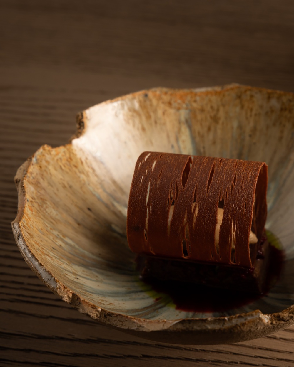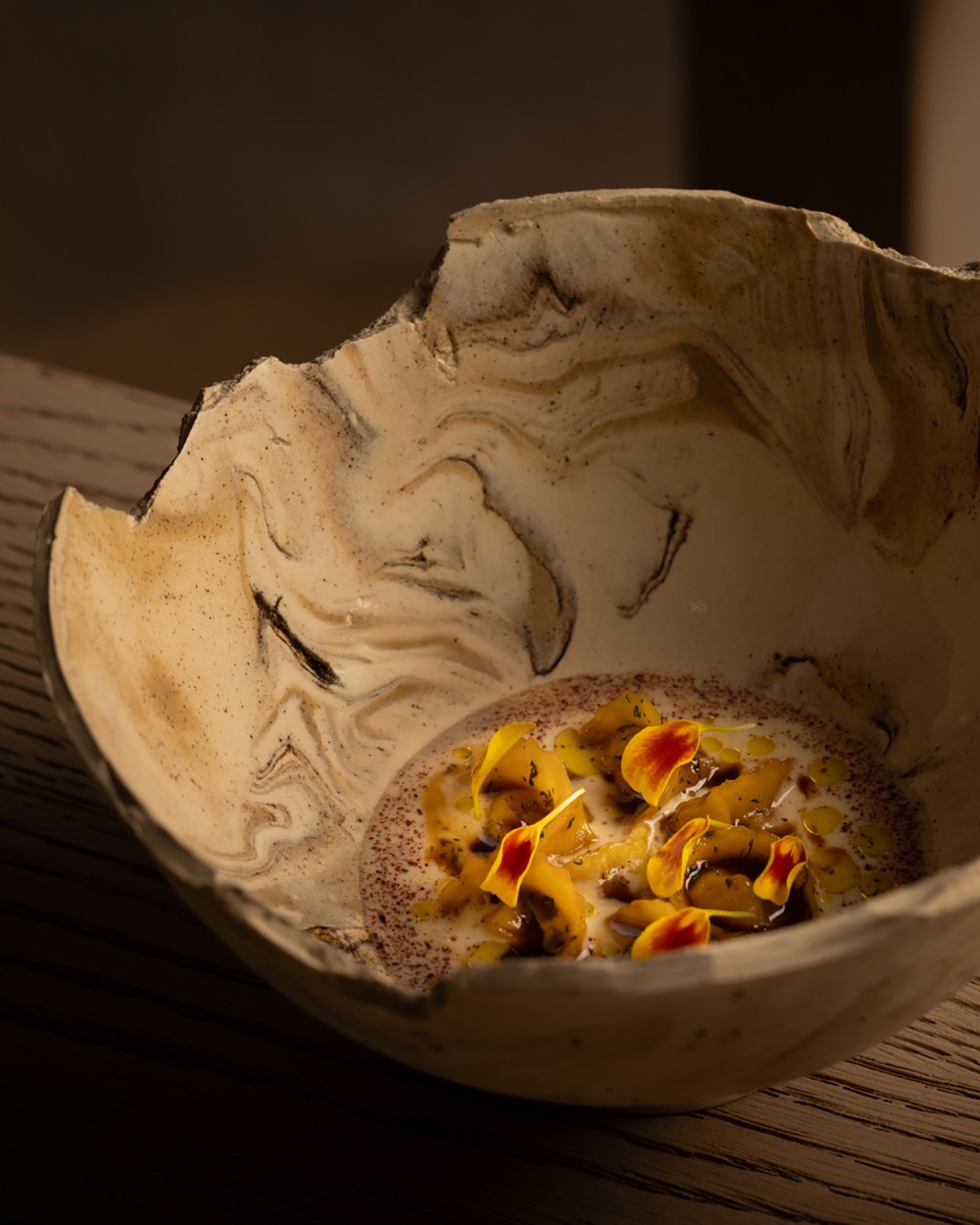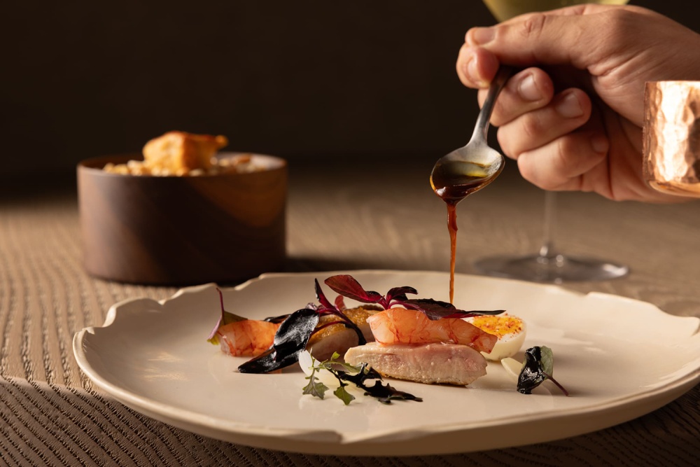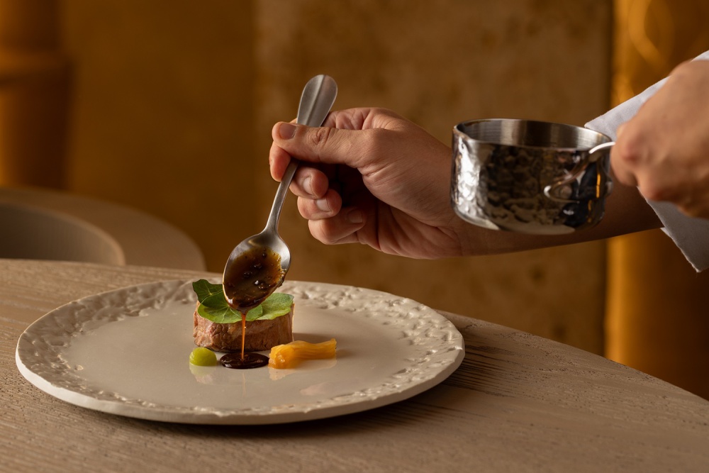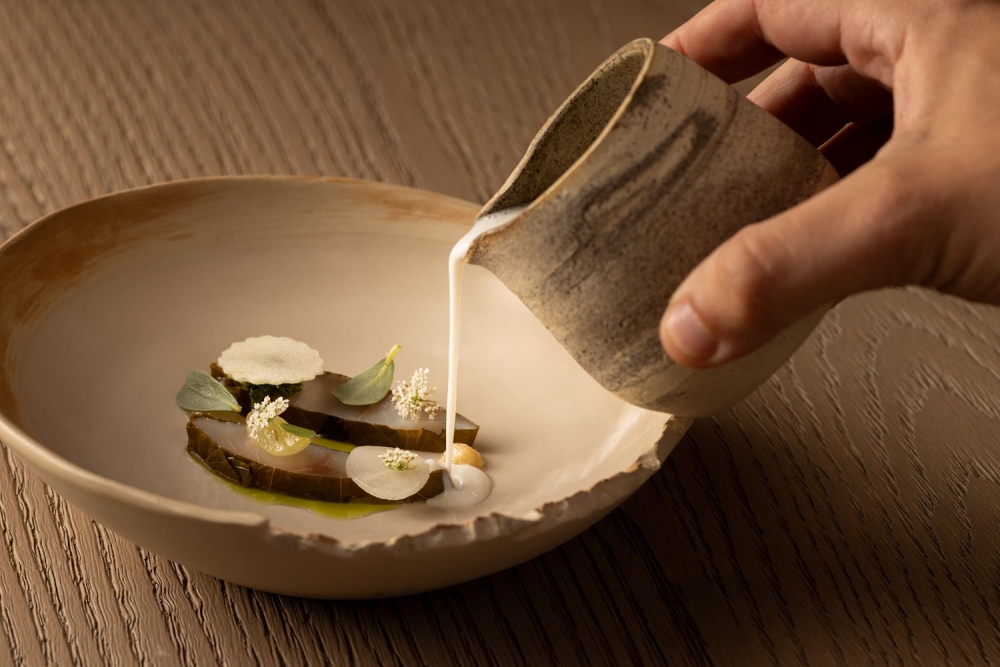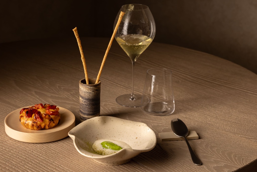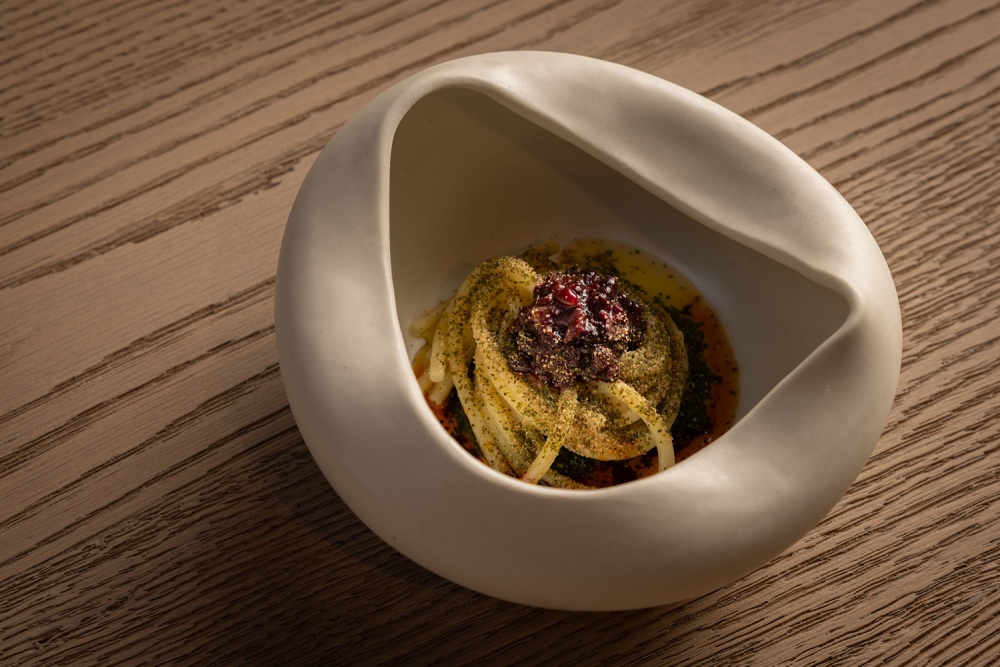 餐厅 Nomos Ante 的设计与主厨 Giulio Zoli 的料理理念一脉相承 —— 陶土色与大地色系的空间氛围,呼应着料理对意大利传统与国际元素的融合;手工陶土餐具与石灰华餐桌的搭配,让 “用餐” 成为 “材质与味觉的双重体验”。例如烟熏普罗沃拉奶酪柑橘意大利面,其色彩与质感恰与餐厅的陶土元素形成视觉呼应,让 “美食” 与 “空间” 在美学层面达成统一。